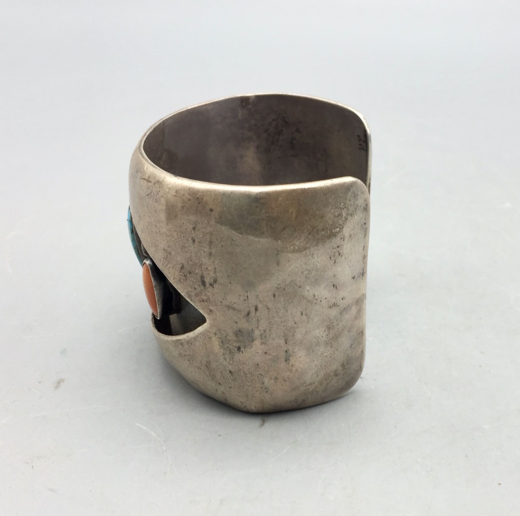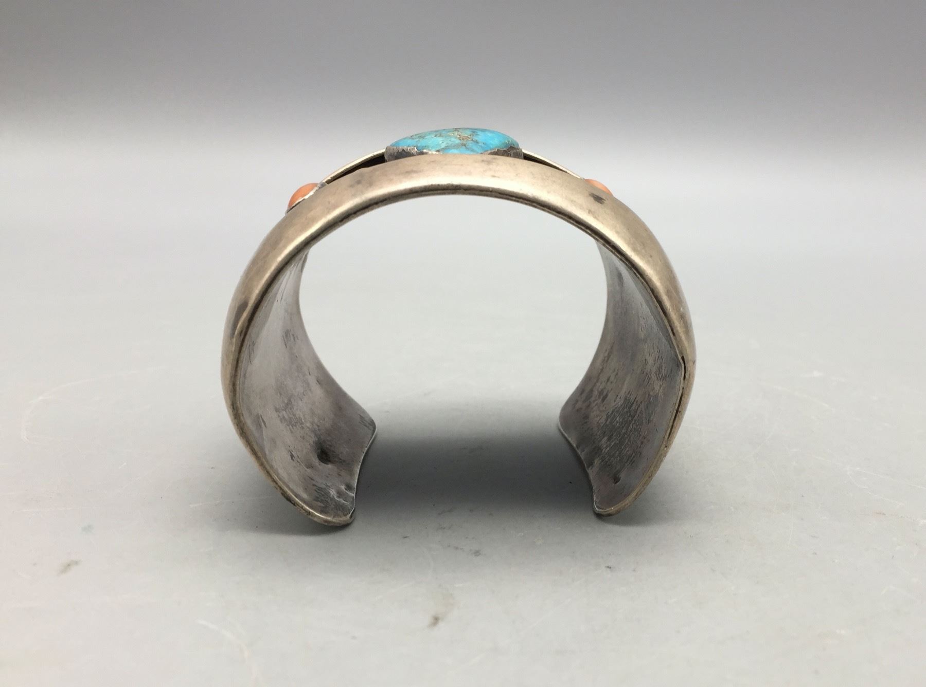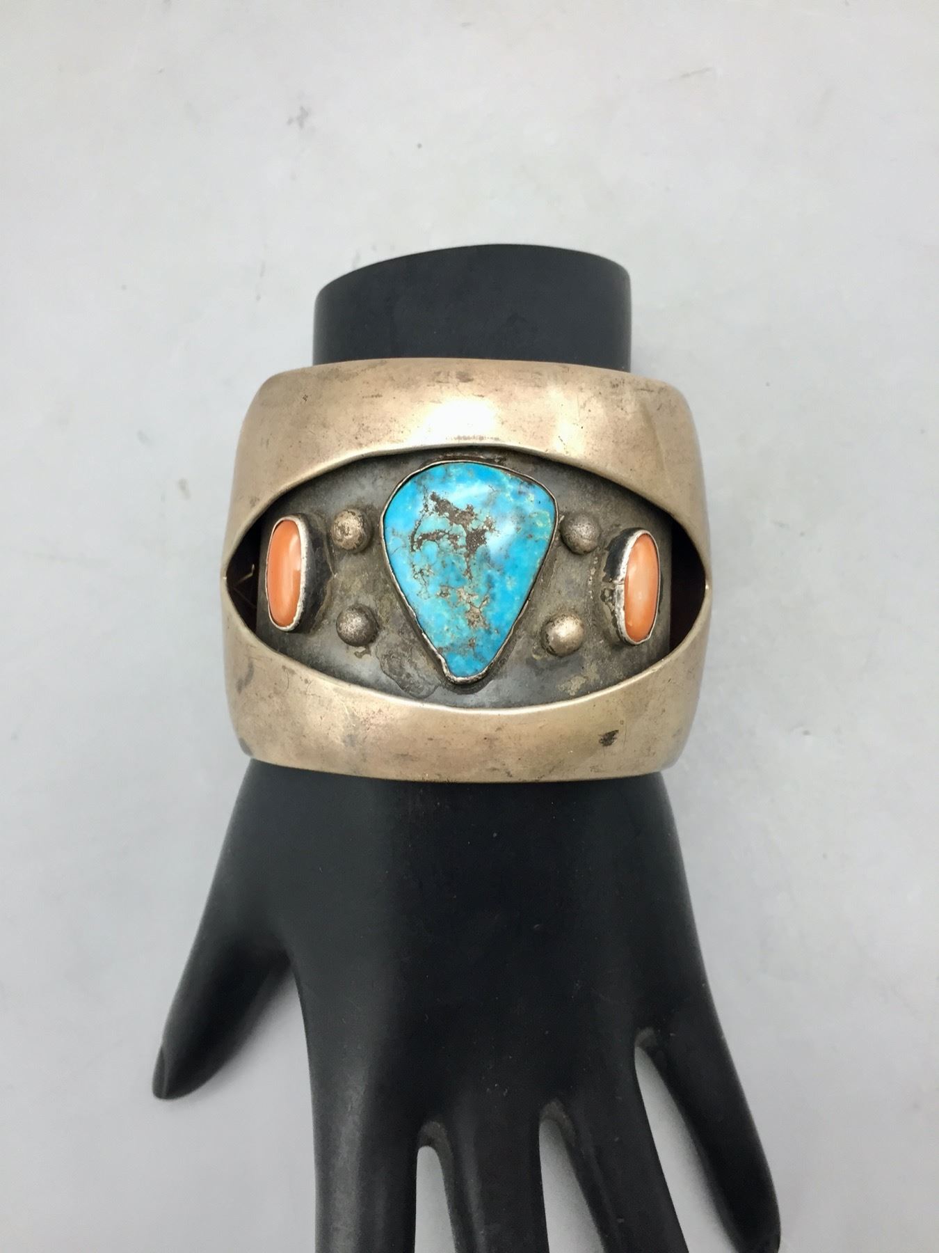 Description: For sale in this lot is a vintage turquoise and coral shadowbox style bracelet set with two coral and one turquoise cabochon in sterling silver. Maker: Unmarked. Approx. Age: Circa 1970s. Size: Inside circumference measures 5-1/4 inches. Opening is an additional 1-1/2 inches, fitting a 6-3/4 inch wrist. Width is 2 inches. Weighs 104.5 grams. Condition: Good for its age, normal wear expected. Please look closely at the pictures - they are an important part of our description. Shipping: There will be a $5 handling, packaging fee for shipping this lot. The actual cost of postage will be added on top of that.