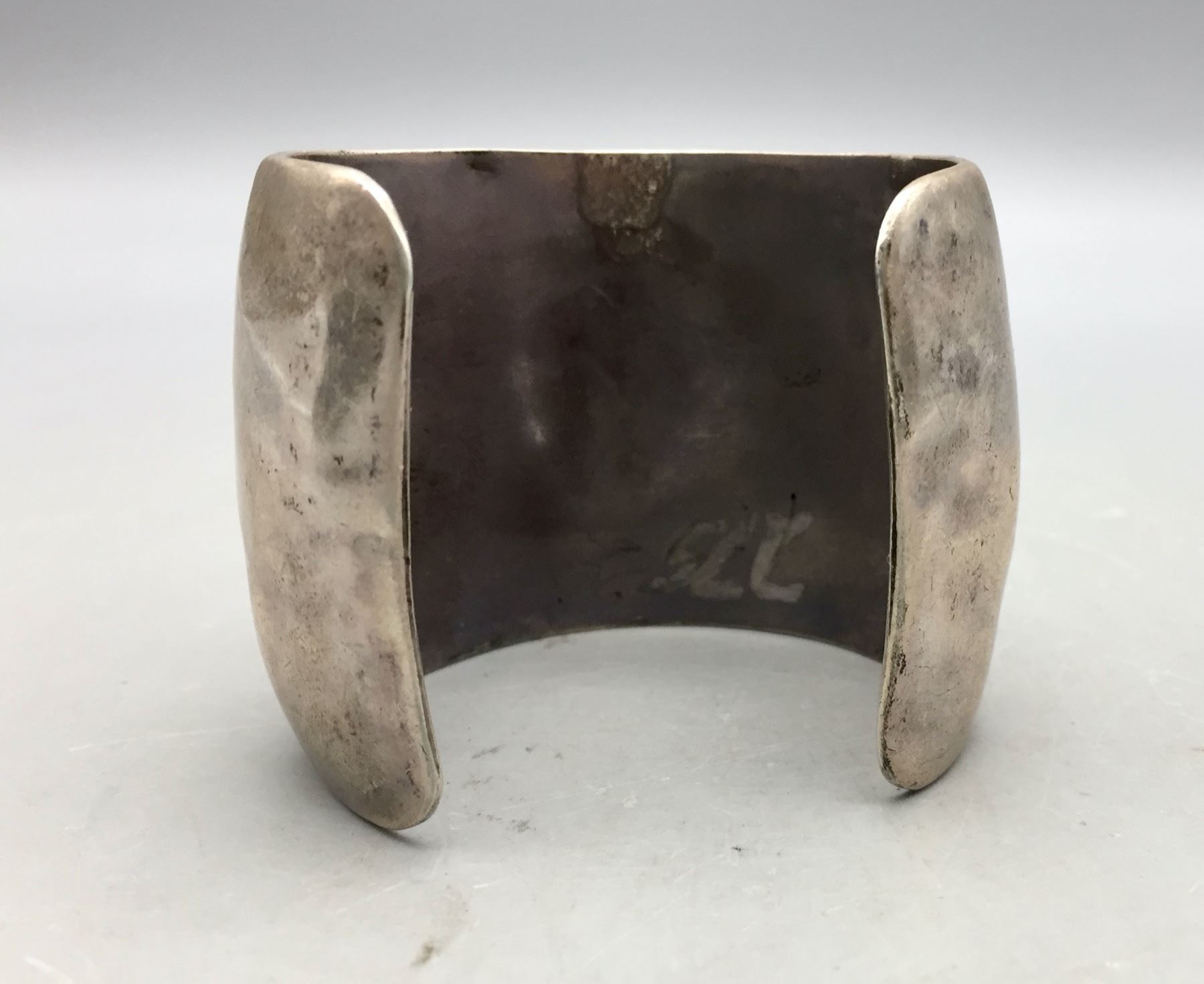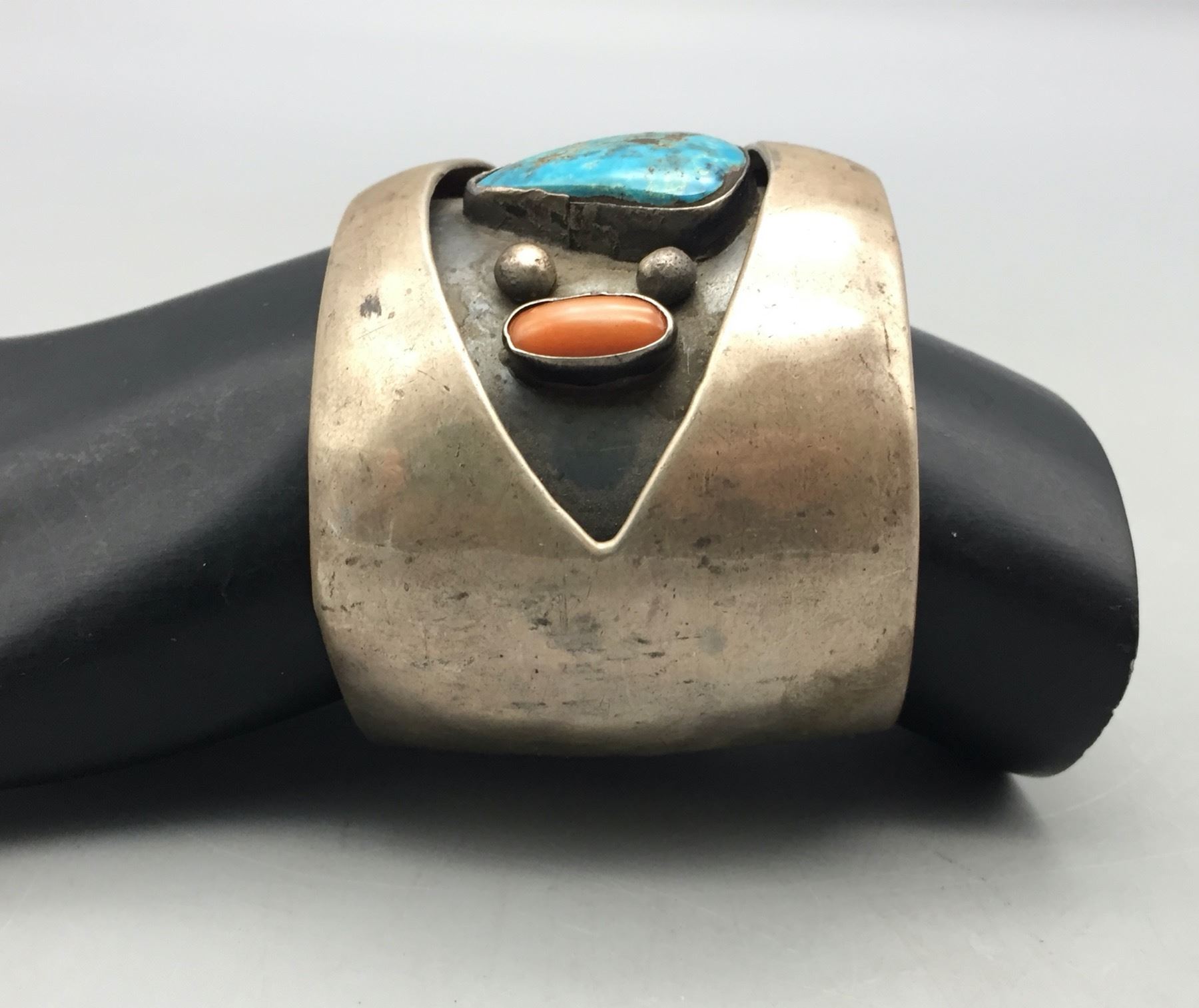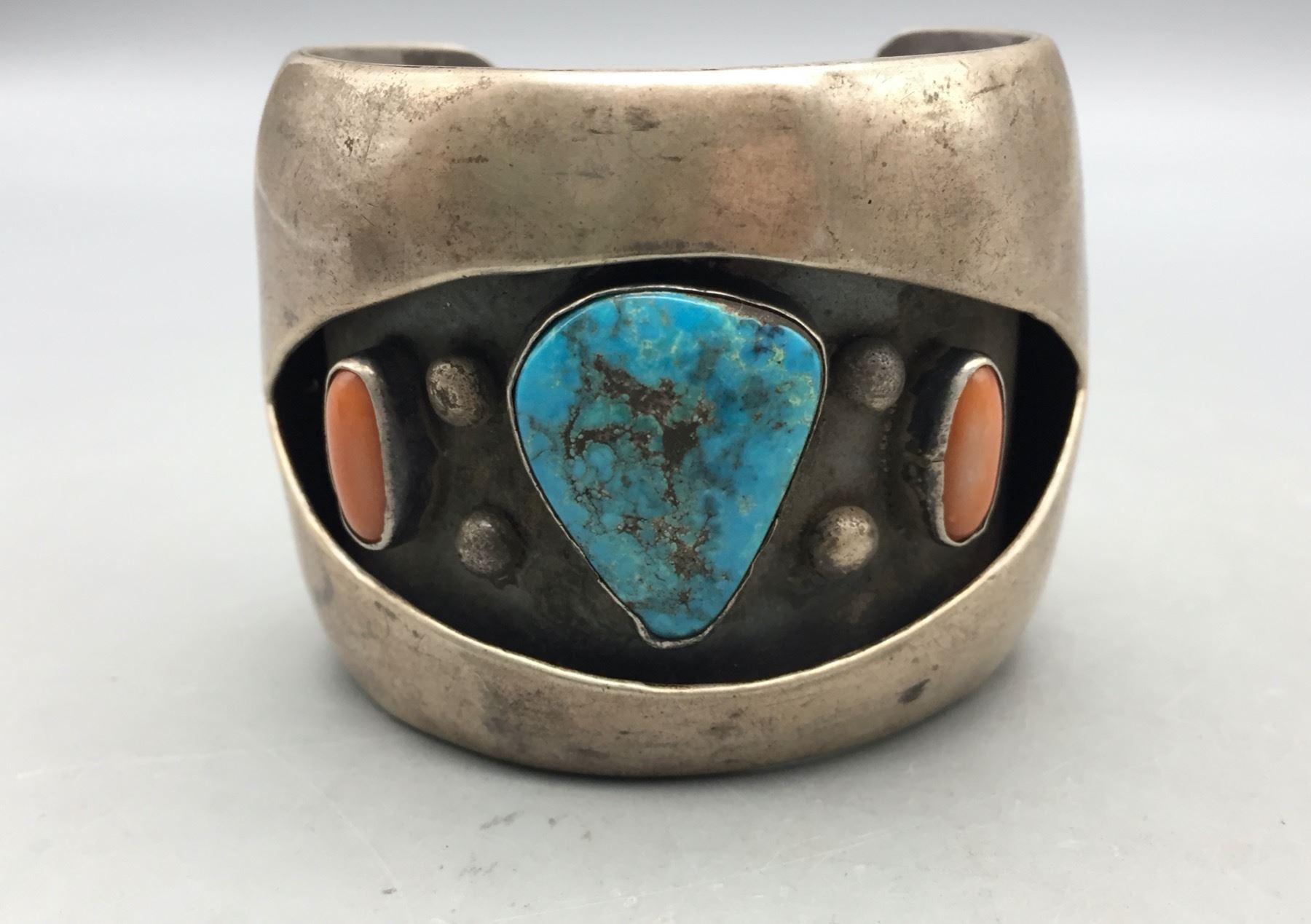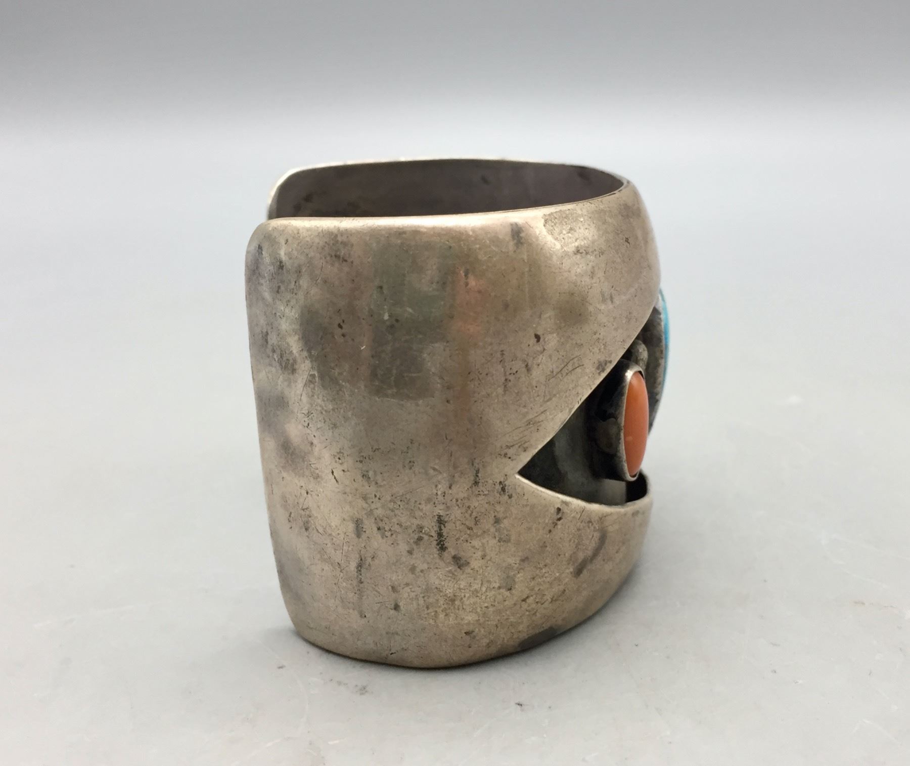 Description: For sale in this lot is a vintage turquoise and coral shadowbox style bracelet set with two coral and one turquoise cabochon in sterling silver. Maker: Unmarked. Approx. Age: Circa 1970s. Size: Inside circumference measures 5-1/4 inches. Opening is an additional 1-1/2 inches, fitting a 6-3/4 inch wrist. Width is 2 inches. Weighs 104.5 grams. Condition: Good for its age, normal wear expected. Please look closely at the pictures - they are an important part of our description. Shipping: There will be a $5 handling, packaging fee for shipping this lot. The actual cost of postage will be added on top of that.