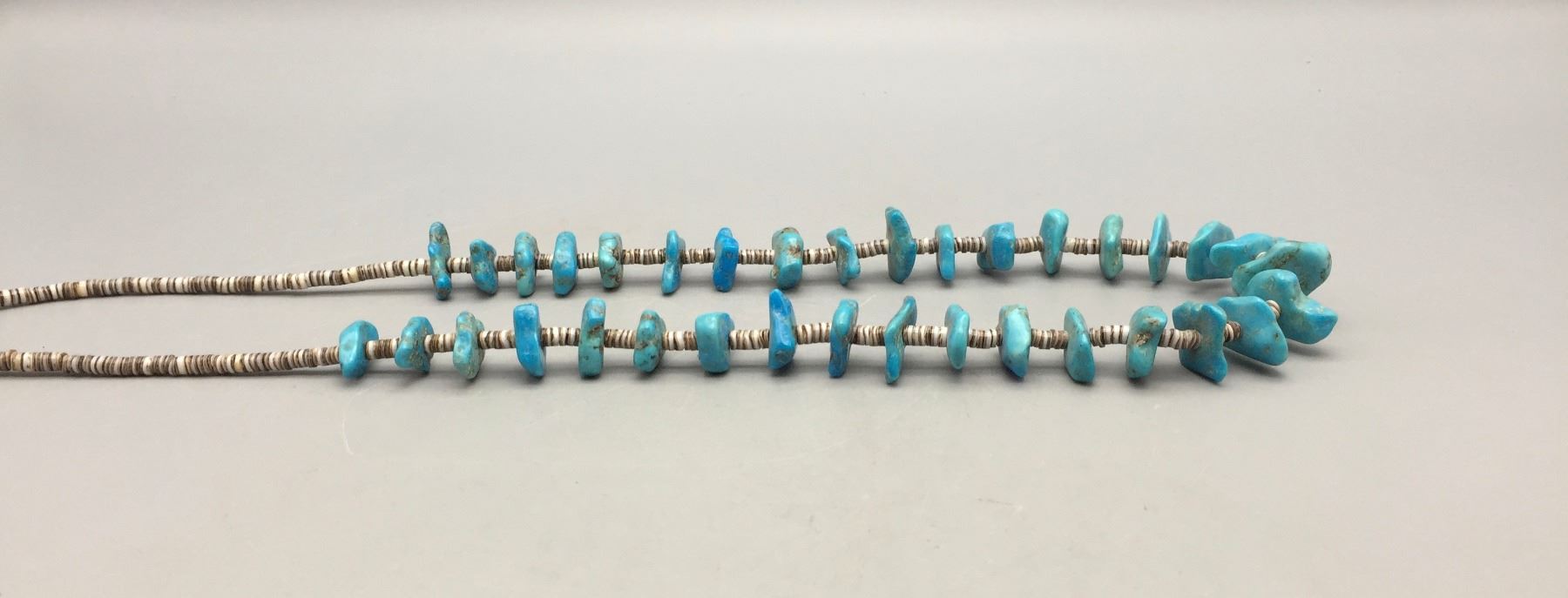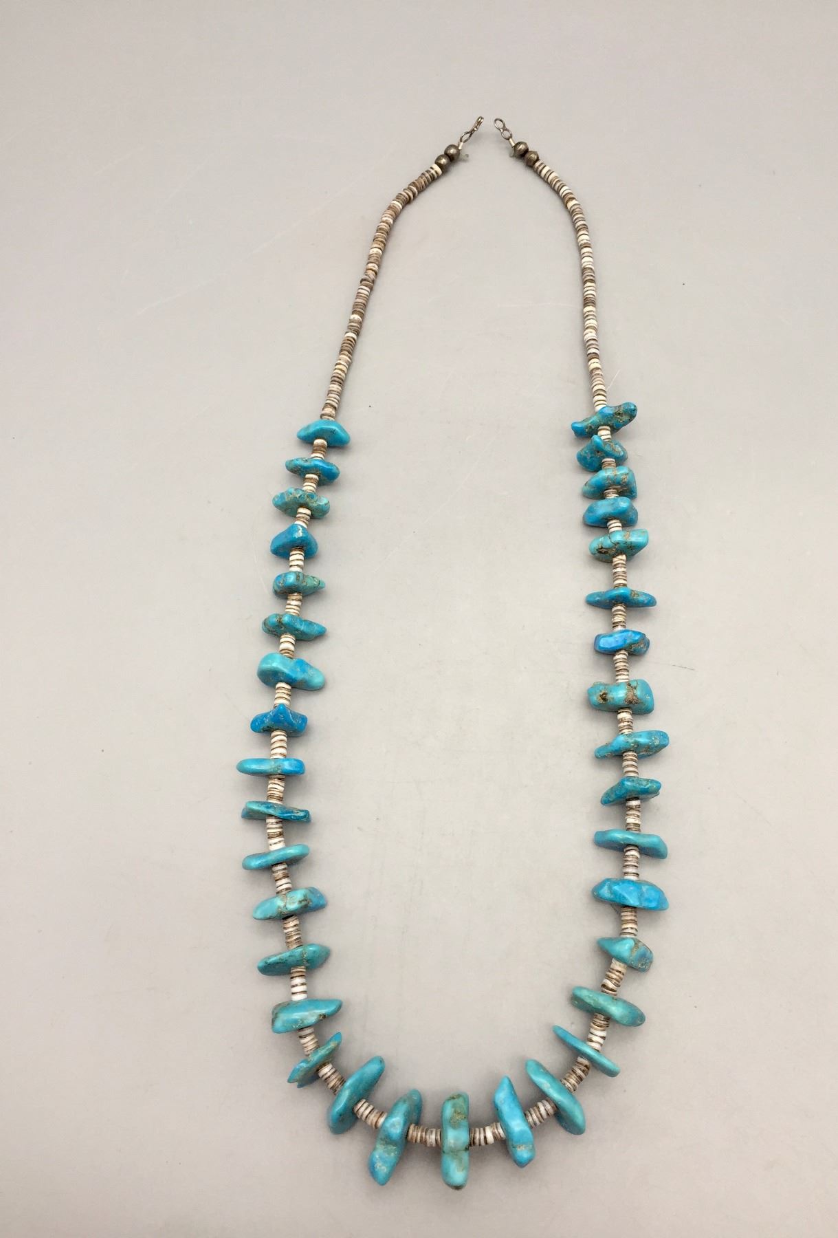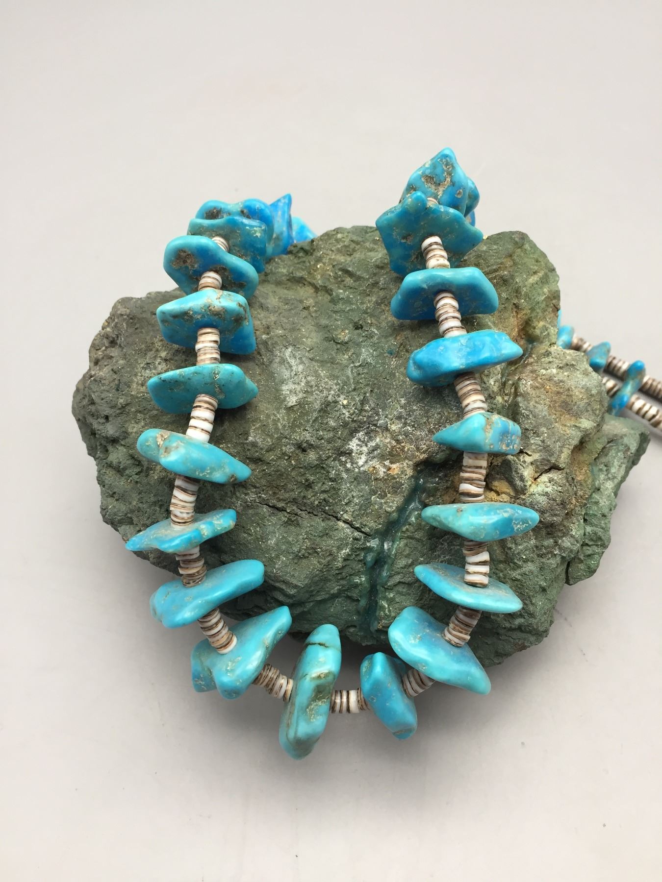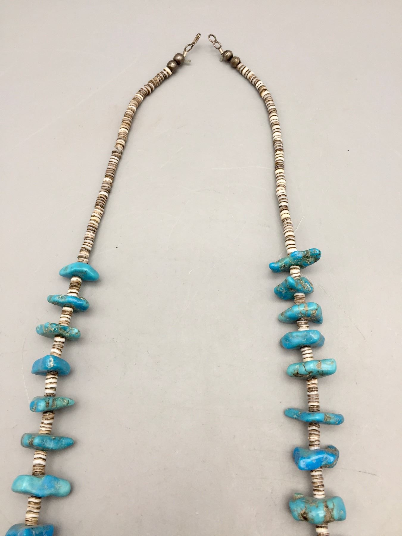 Description: This necklace is made up of large turquoise stones evenly spaced apart with fine “heishi”. The finding are sterling silver. Maker: Unknown, but appears to be Pueblo style.