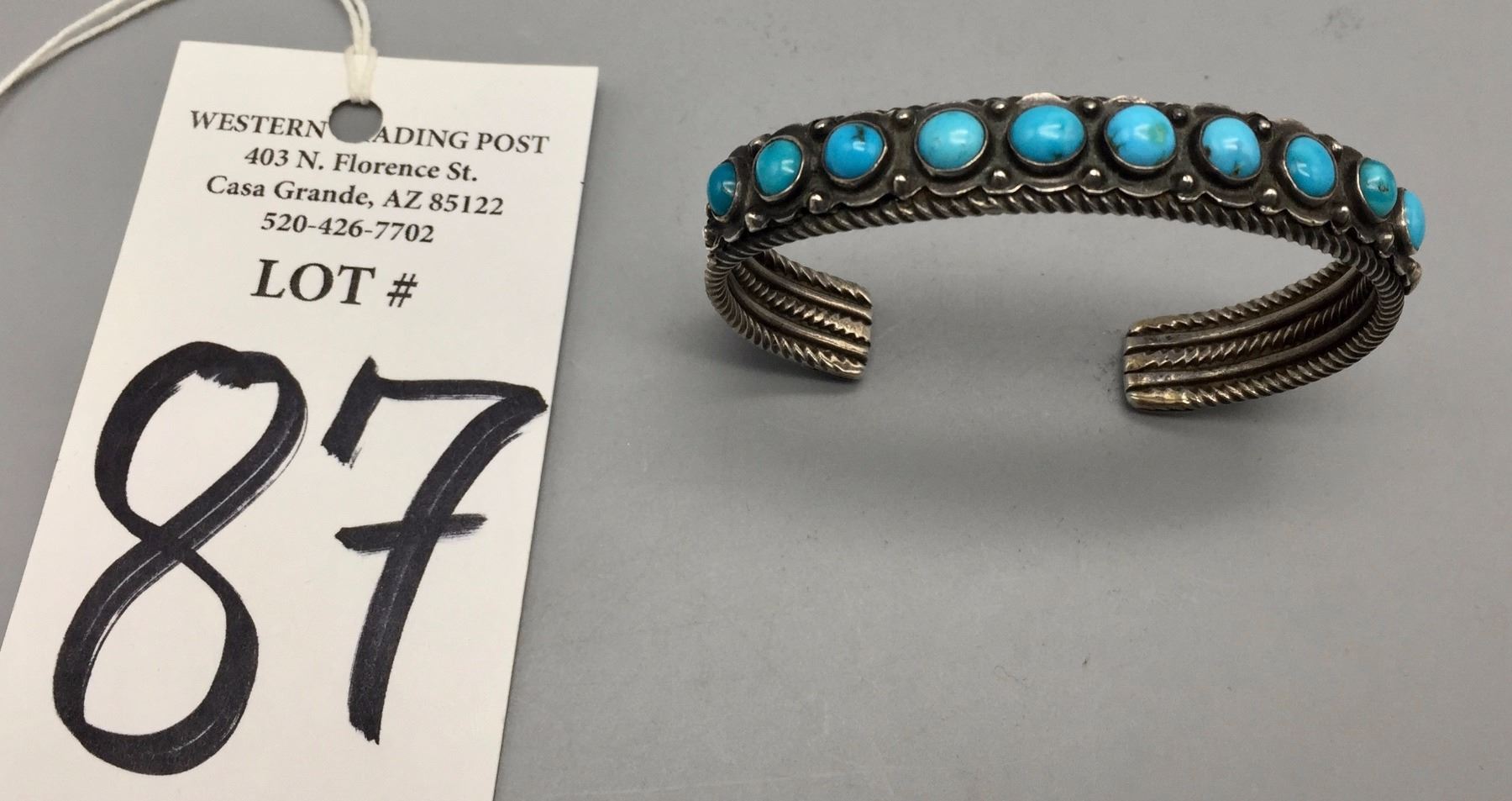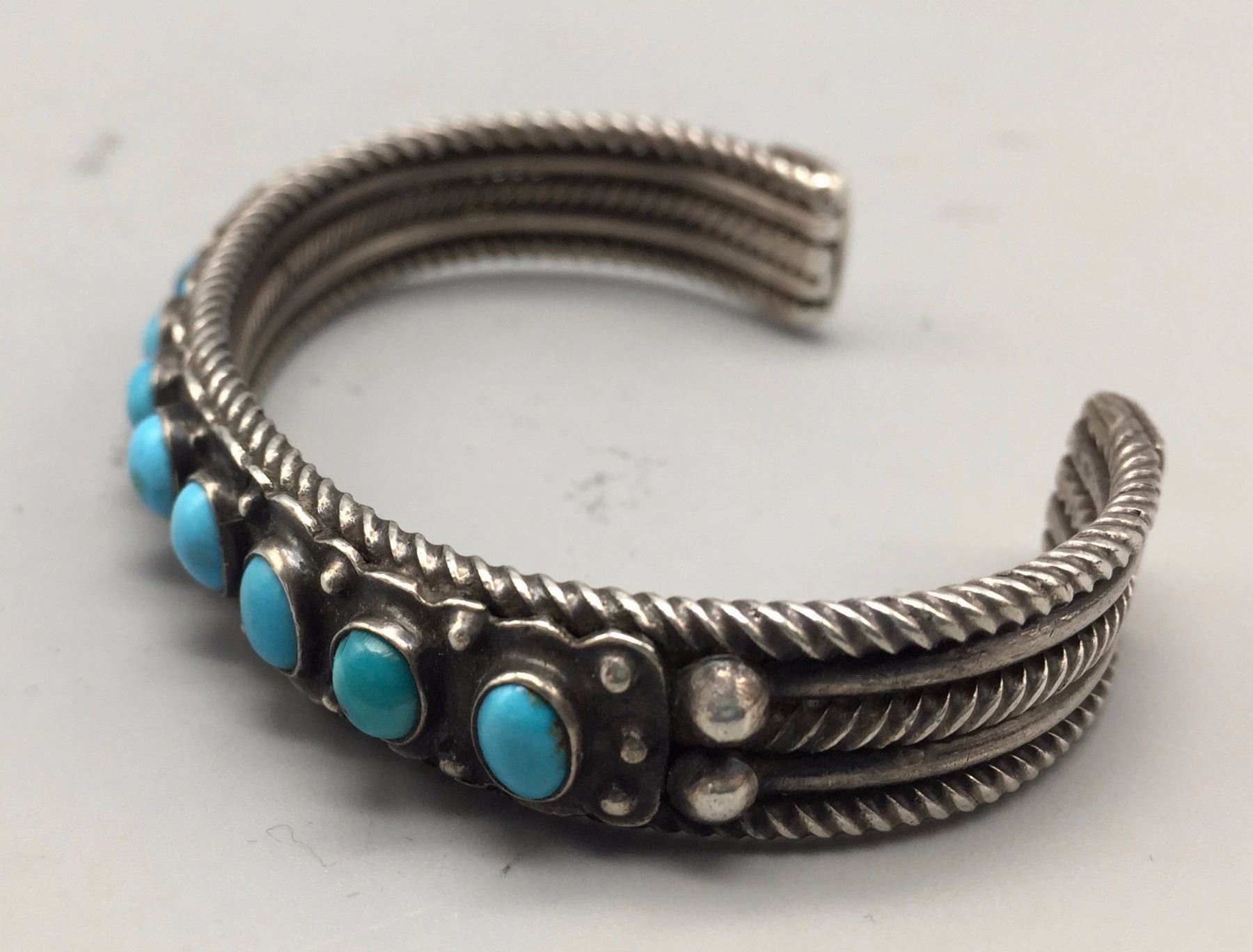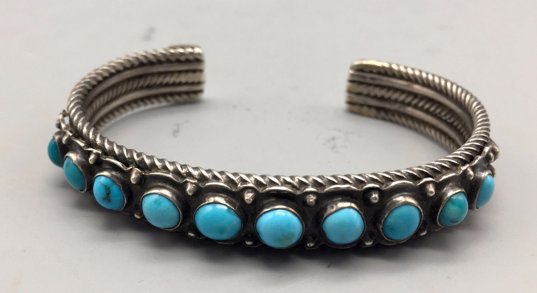 Maker: Unmarked, most likely Navajo. Approx. Age: Circa 1980s. Size: Inside circumference of bracelet is 5 5/8” plus it has a 1 1/8” opening (making it fit a 6 3/4” wrist). Bracelet is 7/16” at it’s widest point and weighs 37.1 g. Additional Info: Cuff bracelet features nice turquoise cabochons and hand-embellished silver work. Tested as sterling silver. Condition: Good. Normal wear expected. Please look closely at the pictures - they are an important part of our description. Shipping: There will be a $5 handling / packaging fee for shipping this lot. The actual cost of postage will be added on top of that.