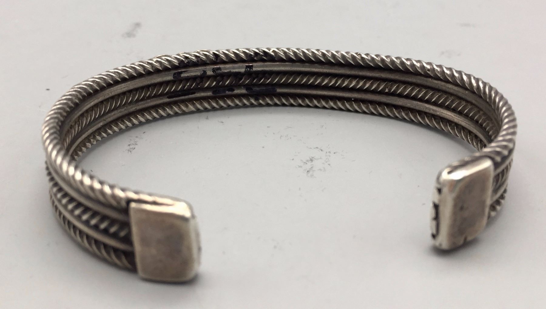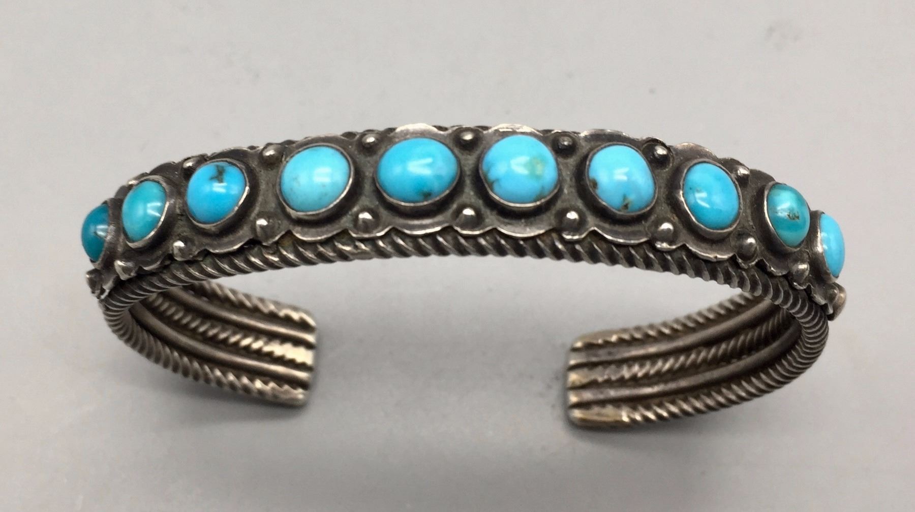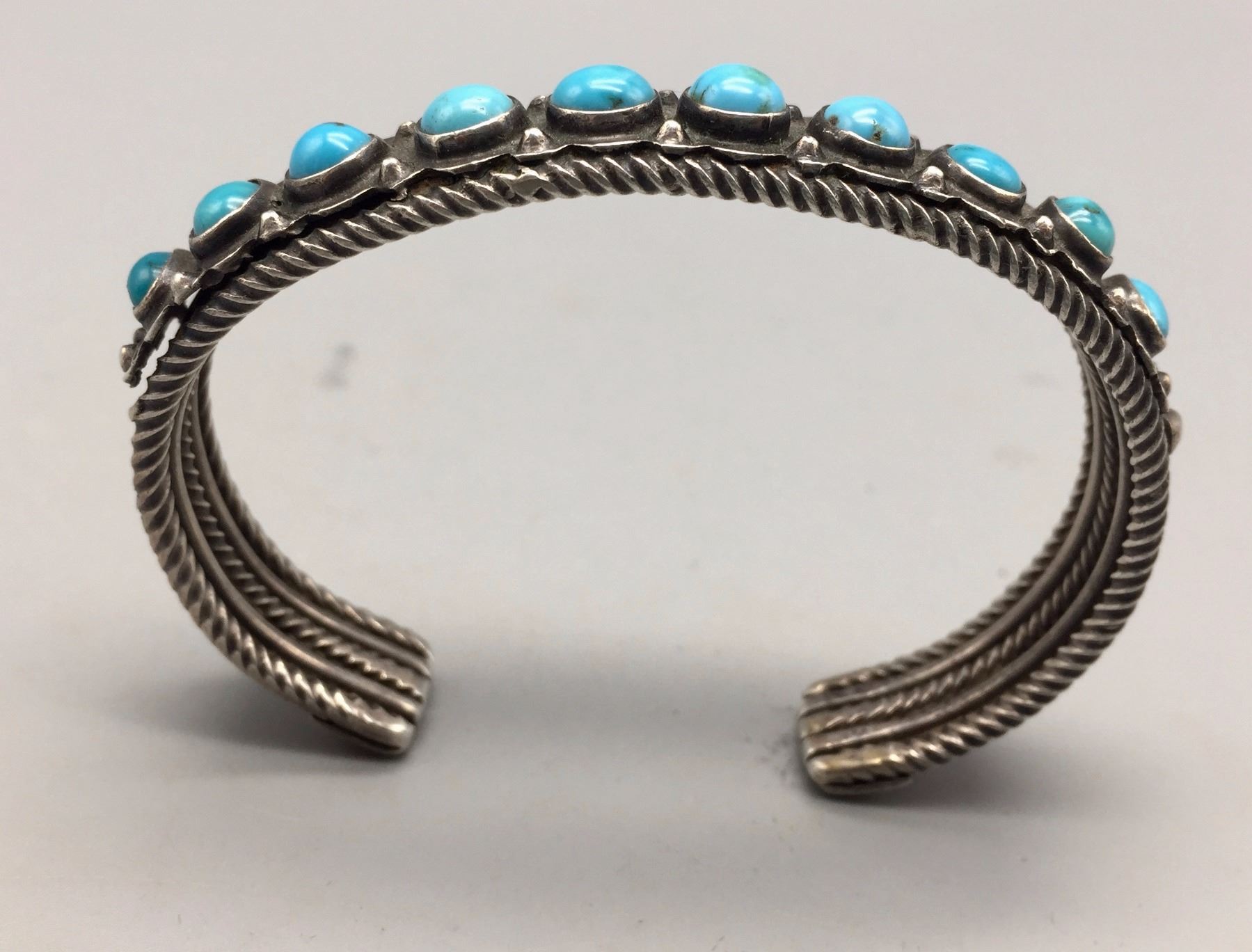 Maker: Unmarked, most likely Navajo. Approx. Age: Circa 1980s. Size: Inside circumference of bracelet is 5 5/8” plus it has a 1 1/8” opening (making it fit a 6 3/4” wrist). Bracelet is 7/16” at it’s widest point and weighs 37.1 g. Additional Info: Cuff bracelet features nice turquoise cabochons and hand-embellished silver work. Tested as sterling silver. Condition: Good. Normal wear expected. Please look closely at the pictures - they are an important part of our description. Shipping: There will be a $5 handling / packaging fee for shipping this lot. The actual cost of postage will be added on top of that.