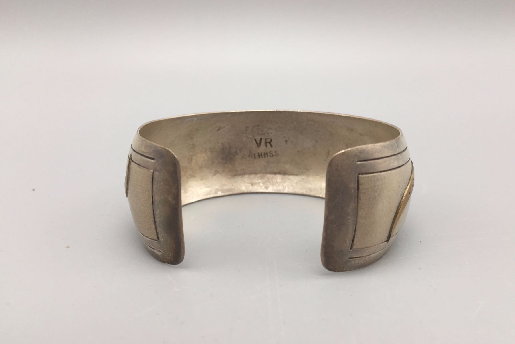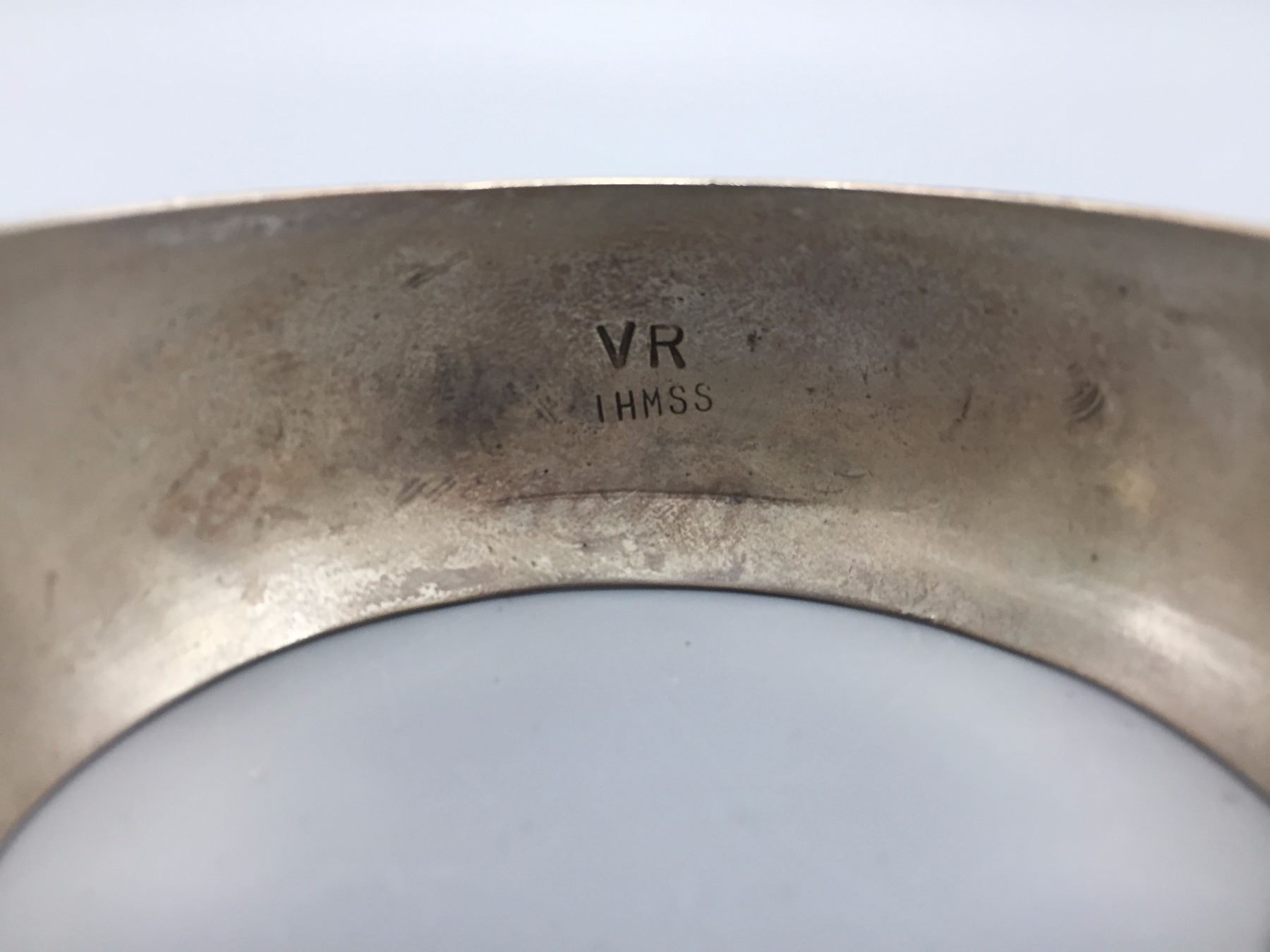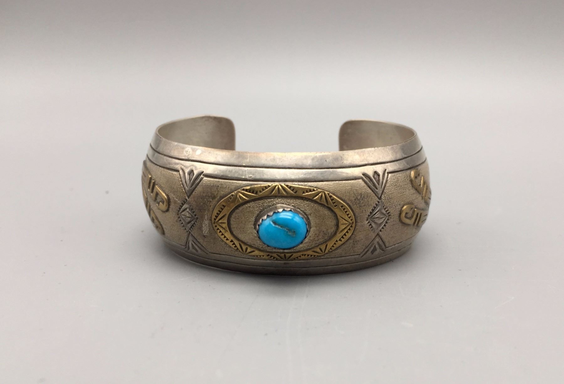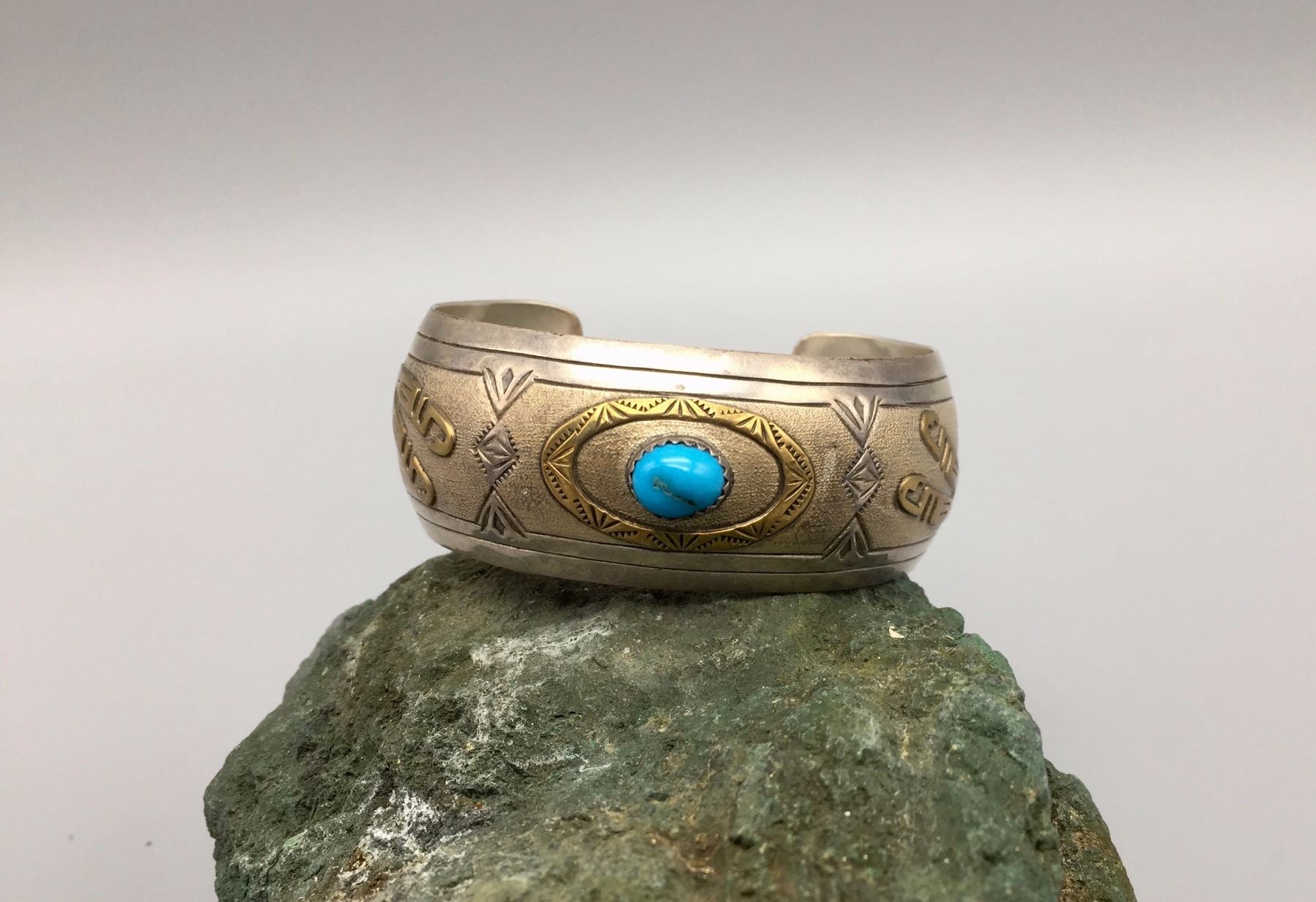 Maker: Hallmarked VR and IHMSS (Indian Hand Made Sterling Silver). Approx. Age: Circa 1970s - 80s. Size: Inside circumference measures 6” with an additional 1 1/8” opening, (fitting a 7 1/8” wrist) approx.1” wide and weighs 26.4 g. Additional Info: A turquoise and sterling silver bracelet with brass accents.. Condition: Good for it’s age, normal wear expected. Please look closely at the pictures - they are an important part of our description. Shipping: There will be a $5 handling / packaging fee for shipping this lot. The actual cost of postage will be added on top of that.