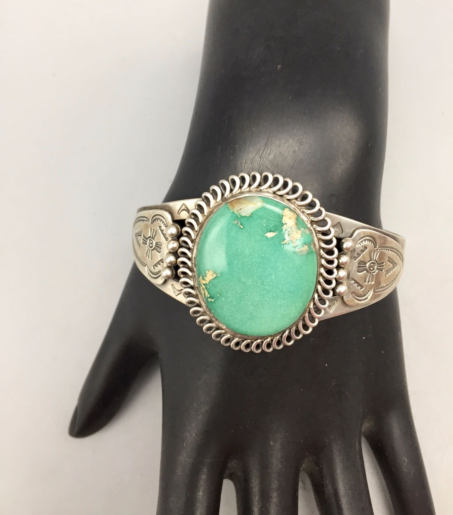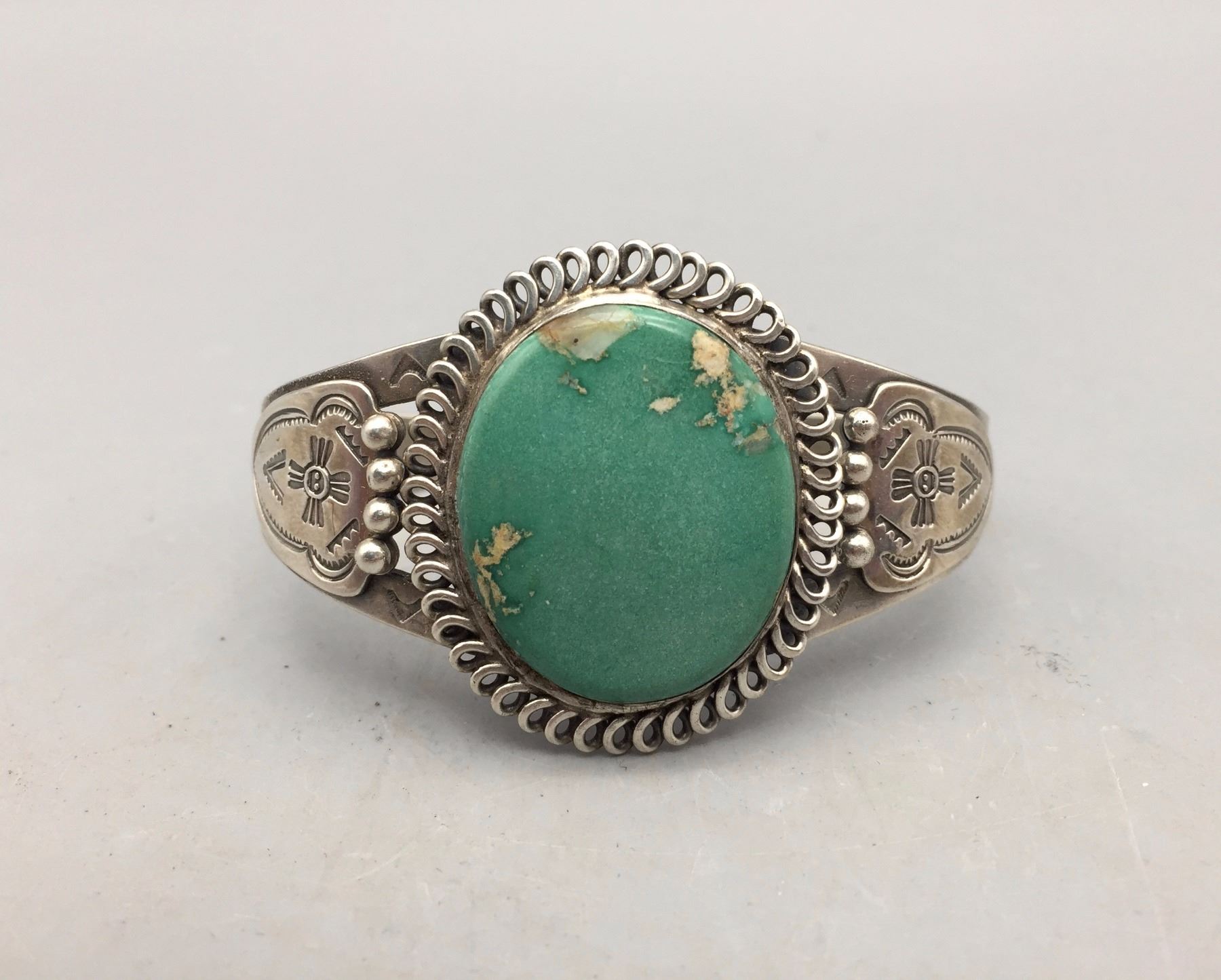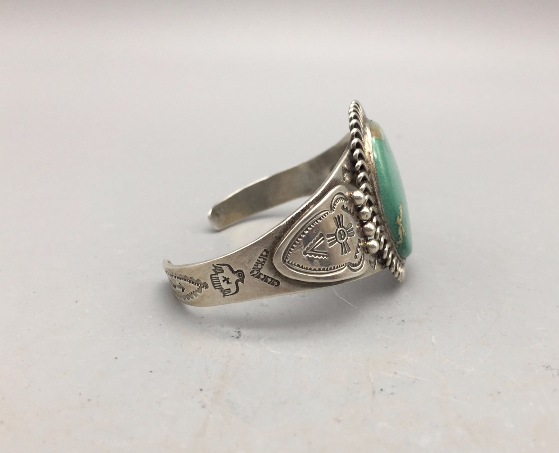 Description: Vintage turquoise and sterling silver bracelet with sterling silver designs and hand stamping. Maker: No hallmark. Approx. Age: A Fred Harvey Era piece (from circa 1930s - 1950s). Size: Measures 5-1/2” with a 1-1/8” opening (fits a 6-5/8” wrist). Measures 1-1/2” at its widest point. Weighs 31 grams. Condition: Good for its age, normal wear expected. Please look closely at the pictures - they are an important part of our description. Shipping: There will be a $5 handling / packaging fee for shipping this lot. The actual cost of postage will be added on top of that.