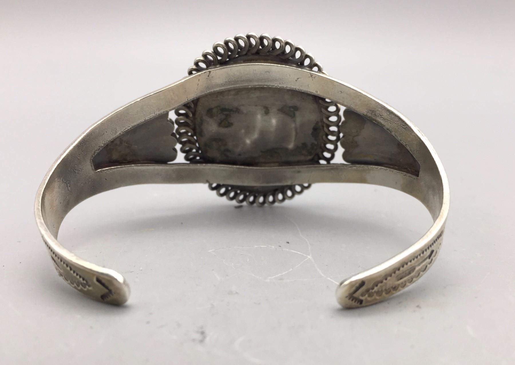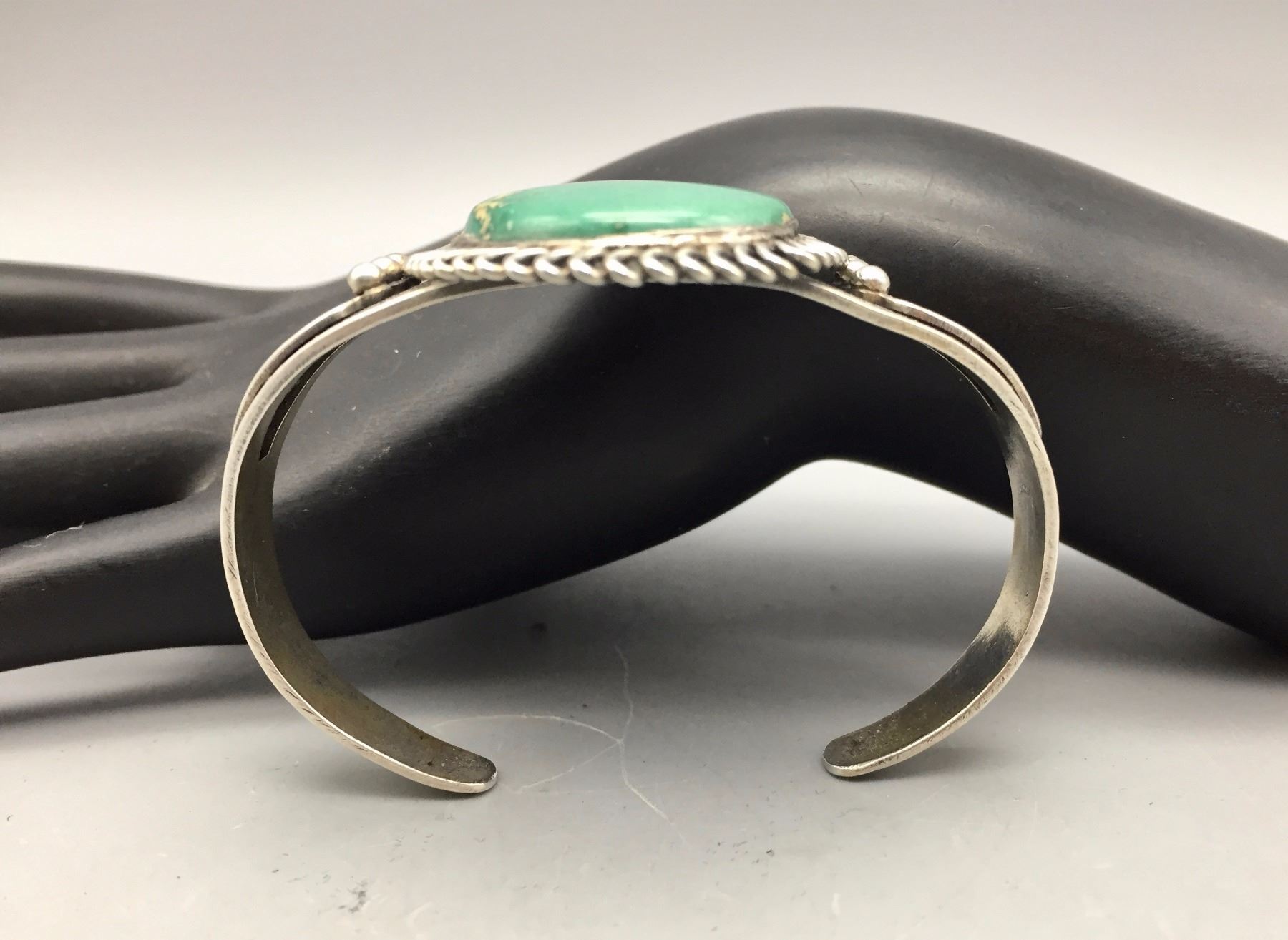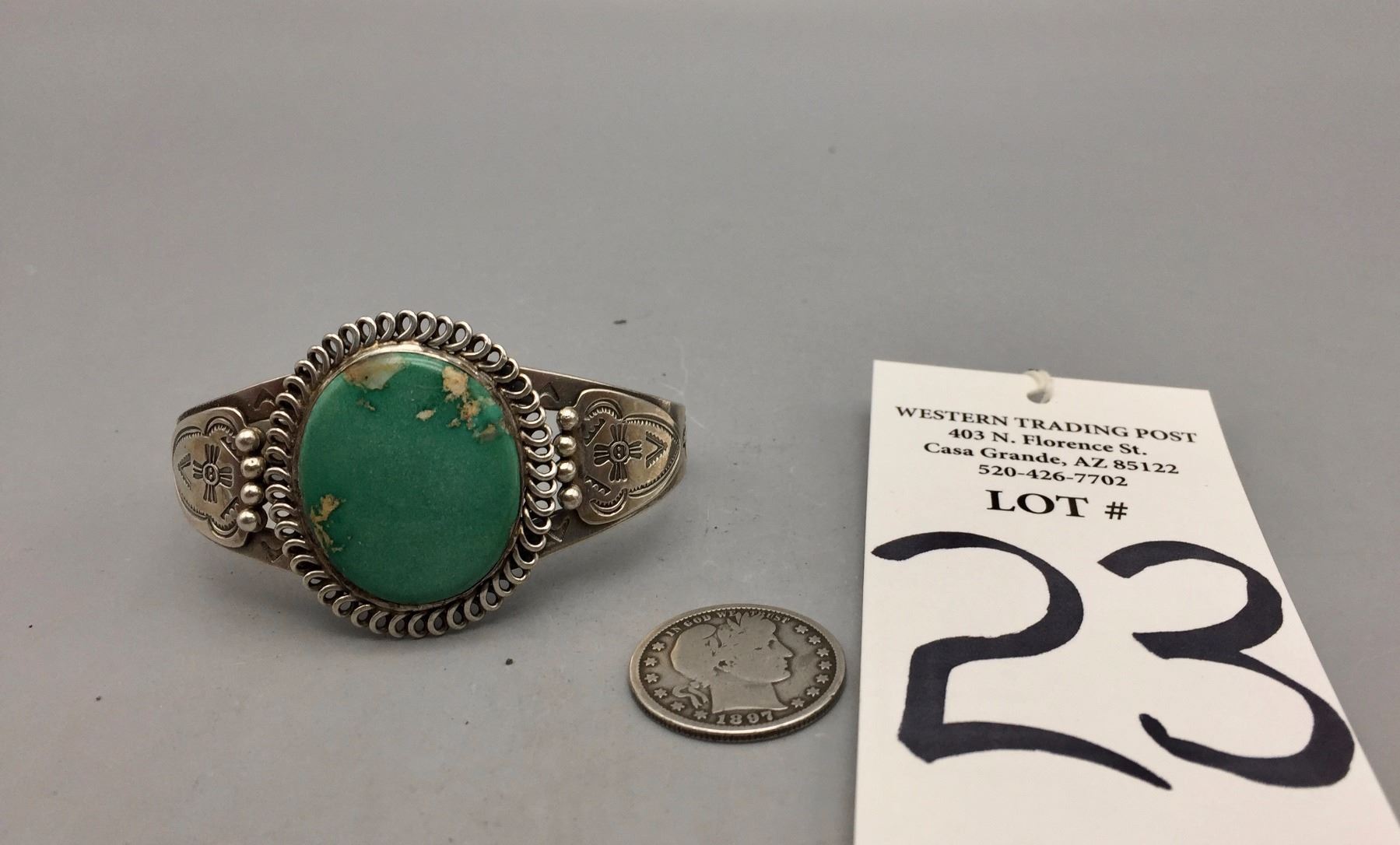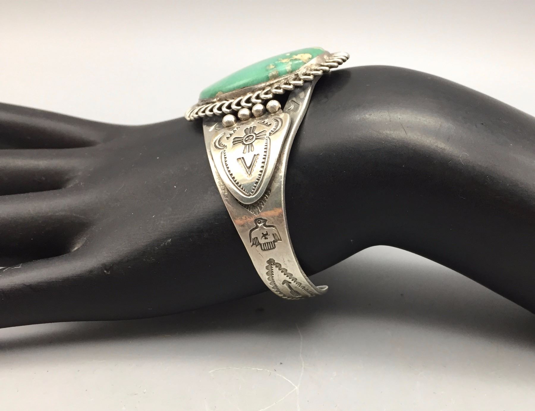 Description: Vintage turquoise and sterling silver bracelet with sterling silver designs and hand stamping. Maker: No hallmark. Approx. Age: A Fred Harvey Era piece (from circa 1930s - 1950s). Size: Measures 5-1/2” with a 1-1/8” opening (fits a 6-5/8” wrist). Measures 1-1/2” at its widest point. Weighs 31 grams. Condition: Good for its age, normal wear expected. Please look closely at the pictures - they are an important part of our description. Shipping: There will be a $5 handling / packaging fee for shipping this lot. The actual cost of postage will be added on top of that.