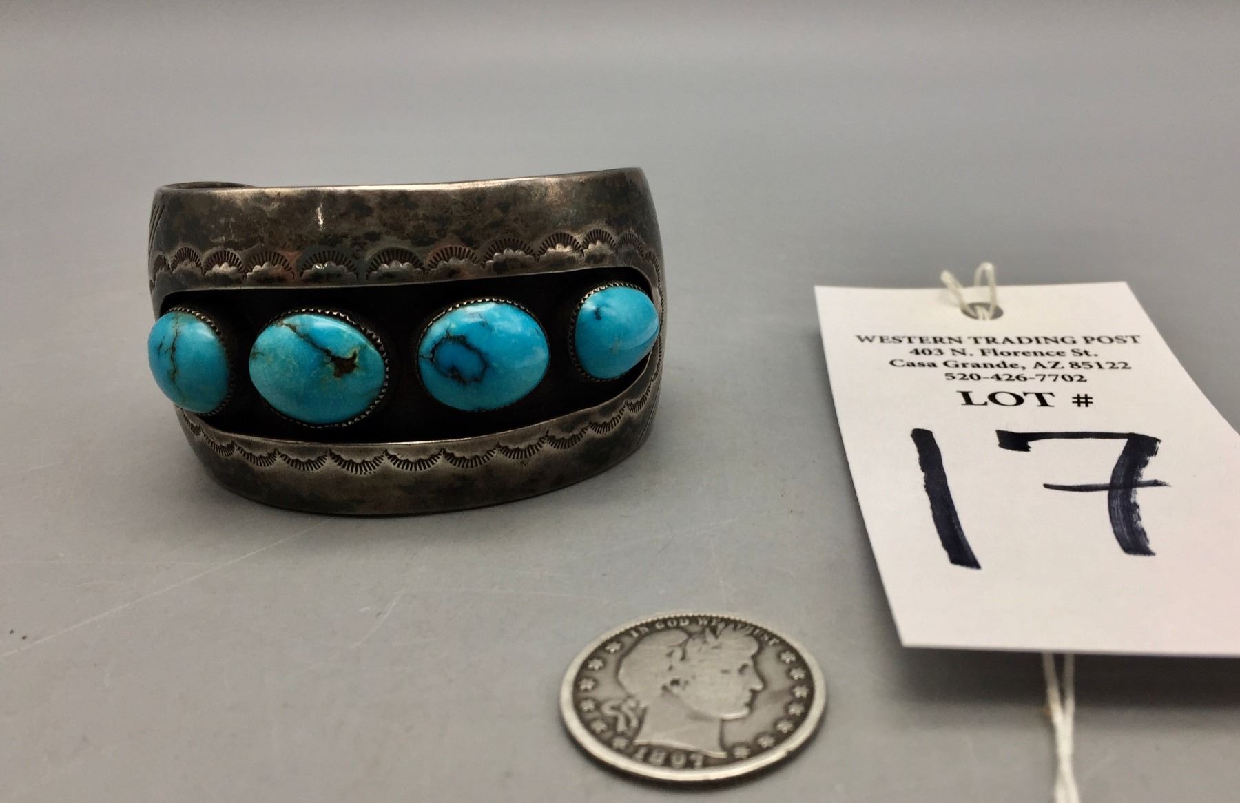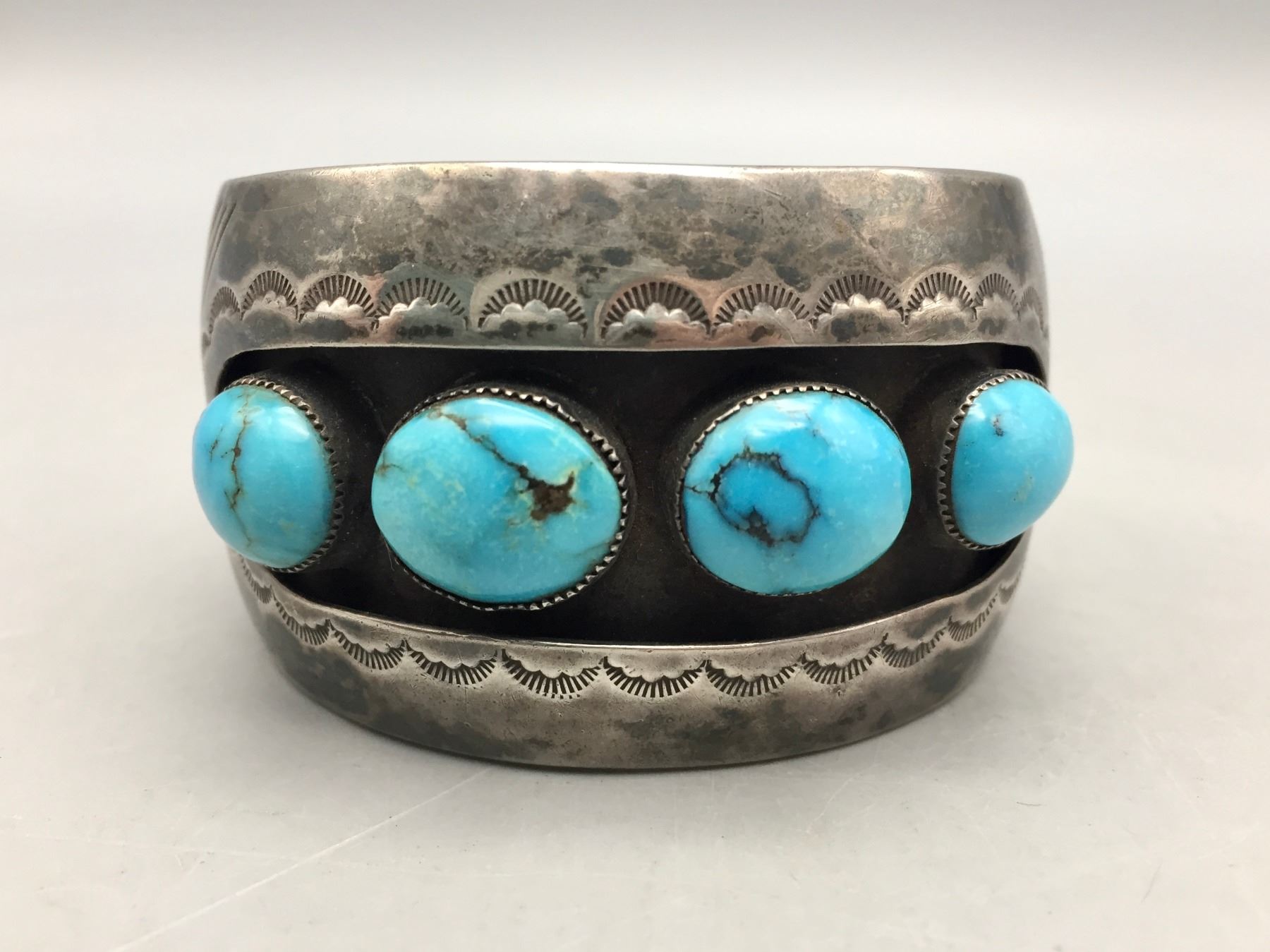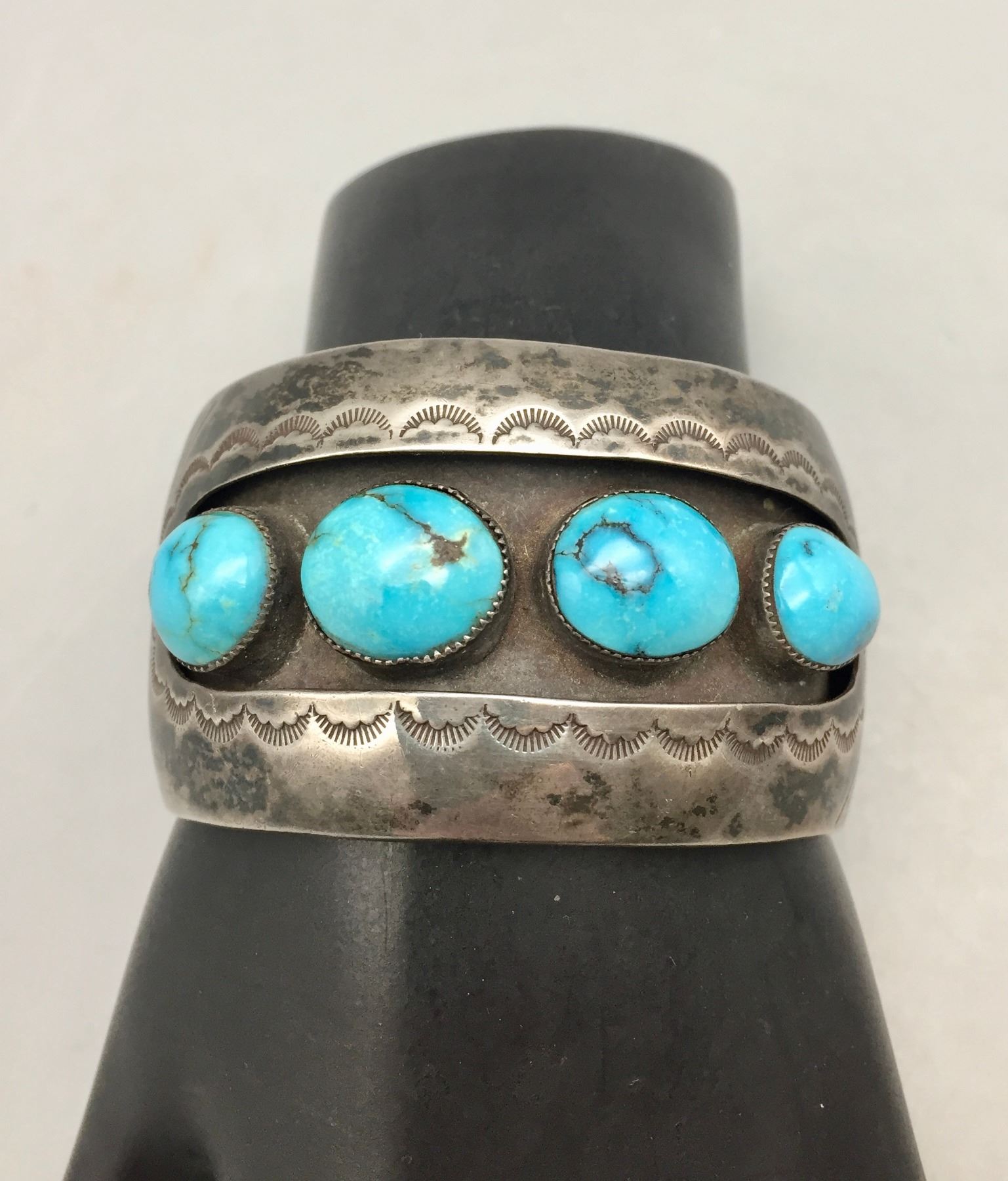 Description: Featured in this lot is great sterling silver cuff with four bright turquoise stones. It is a shadow box style with stamping. Tested as sterling silver.                                                                                                           Maker: Unknown                                                                                                                 Approx. Age: Circa 1970s.                                                                                                            Size: Inside circumference is 5 3/8”, additional opening is 1 1/2” (fits 7” wrist). 1 1/2” wide. Weighs 67.9 grams.                                                                                                                                                                                                                                 Condition: Good for its age, normal wear expected.                                                                                                                Please look closely at the pictures - they are an important part of our description.                                Shipping: There will be a $5 handling / packaging fee for shipping this lot. The actual cost of postage will be added on top of that.