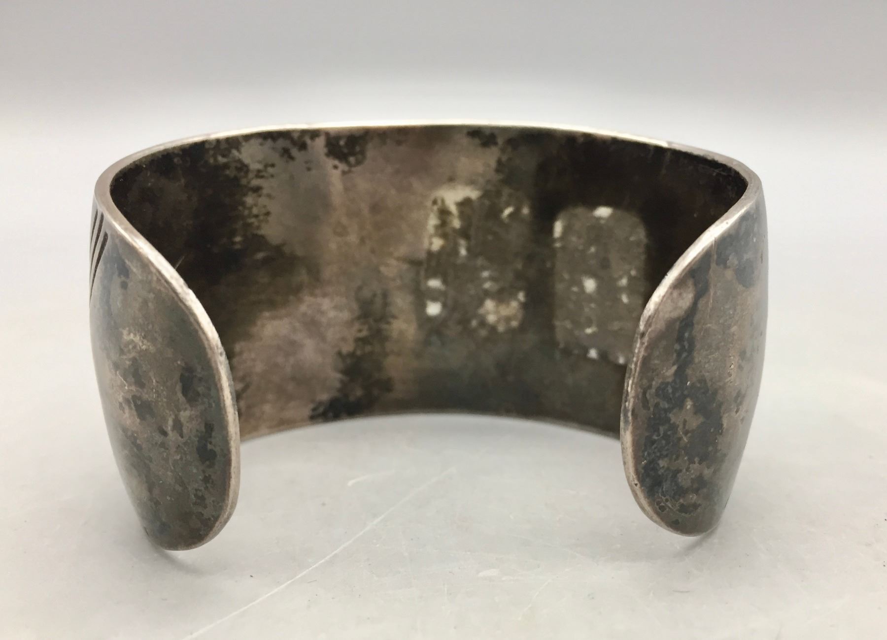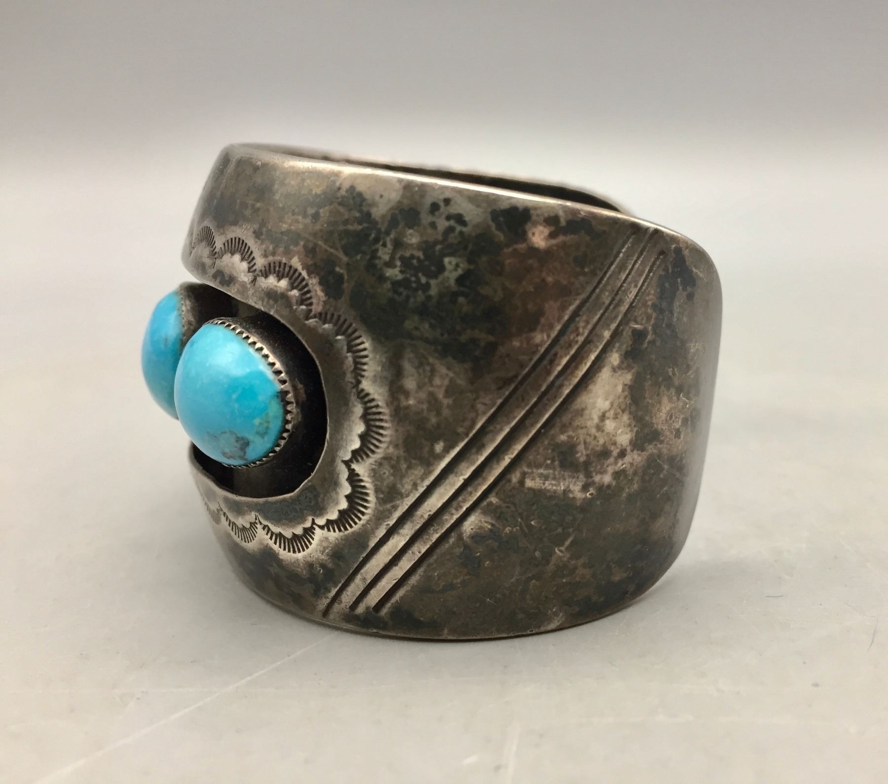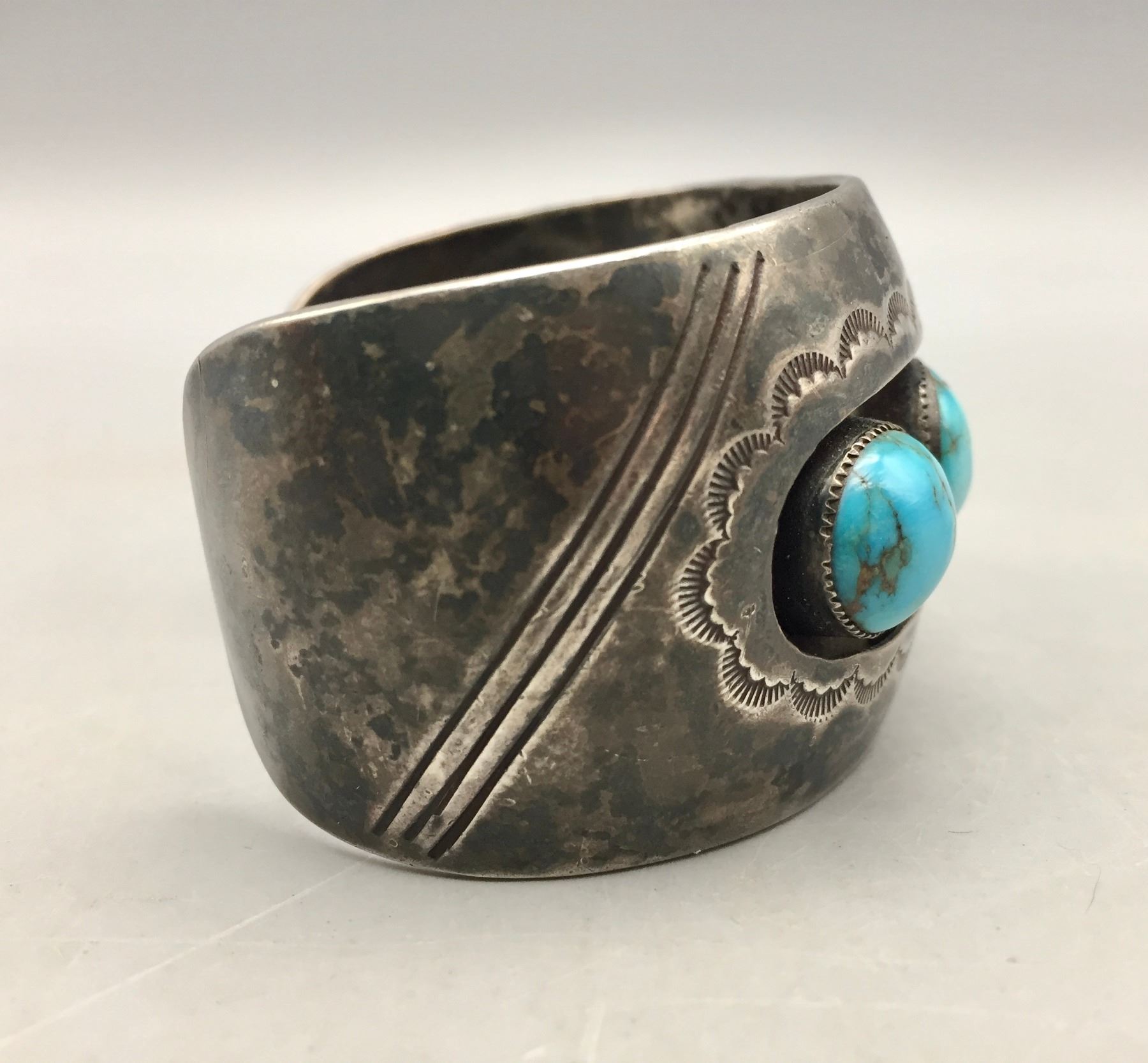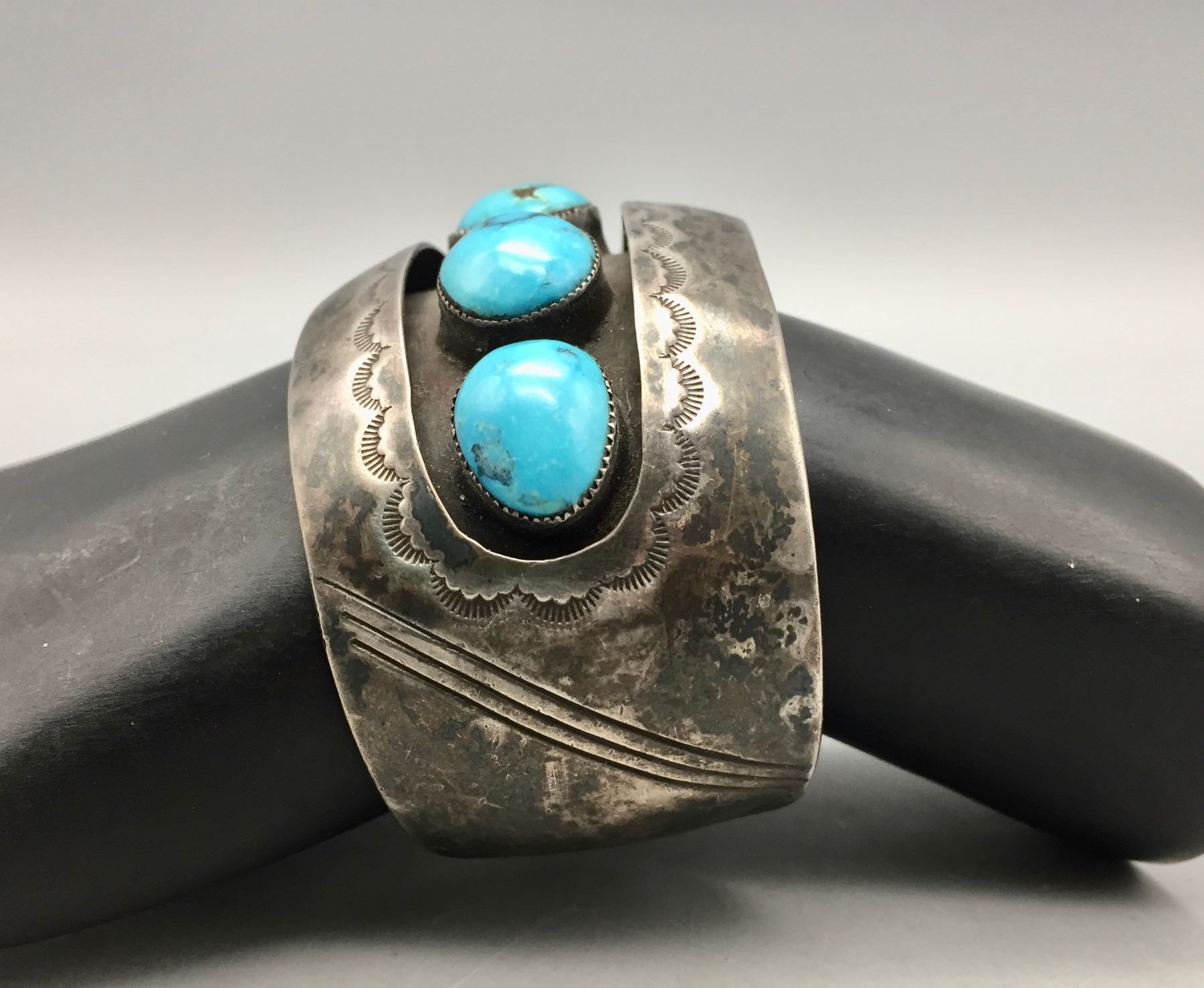 Description: Featured in this lot is great sterling silver cuff with four bright turquoise stones. It is a shadow box style with stamping. Tested as sterling silver.                                                                                                           Maker: Unknown                                                                                                                 Approx. Age: Circa 1970s.                                                                                                            Size: Inside circumference is 5 3/8”, additional opening is 1 1/2” (fits 7” wrist). 1 1/2” wide. Weighs 67.9 grams.                                                                                                                                                                                                                                 Condition: Good for its age, normal wear expected.                                                                                                                Please look closely at the pictures - they are an important part of our description.                                Shipping: There will be a $5 handling / packaging fee for shipping this lot. The actual cost of postage will be added on top of that.