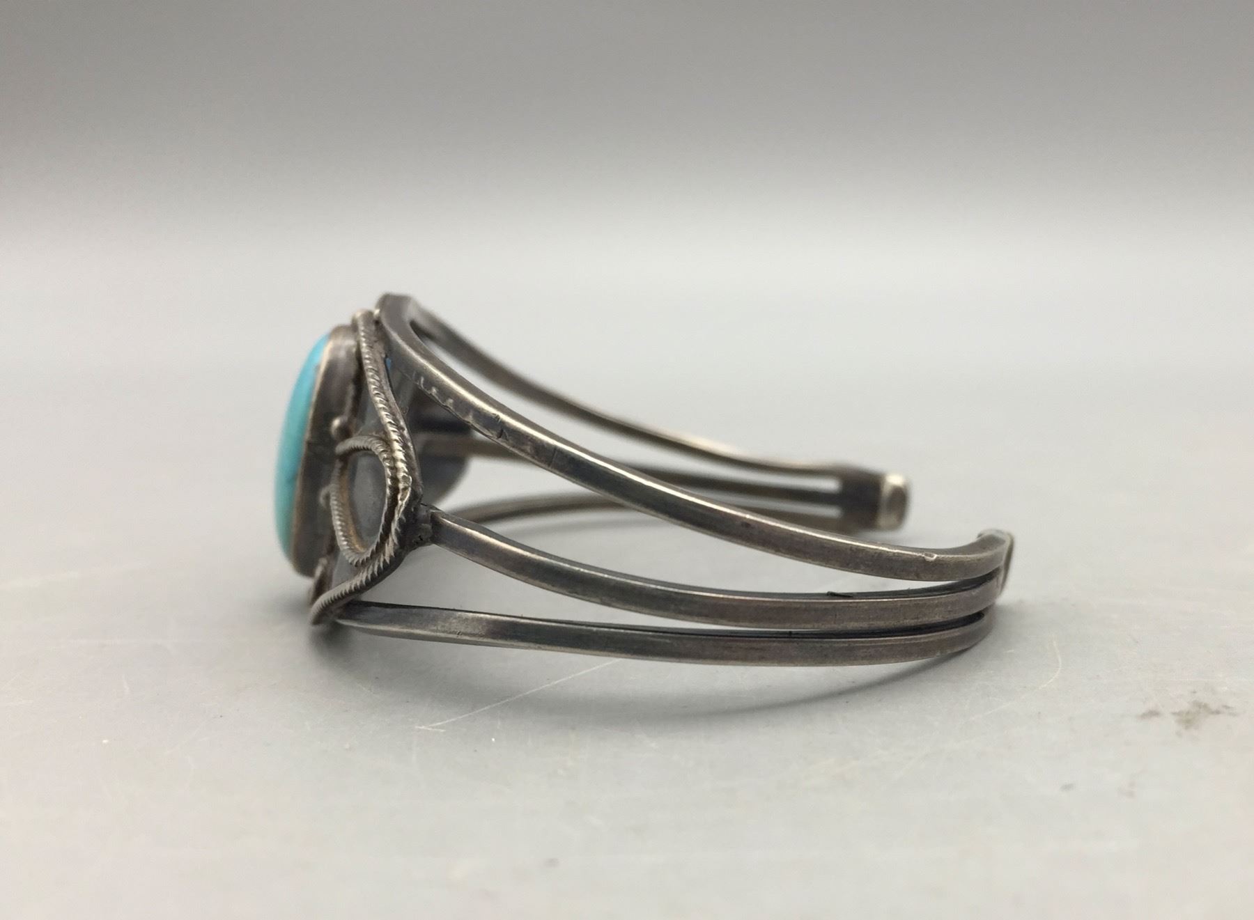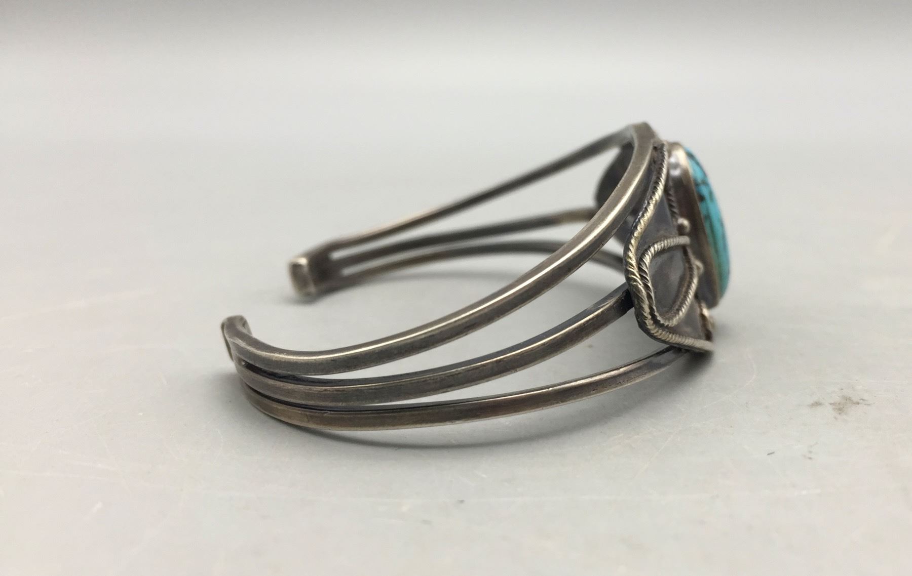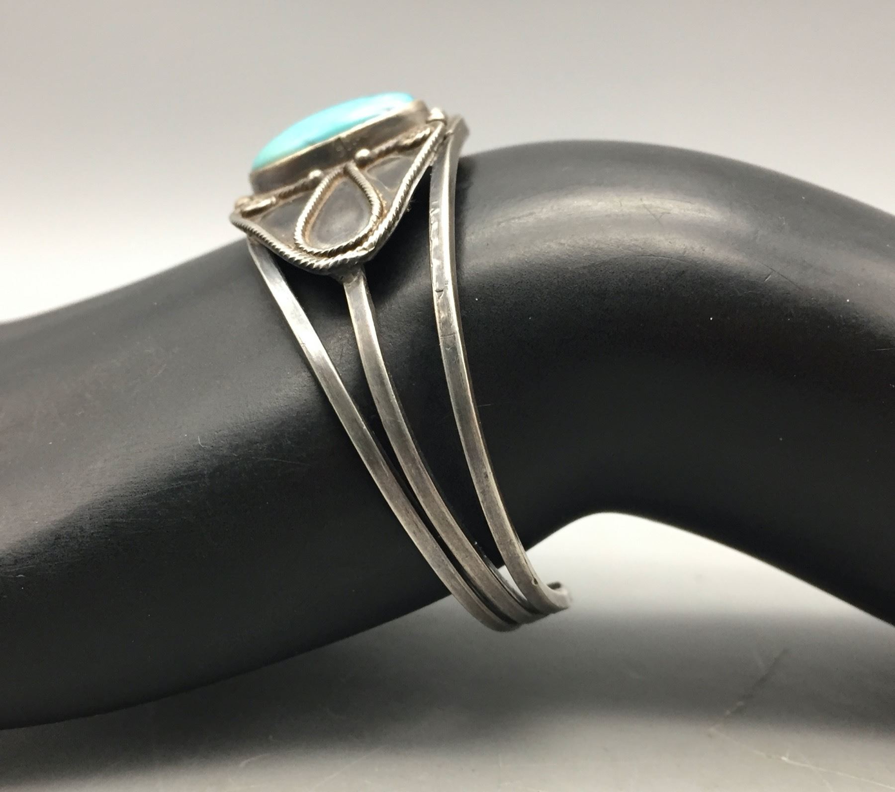 Description: Offered for sale in this lot is a vintage turquoise and sterling silver bracelet. It features a nice turquoise stone and three twisted rope designs with dots accenting it. Made in sterling silver. Maker: Unknown. Approx. Age: Vintage. Size: Inside circumference measures 5-3/8†long. Opening is an additional 1â€, fitting a 6-3/8†wrist. Width is 7/8â€. Weighs 20.2 grams. Condition: Good for its age, normal wear expected. Please look closely at the pictures - they are an important part of our description. Shipping: There will be a $5 handling / packaging fee for shipping this lot. The actual cost of postage will be added on top of that.