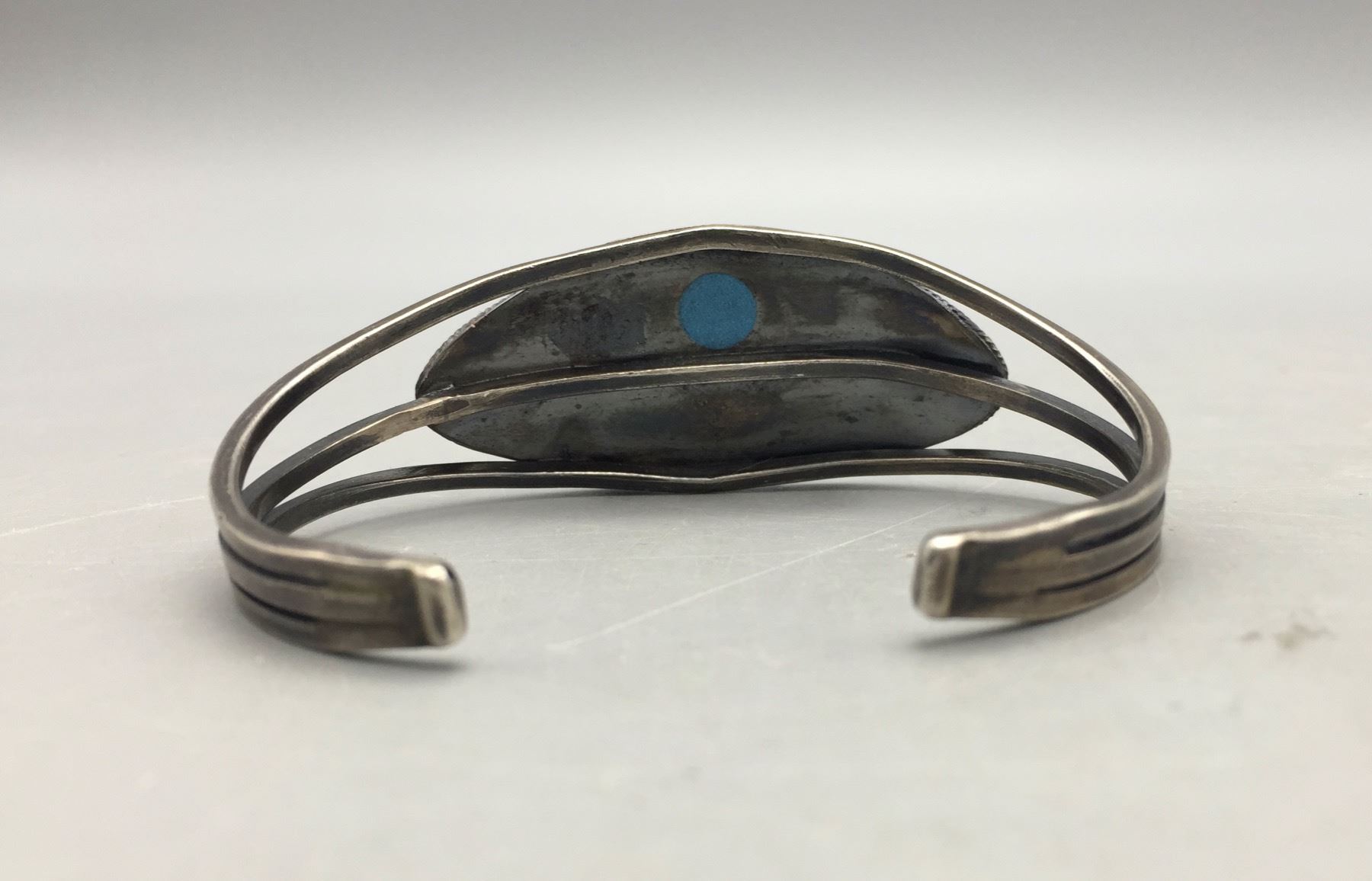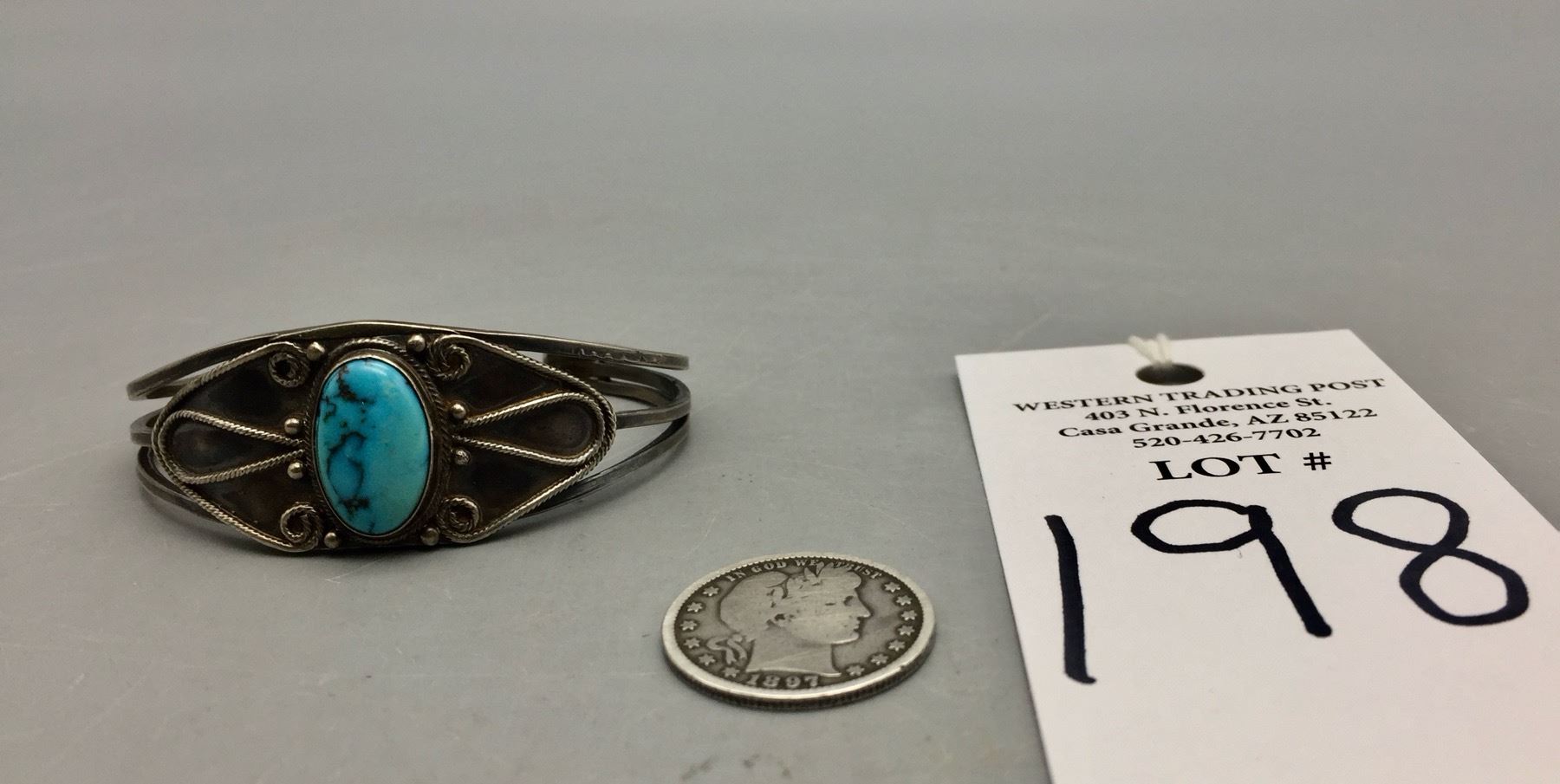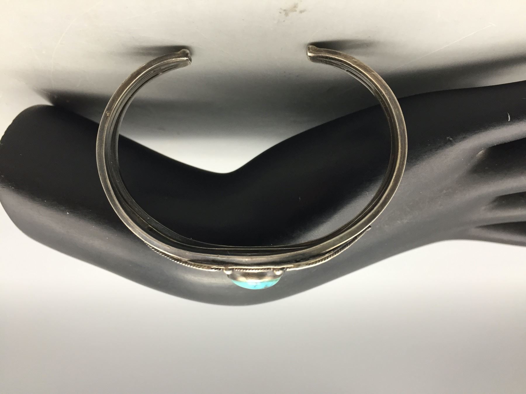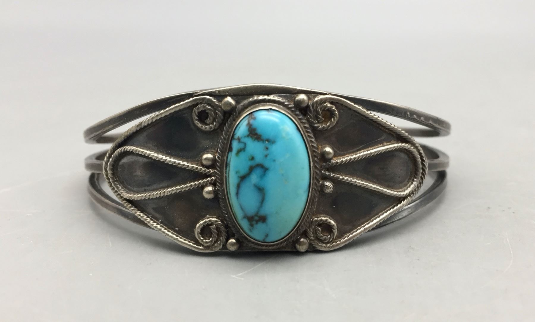 Description: Offered for sale in this lot is a vintage turquoise and sterling silver bracelet. It features a nice turquoise stone and three twisted rope designs with dots accenting it. Made in sterling silver. Maker: Unknown. Approx. Age: Vintage. Size: Inside circumference measures 5-3/8†long. Opening is an additional 1â€, fitting a 6-3/8†wrist. Width is 7/8â€. Weighs 20.2 grams. Condition: Good for its age, normal wear expected. Please look closely at the pictures - they are an important part of our description. Shipping: There will be a $5 handling / packaging fee for shipping this lot. The actual cost of postage will be added on top of that.