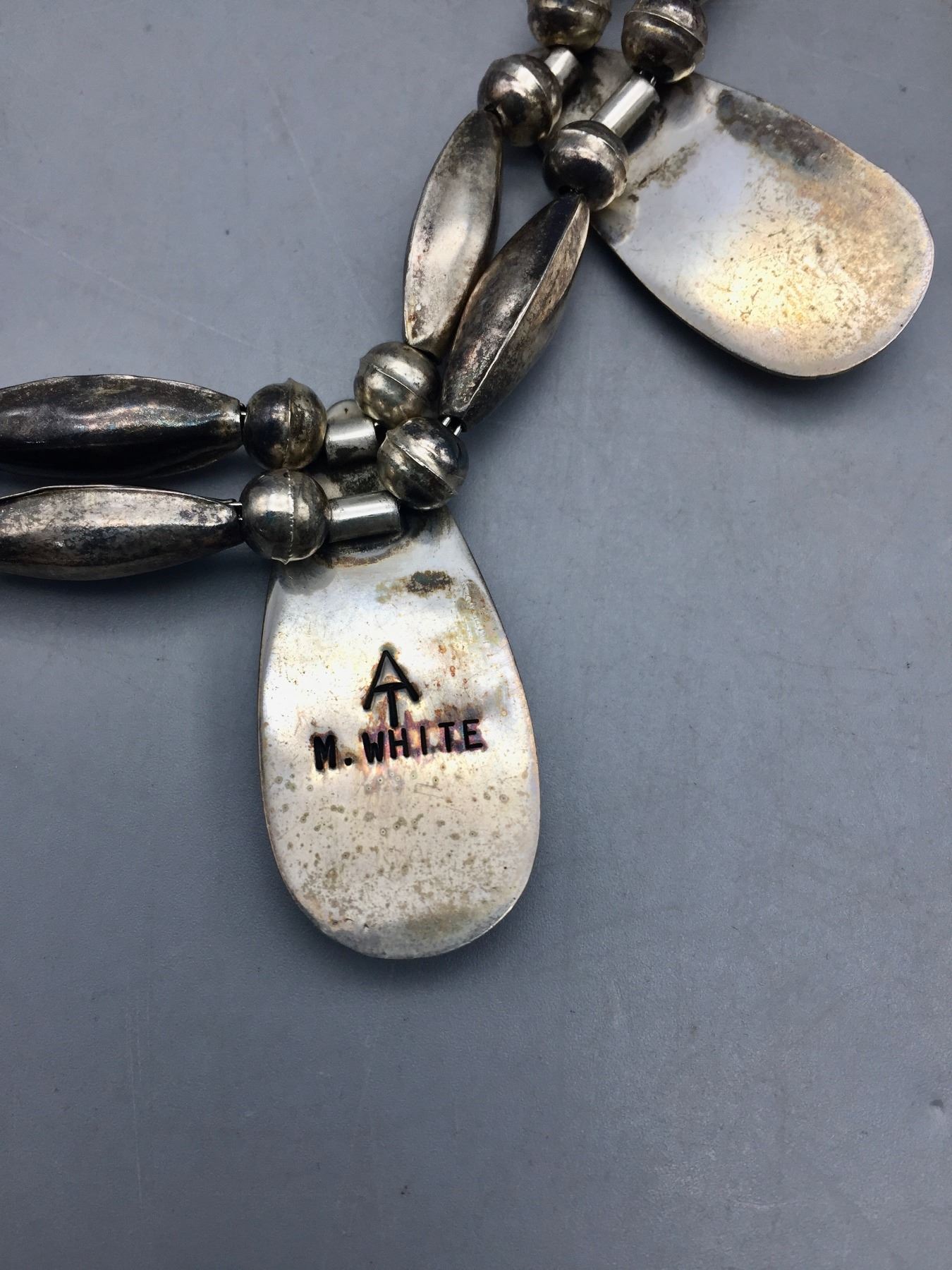 Description: Presented for sale in this lot is a vintage turquoise and sterling silver necklace set. The set includes matching earrings. Maker: Hallmarked M. White with conjoined AT on top of it (for Atkinson Trading Co.). Approx. Age: Circa 1970s. Size: Fits a 15” neck. Pendant measures 3/4”w x 1-1/2” long. Earrings measure 5/8”w x 1-1/2” long. Combined weight of 60.8 grams. Condition: Good for its age, normal wear expected. Please look closely at the pictures - they are an important part of our description. Shipping: There will be a $5 handling / packaging fee for shipping this lot. The actual cost of postage will be added on top of that.