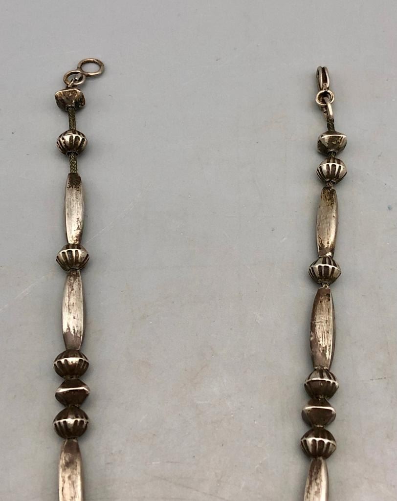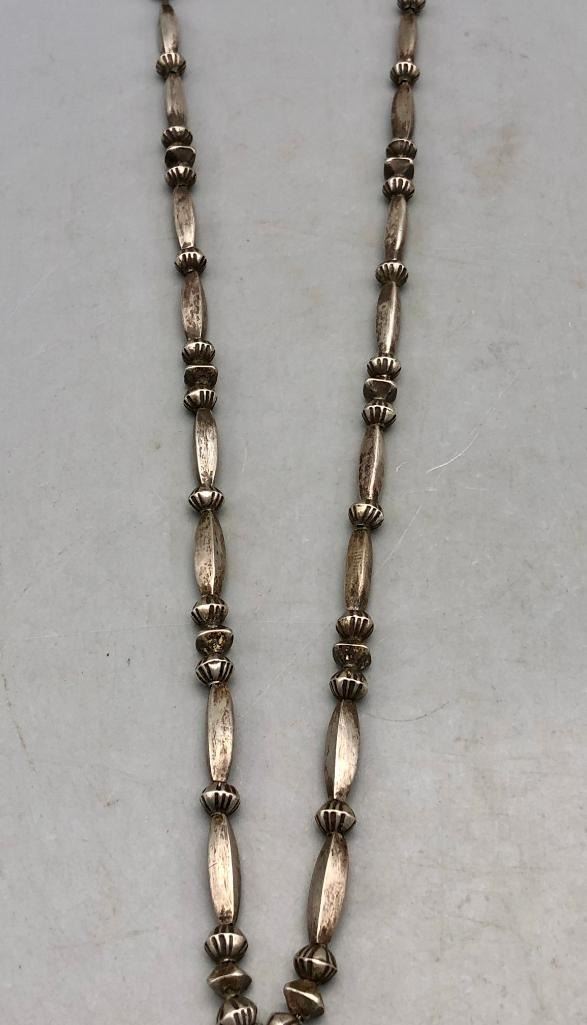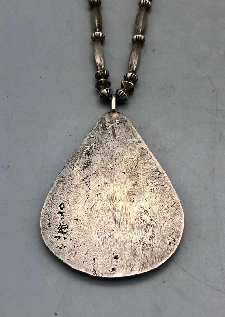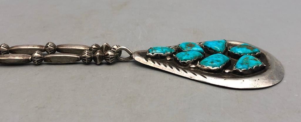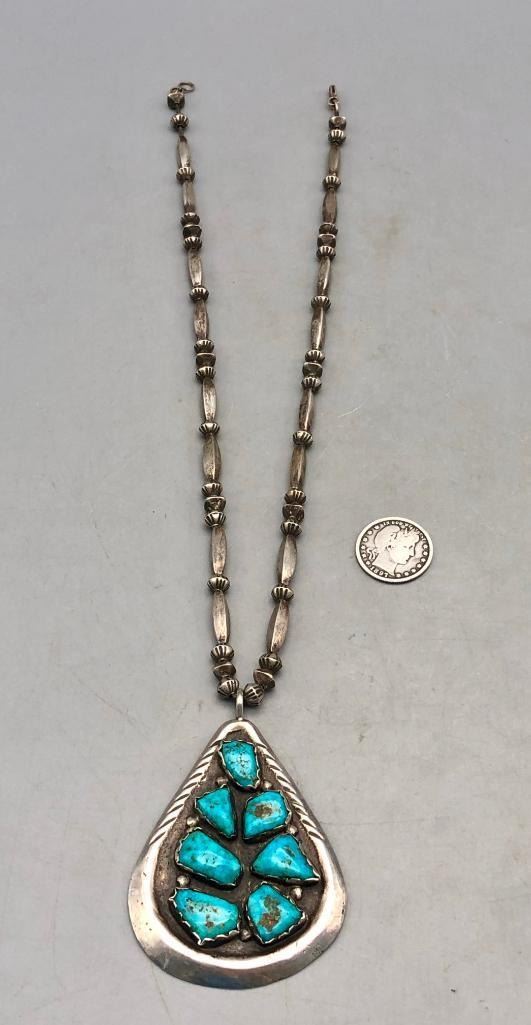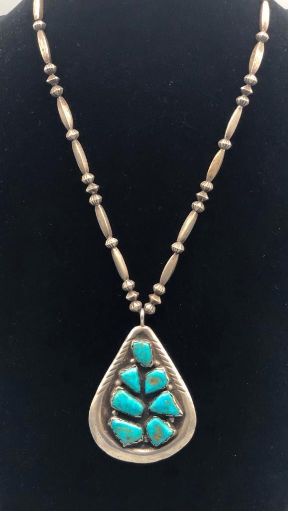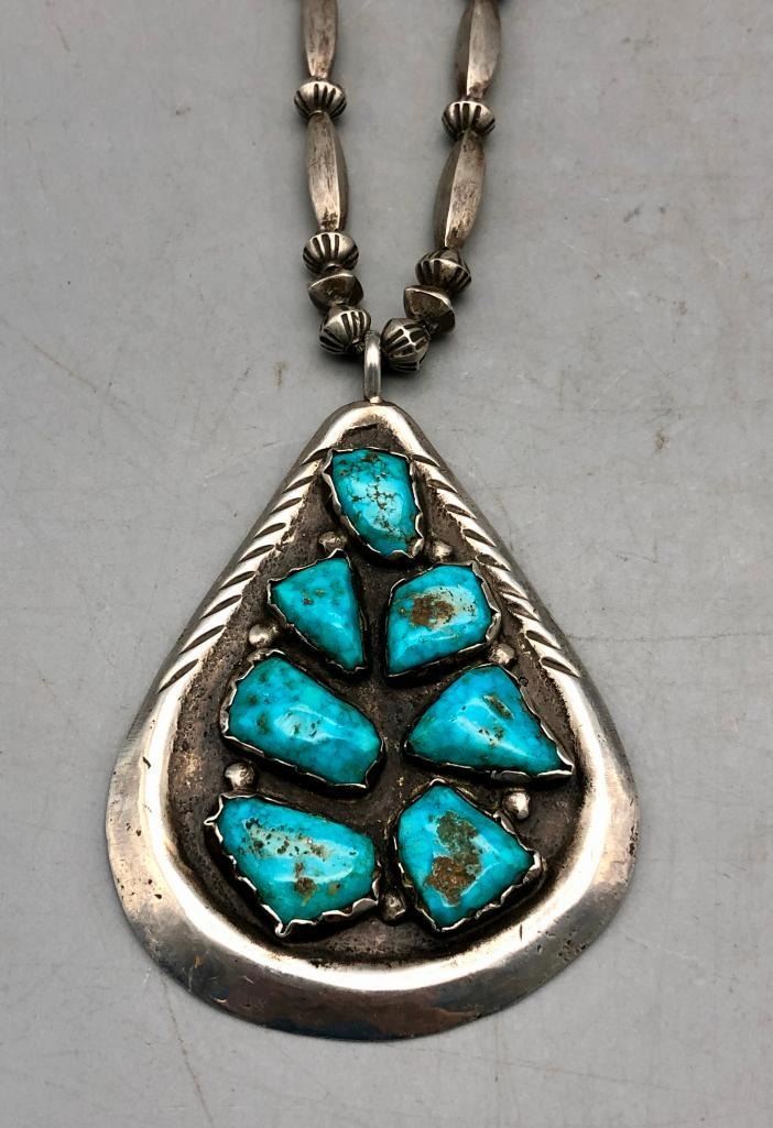 Presented for sale in this lot is a vintage turquoise and sterling silver necklace. The pendant is set with seven lovely turquoise stones in handmade bezels with silver dot accents. The beads are cone and disk styles, strung on a foxtail chain and it is sterling silver. Maker: Unmarked. Approx. Age: Circa 1970s. Size: Fits a 21 inch neck. Pendant measures 3-3/8 inches long X 2-1/4 inches wide. Weighs 84.2 grams. Condition: Good for its age, normal wear expected. Please look closely at the pictures - they are an important part of our description. Shipping: There will be a $5 handling / packaging fee for shipping this lot. The actual cost of postage will be added on top of that. BUY IT NOW: If you would like to buy this item now without waiting for the auction to end (this option is only available up to 48 hours before the auction starts to close), the “Buy it Now” price is the high estimate of this lot. If you would like to end the auction early and pay the high estimate (plus applicable fees), please contact us by phone or email and reference this lot number.