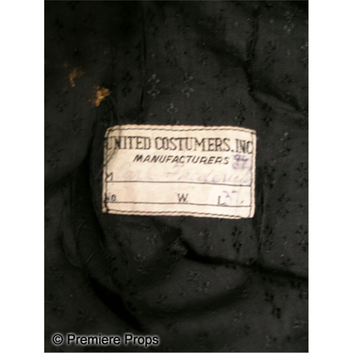 Black tuxedo jacket sourced from Warner Bros. and used in a 1930s film production. Includes a United Costumers label with the name Carl Frederick handwritten on it.