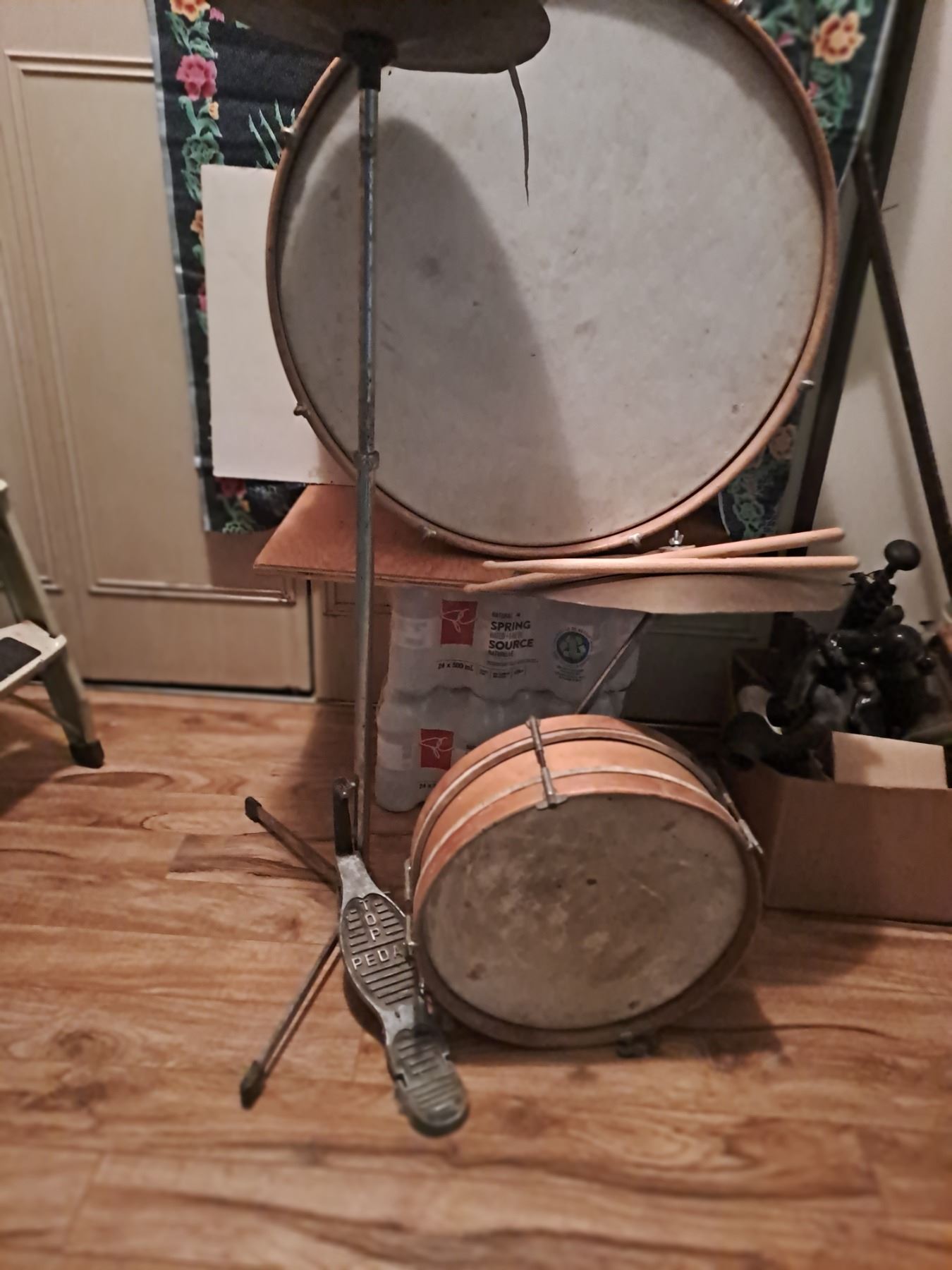 Vintage Two Drum set with Hi-Hats and Crash Cymbals and drumsticks, the front of the Bass Drum requires repa