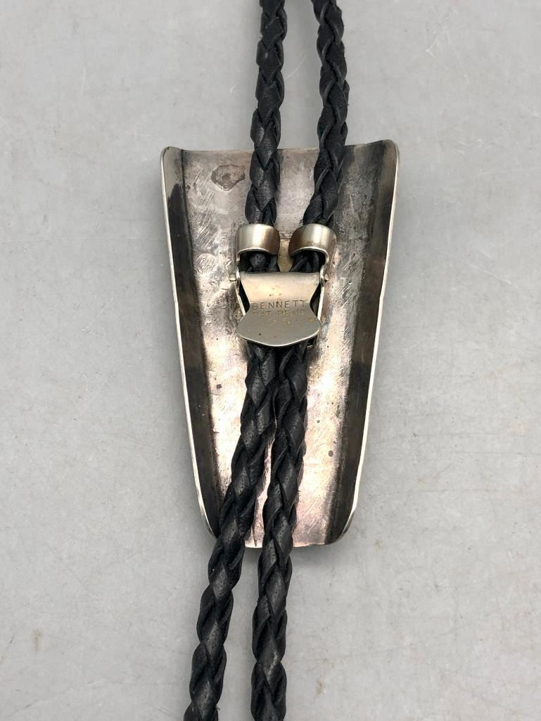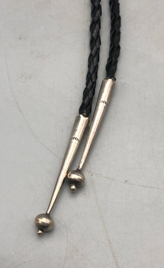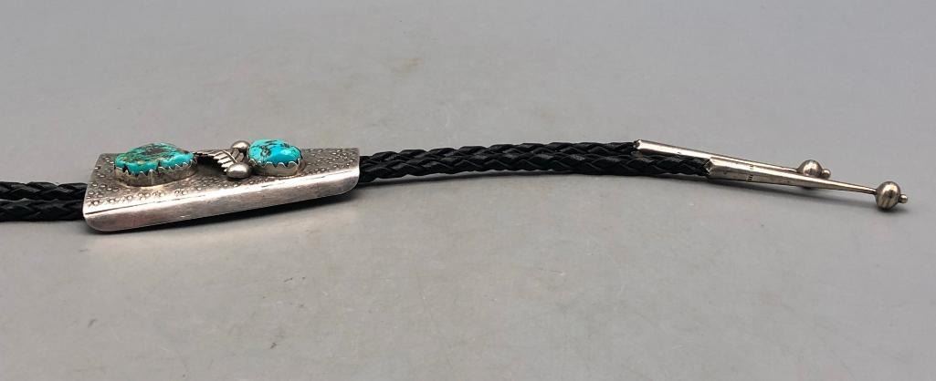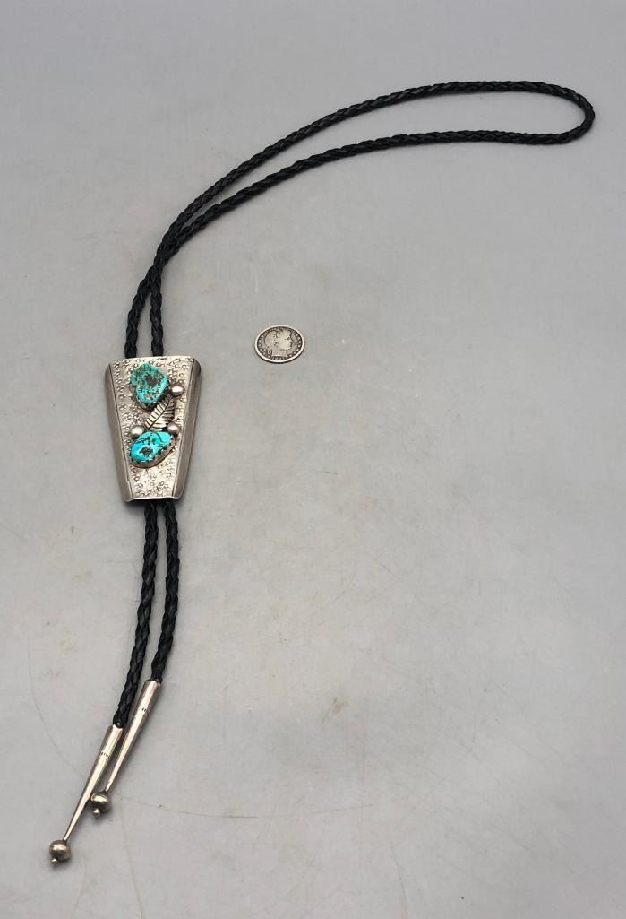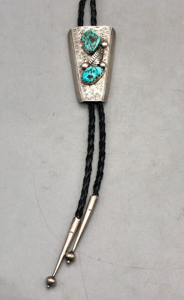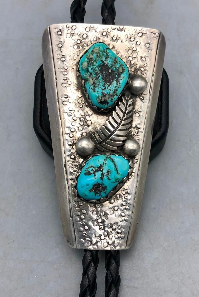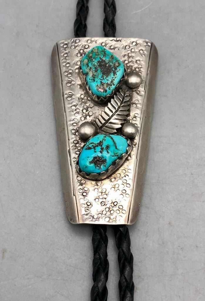 For sale in this lot is a vintage two stone turquoise bolo tie. This is a neat bolo featuring a textured background with silver leaf applique and silver dot accents. The two turquoise cabochons are in handmade bezels and it is sterling silver. Maker: Unmarked. Approx. Age: Circa 1960s. Size: Cord measures 46 inches long including tips. Slide measures 3-1/8 inches long X 1-3/4 inches wide. Weighs 64.1 grams. Condition: Good for its age, normal wear expected. Please look closely at the pictures - they are an important part of our description. Shipping: There will be a $5 handling / packaging fee for shipping this lot. The actual cost of postage will be added on top of that. BUY IT NOW: If you would like to buy this item now without waiting for the auction to end (this option is only available up to 48 hours before the auction starts to close), the “Buy it Now” price is the high estimate of this lot. If you would like to end the auction early and pay the high estimate (plus applicable fees), please contact us by phone or email and reference this lot number.