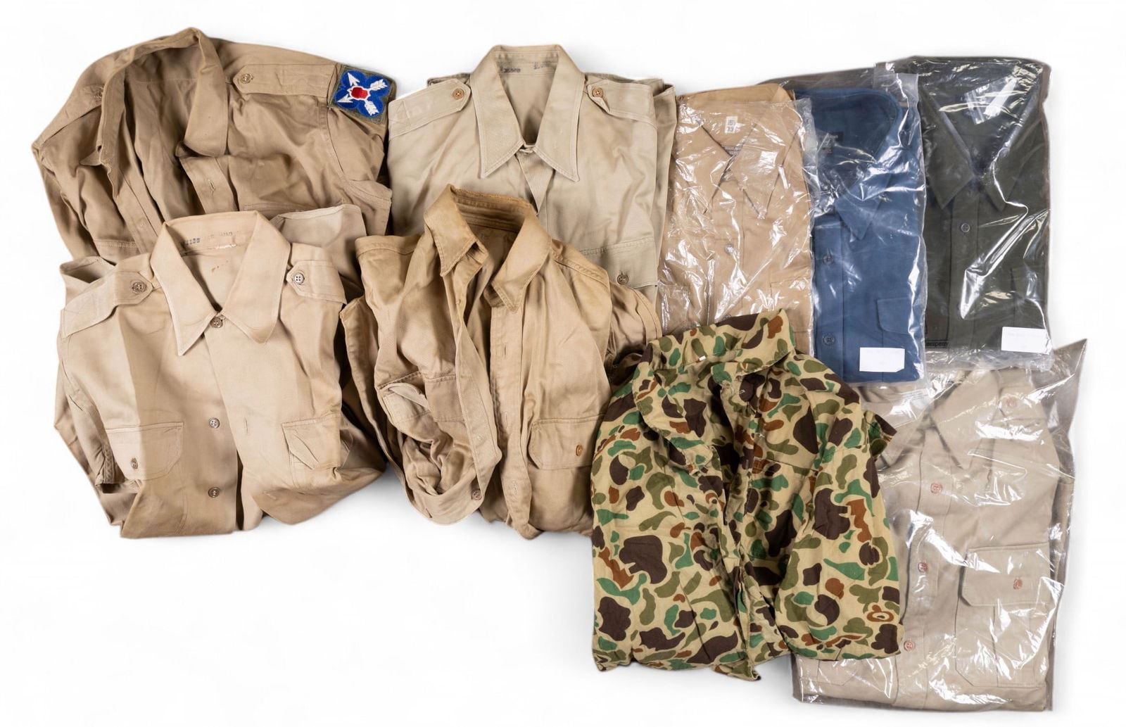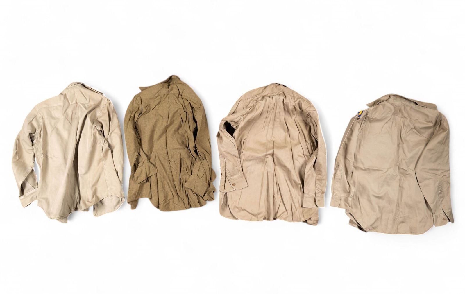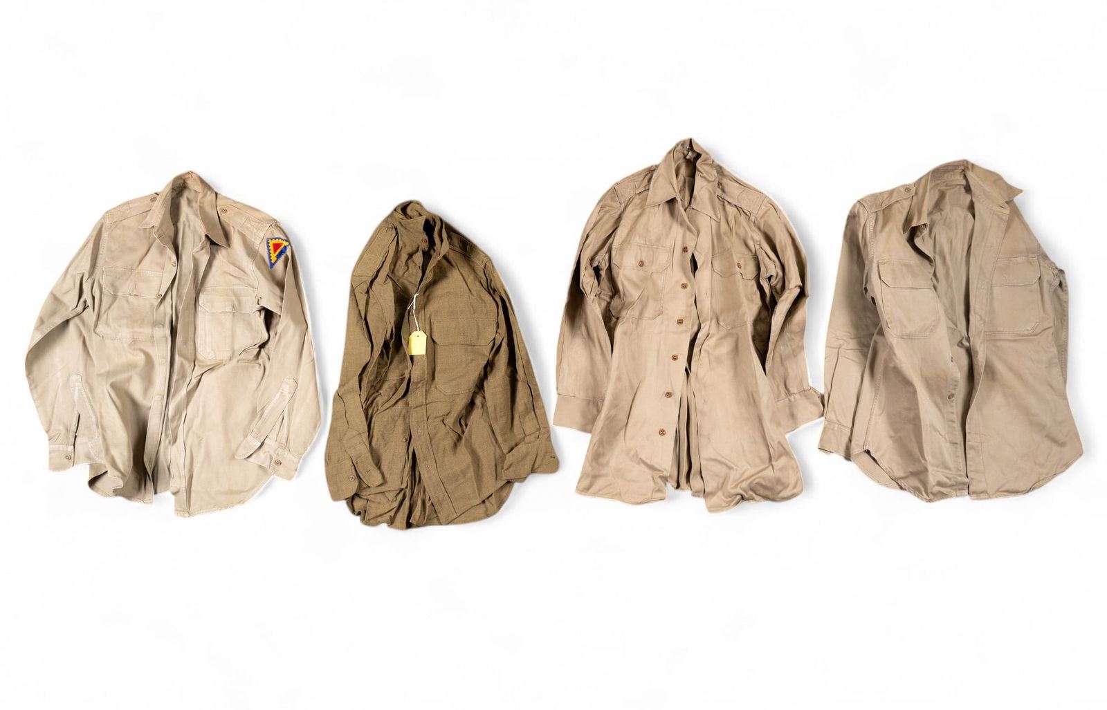 A collection of US Army issue collared shirts, some wool, some a cotton blend, sizes 33-40, some have insignia of WWII 21st Army Corps and WWII 2nd Army.