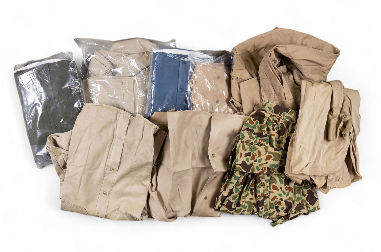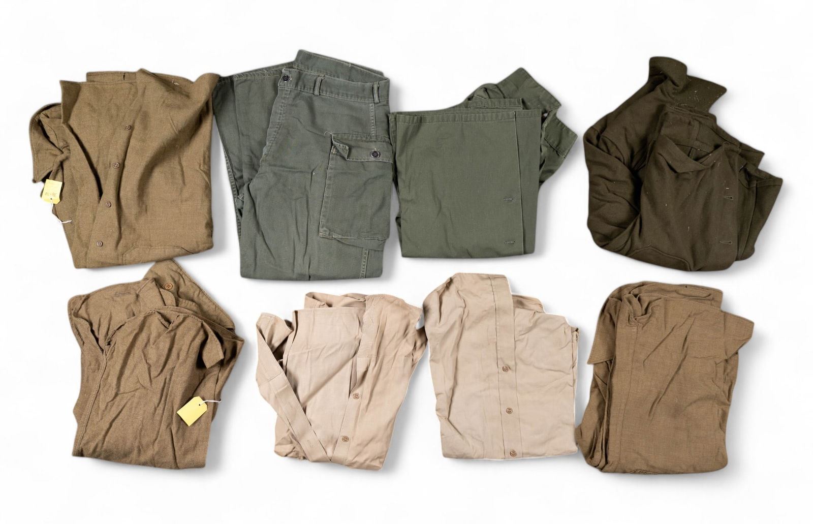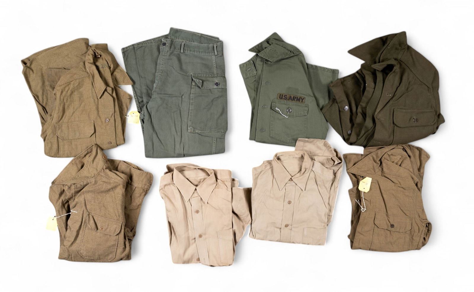 A collection of US Army issue collared shirts, some wool, some a cotton blend, sizes 33-40, some have insignia of WWII 21st Army Corps and WWII 2nd Army.