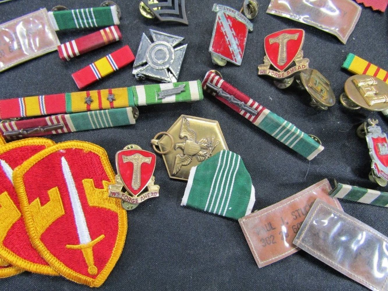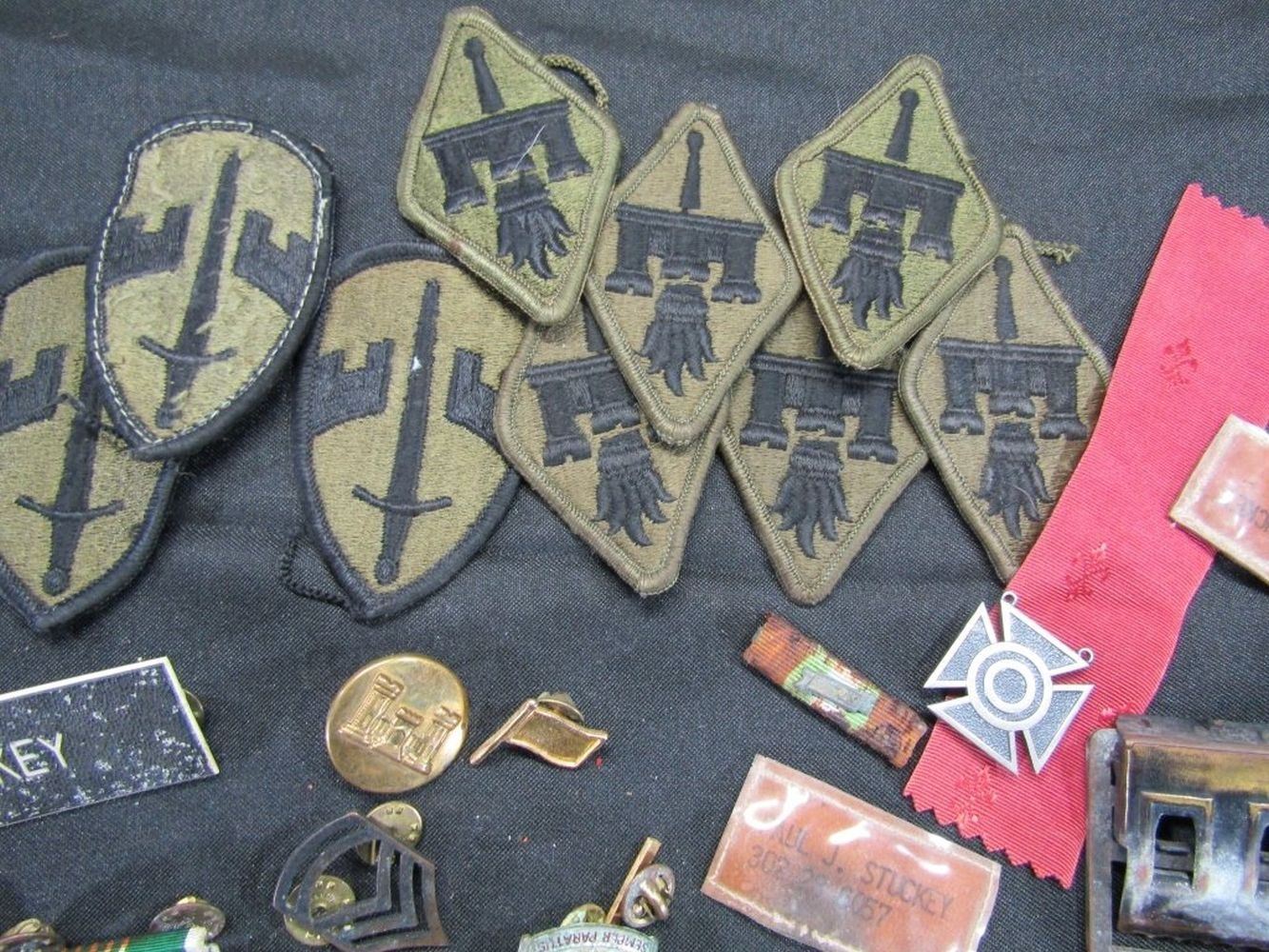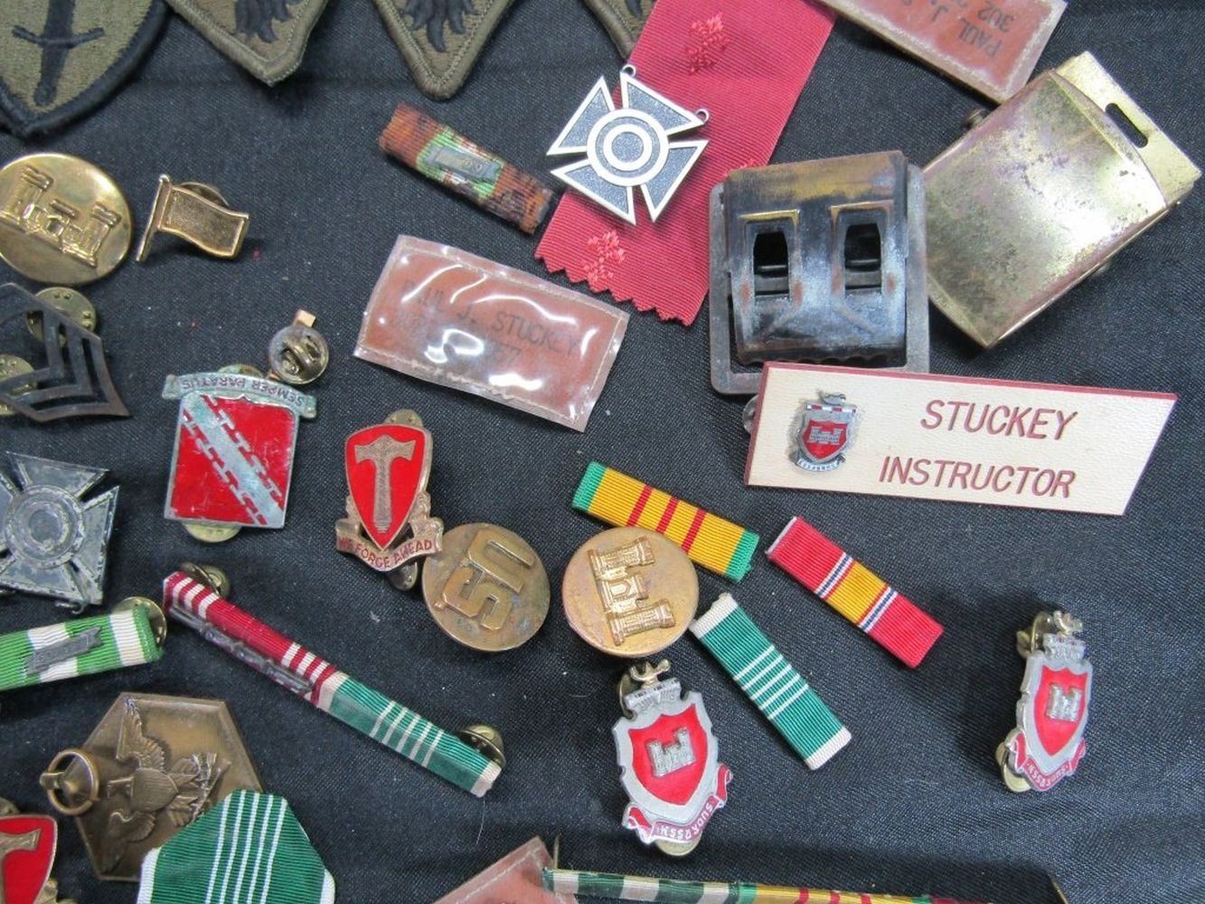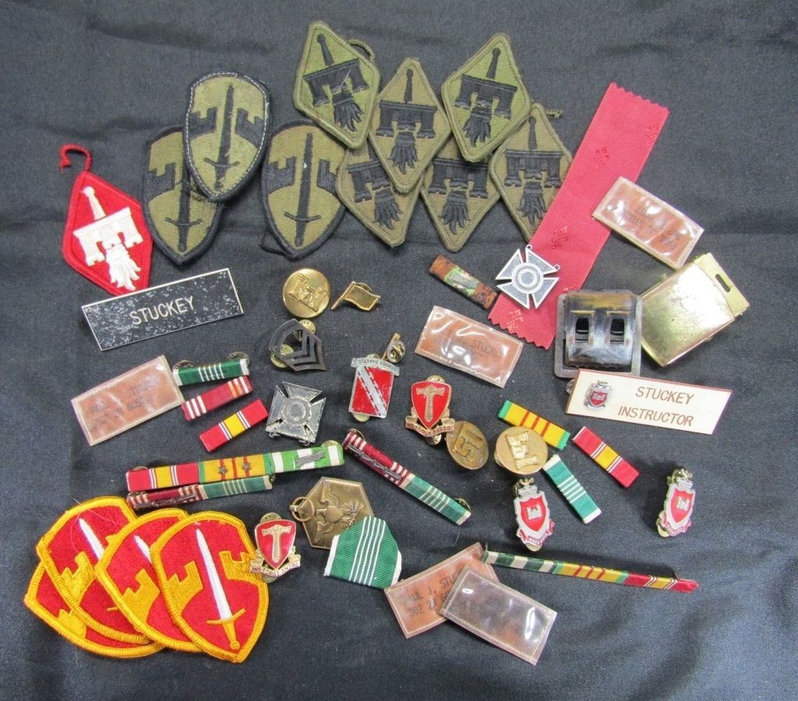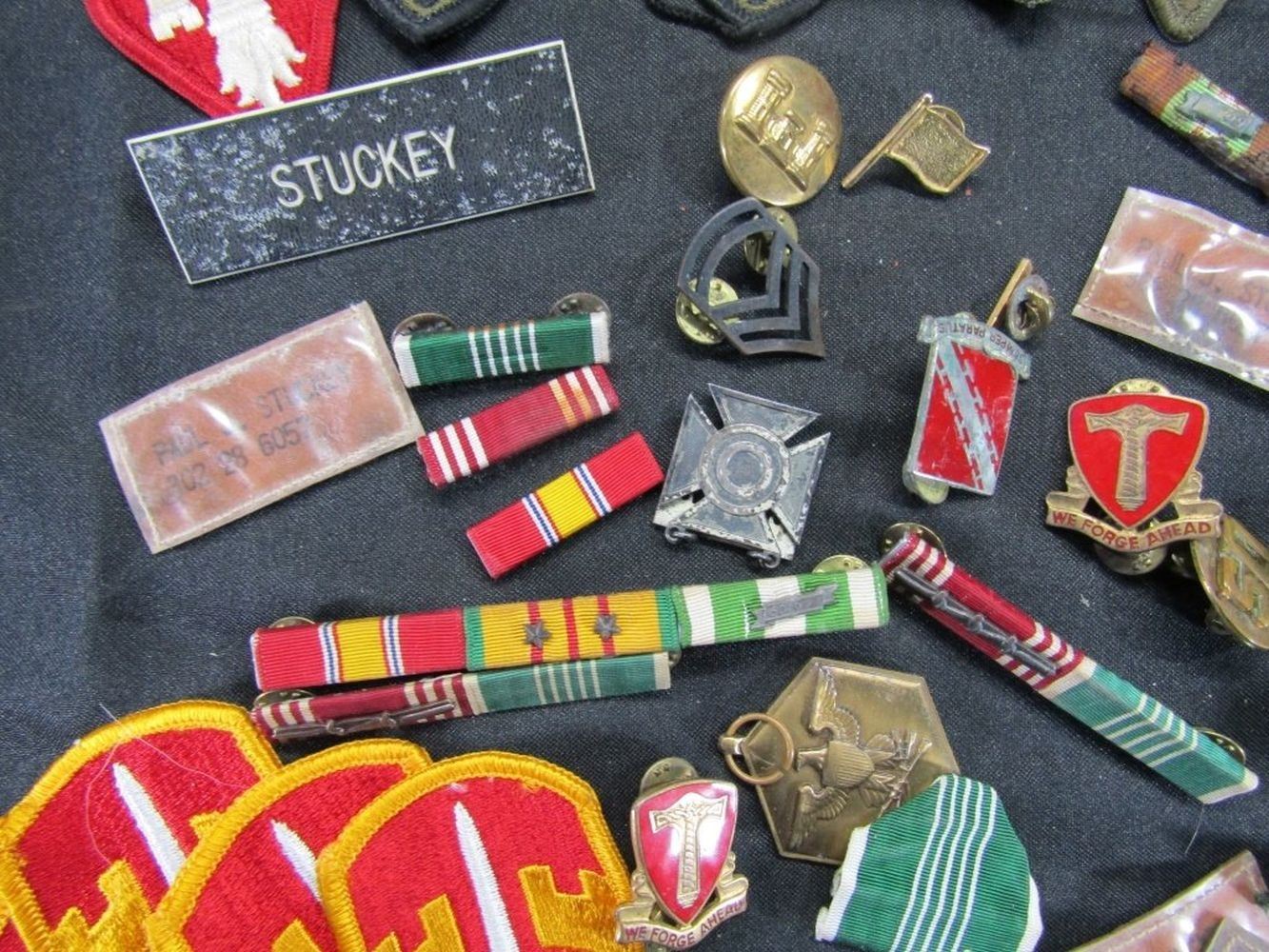 Named to a SGT Stuckey. Some ribbon bars, unit crests, a bunch of patches, name plaques, sterling sharpshooter badge & more!