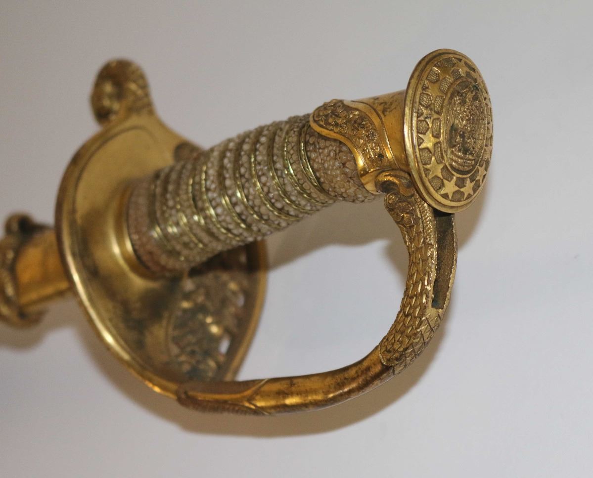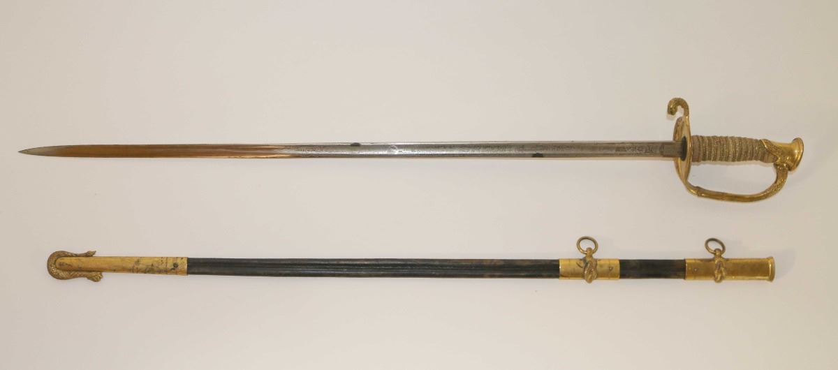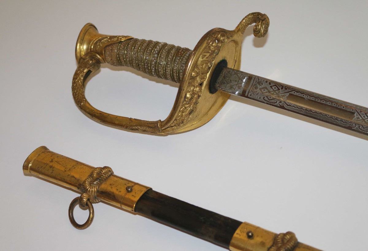 Vintage U.S.N. officers sword with etched blade and leather scabbard, produced by The W. M. Freeny Co. of Washington D.C. with markings on the ricasso. Stamped "143" several times on the scabbard. In overall very good condition showing age.