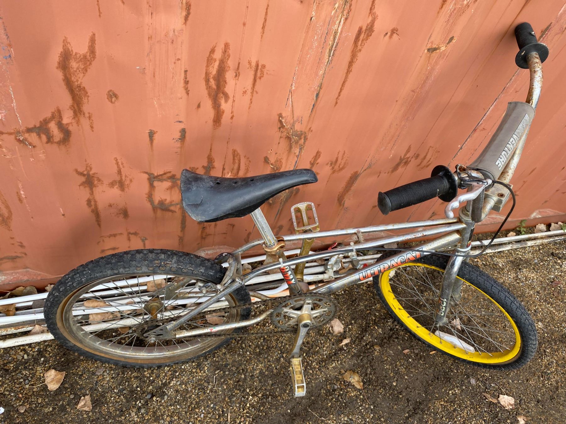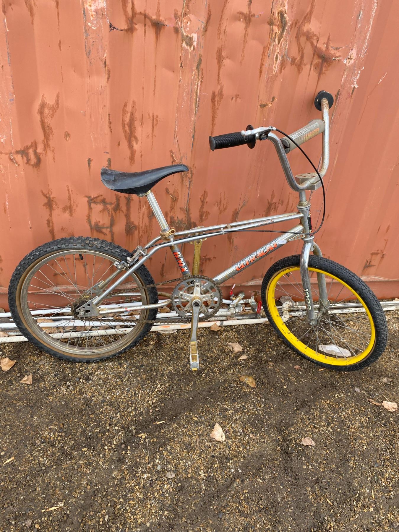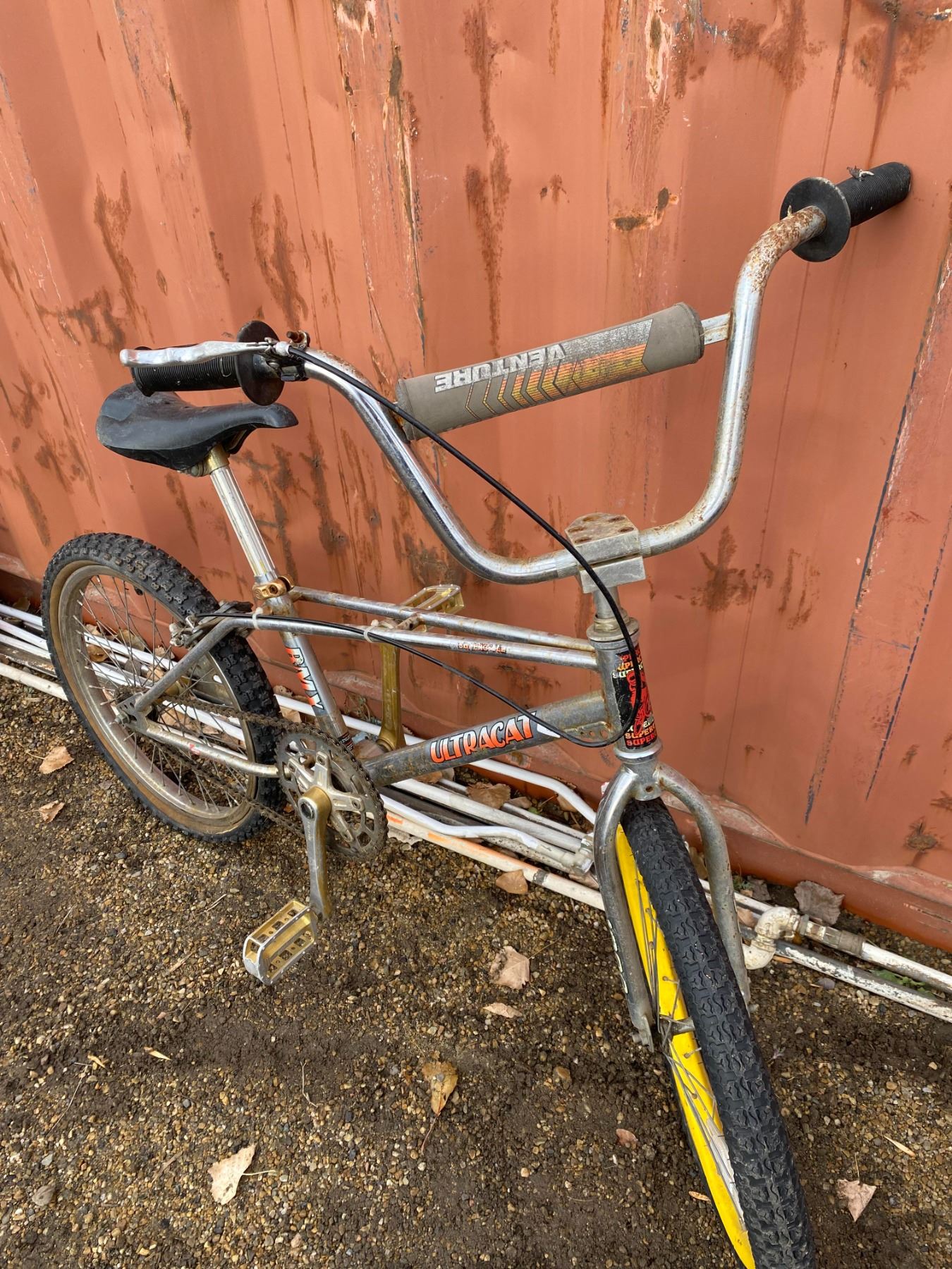 Retro Ultracat BMX bicycle with chrome frame and yellow front wheel. Shows significant wear and outdoor exposure great for parts, restoration, or nostalgic display.