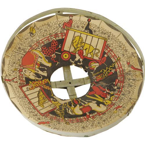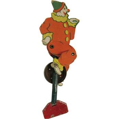 <B>Vintage Unicycle Riding Circus Clown Wind-up Toy.</B></I><BR>Painted tin base with cardboard clown figure and cardboard "big top" with metal frame, no maker marks extant, 9" diameter "big top," 5" tall overall.<BR><B>Condition</B></I>- Toy is in working condition with only light play wear and some slight chipping to the base of the cardboard of the "big top," else very good.<BR><BR><b>Shipping:</b> Miscellaneous Collectibles, Larg (<a target="_blank" href="http://www.heritageauctions.com/common/shipping.php">view shipping information</a>)