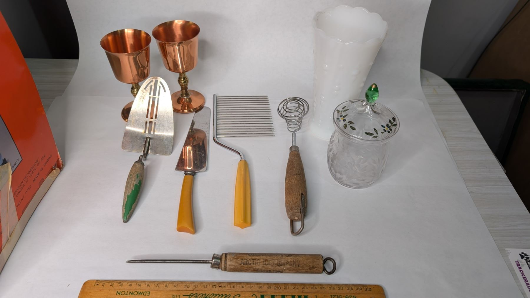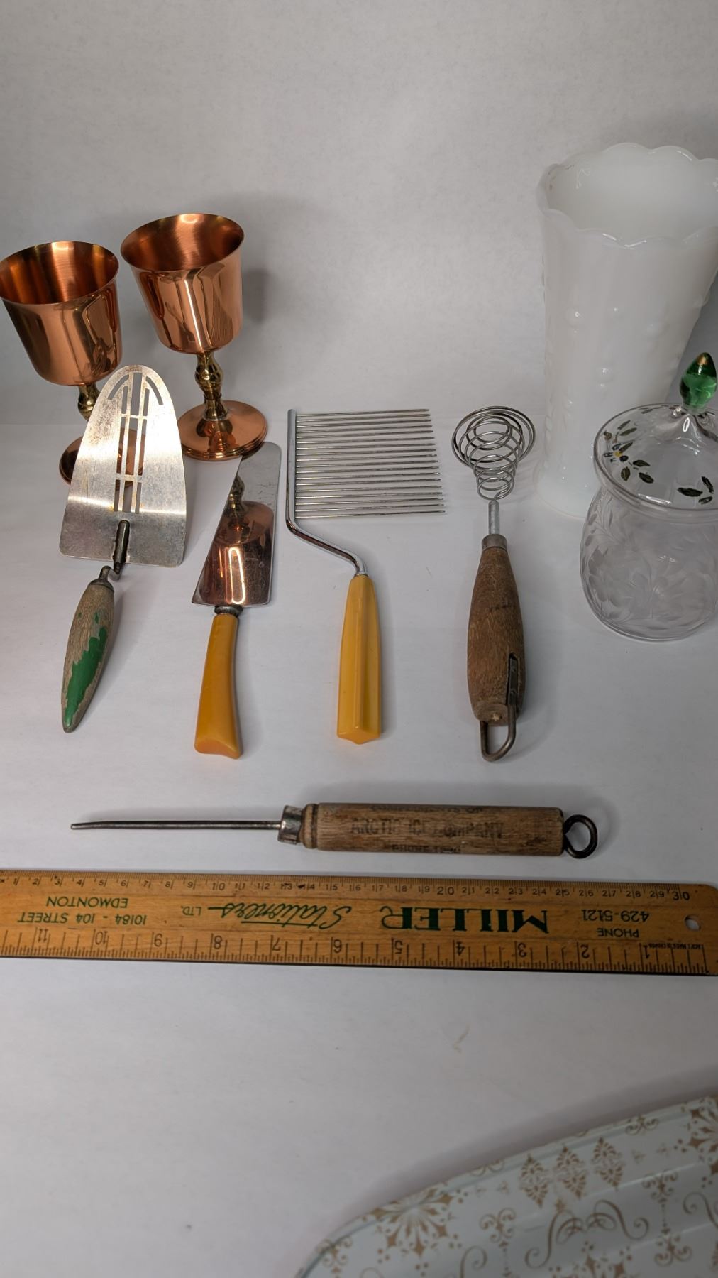 Vintage Utensils & Milk Glass including Advertising Ice Pick