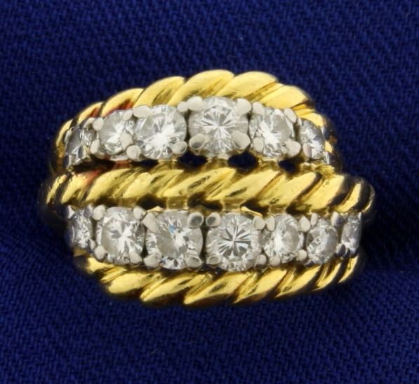 In 18k yellow gold, containing 13 very high quality diamonds of VS clarity/G color. Rope style ring. Stamped "Made in France" and "VCA NY". Size 3. 9.9g.