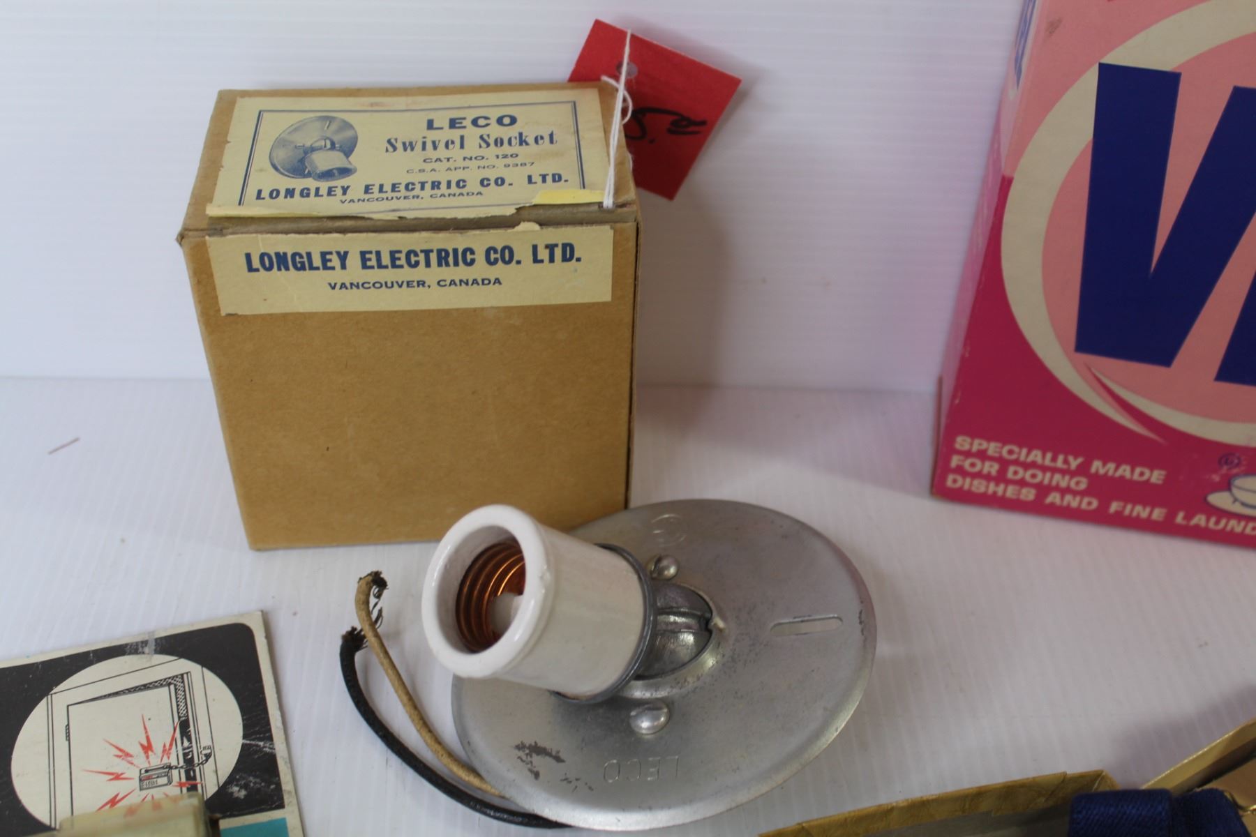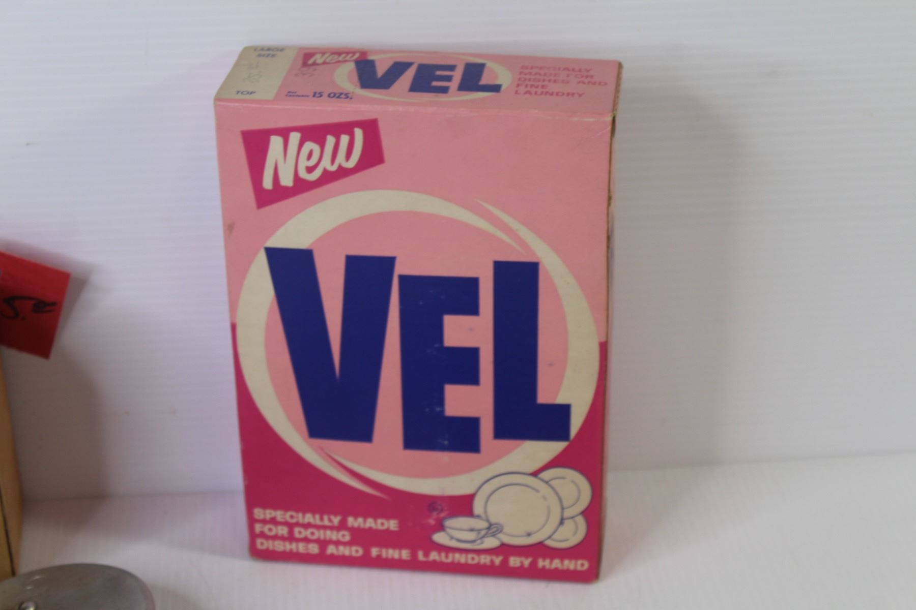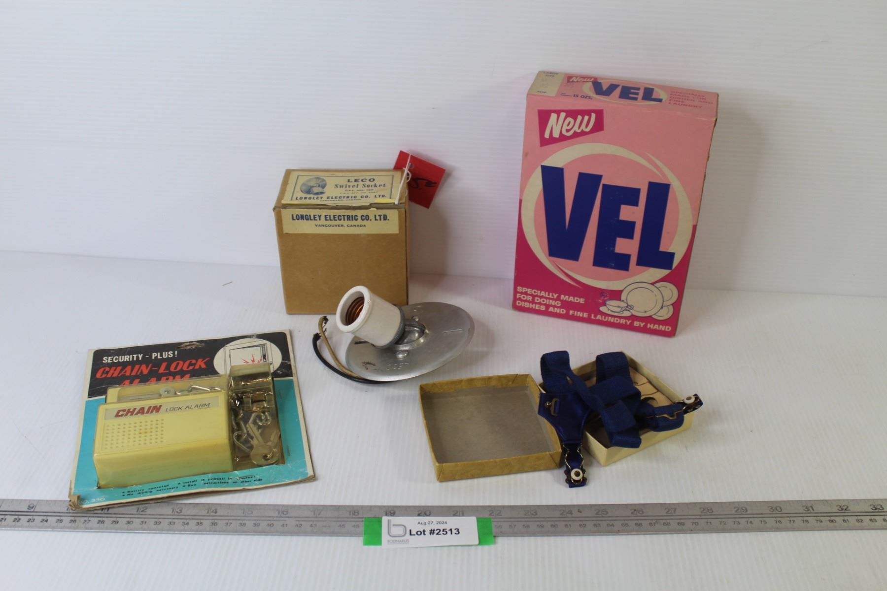 Vintage Vel Dish & Laundry Soap - Chain-Lock Alarm - Swivel Light Socket - Sock Garters