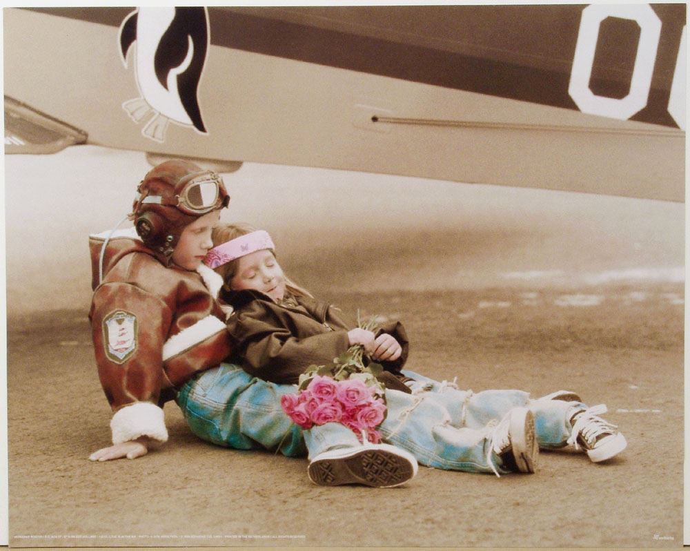 This is a vintage photo print by Don Verslyken titled Love Is In The Air. Adorable tinted photography. Boy wearing a little bomber jacket similar to a WWII jacket. Imagery like Kim Anderson's. Verkerke Poster, Holland. Printed in Netherlands. SIZE: Approx. 20" x 16".