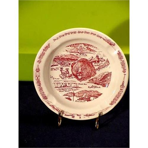 Snow and Icebergs, mountain goats, walrus and more are on this great Alaska Ashtray by Vernon kilns. Details in this Alaska ash tray by Vernon Kiln USA, and marked such on the back, are wonderful. It is a Red transferware ashtray and it has a Bear in the center (I believe it is a Kodiak Bear), Juneau Capitol of Alaska; Alaska glacier; Dutch Harbor; Mount McKinley; Sitka Navy Ship base; and walrus and seals surrounding the bear. On the rim of this ashtray is a dogsled team which I have pictured in the photograph, and an Eskimo village with an igloo, and totem poles. This is a wonderful vintage Vernon Kilns ashtray and it measures 5 3/4" across. It is marked on the bottom. I have taken a number of photos so you can see the details.<p>If you can't go to Alaska yourself, this is a great piece to make you feel like you've been there. There are 2 available so buy one or both!<p>Treat yourself to this wonderful collectible item! I sure hope you have fun shopping in my store, please visit again and bookmark me so you can find me easily! Please email me any questions you have and to ask for shipping costs. I welcome International and USA buyers and I also combine shipping. Please check out my favorite sites for my other great places to go, for my auctions, and my Blog about Antique and Collectible Collecting is FUN!
