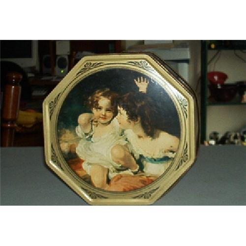 Featuring a lovely decorative, victorian designed tin. The lid has two small children dressed in Victorian style dress. The octogan shaped tin also has a handle and the sides are decorated with great art work such as: "Dancers Practicing At The Bar" (Artist-Degas); "The Horse Fair" (Artist-Rosa Bonheur); "Peace And Plenty" (Artist-George Inness) and "Northeaster" (Artist-Winslow Homer). A great, vintage tin to add to your collection. Excellent Condition.