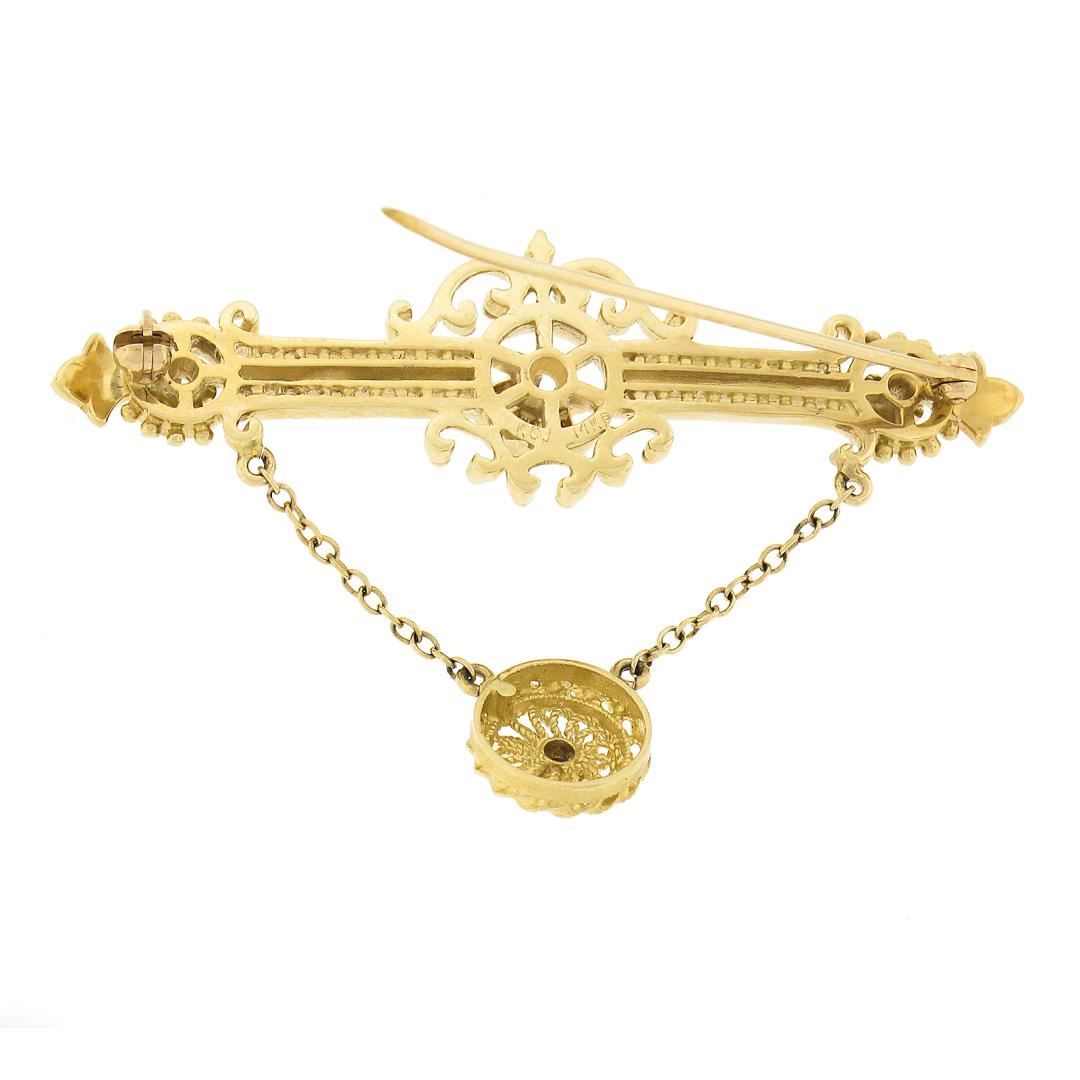 A vintage solid 14k yellow gold brooch, with 4 brilliant cut natural diamonds (F/G - VS1/VS2 ; 0.38ctw). Measures 38.1x58.2mm and weighs a total of 9.87 grams.