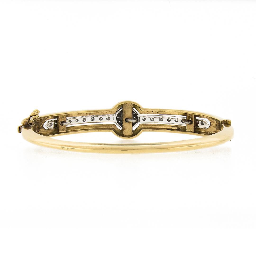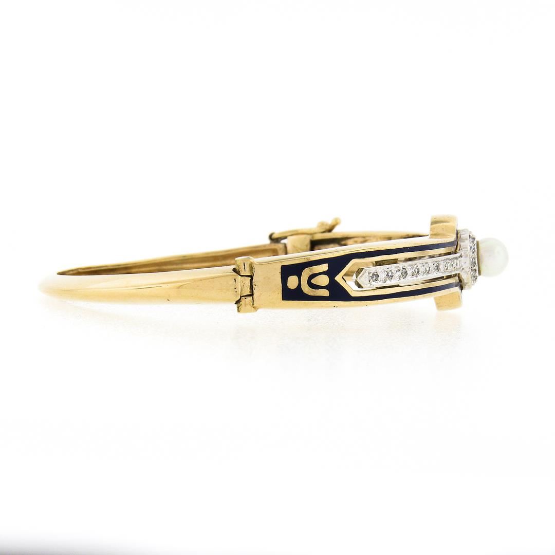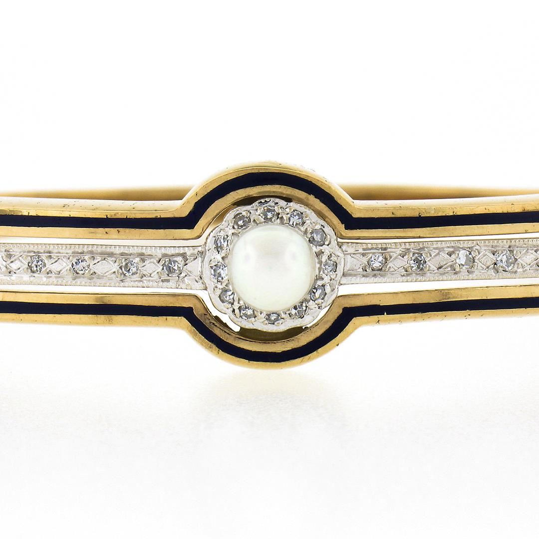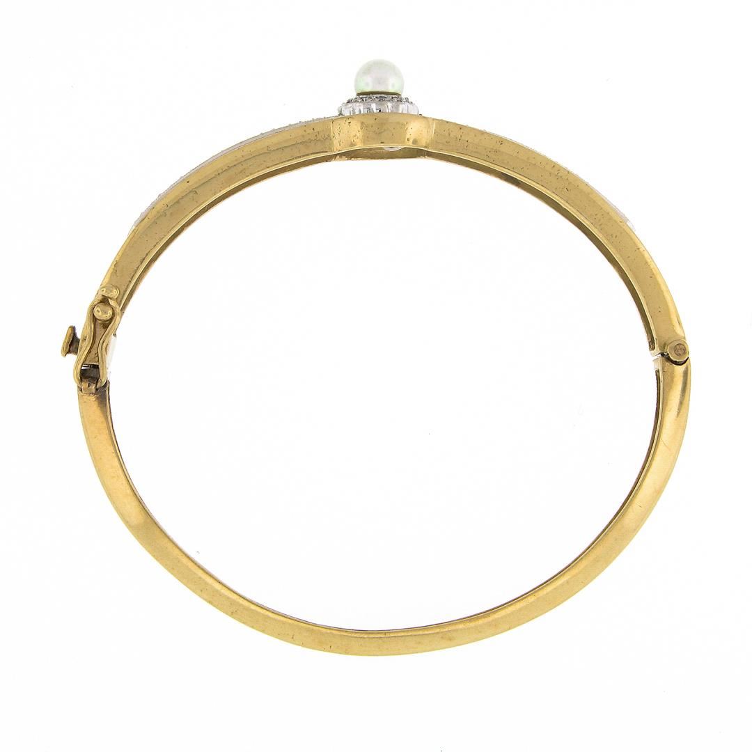 A vintage solid 14k yellow gold bangle bracelet, featuring 30 single cut natural diamonds (G/H - SI1/SI2 ; 0.30ctw), and 1 round shape cultured pearl (5.3mm). It weighs a total of 18.12 grams, measures 12.7mm wide, and measures 6.25 inches in length.