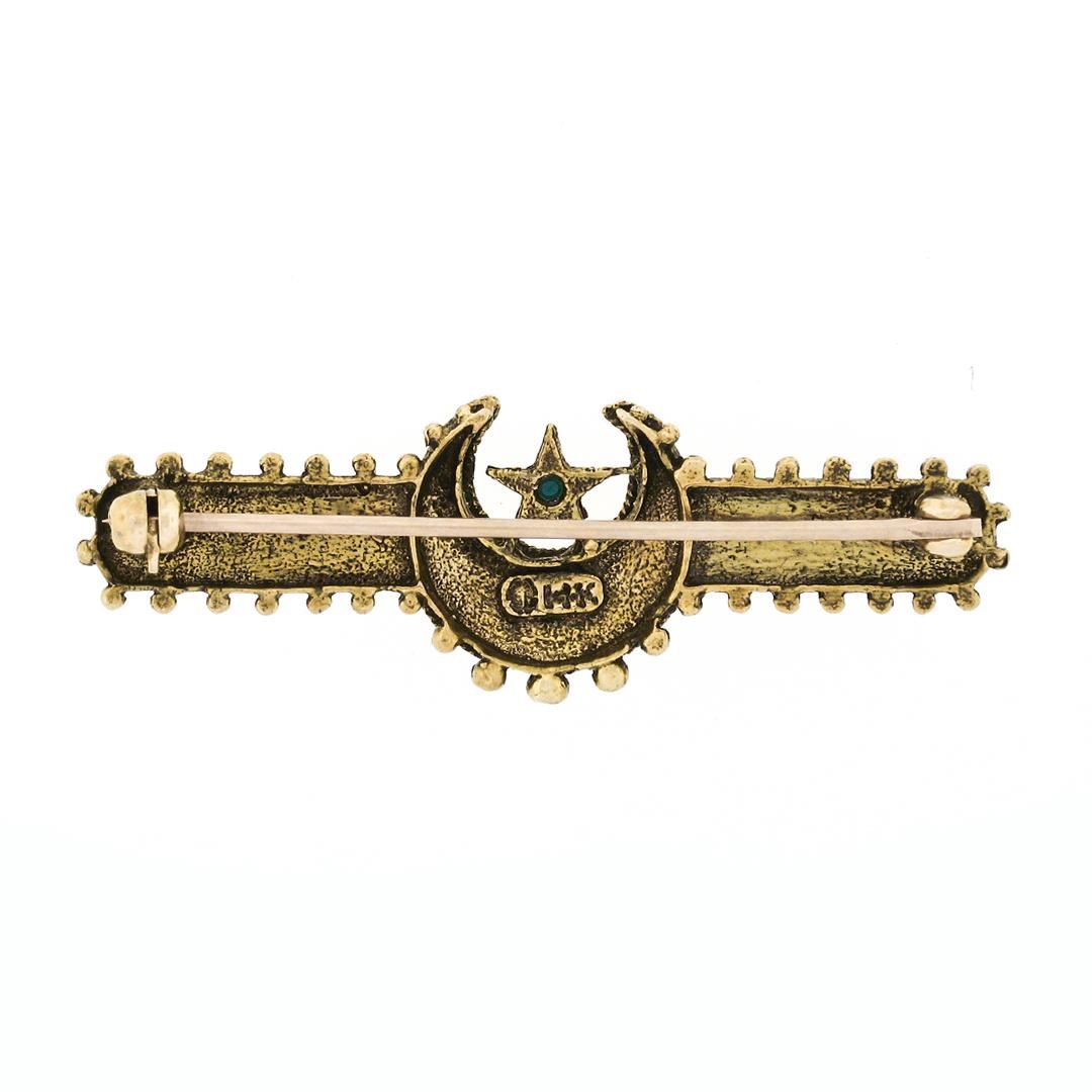 A vintage vicotrian revivial 14k yellow gold bar bpin brooch, with 1 round cabochon cut natural truquoise (1.70mm). Measures 13.47x41.13mm and weighs a total of 3.70 grams.