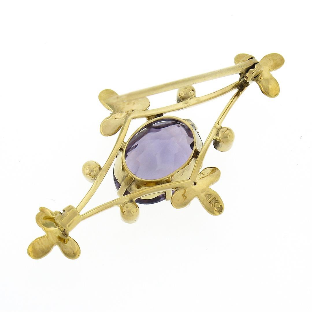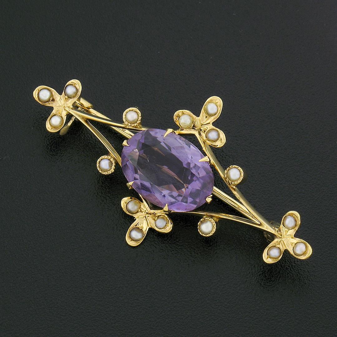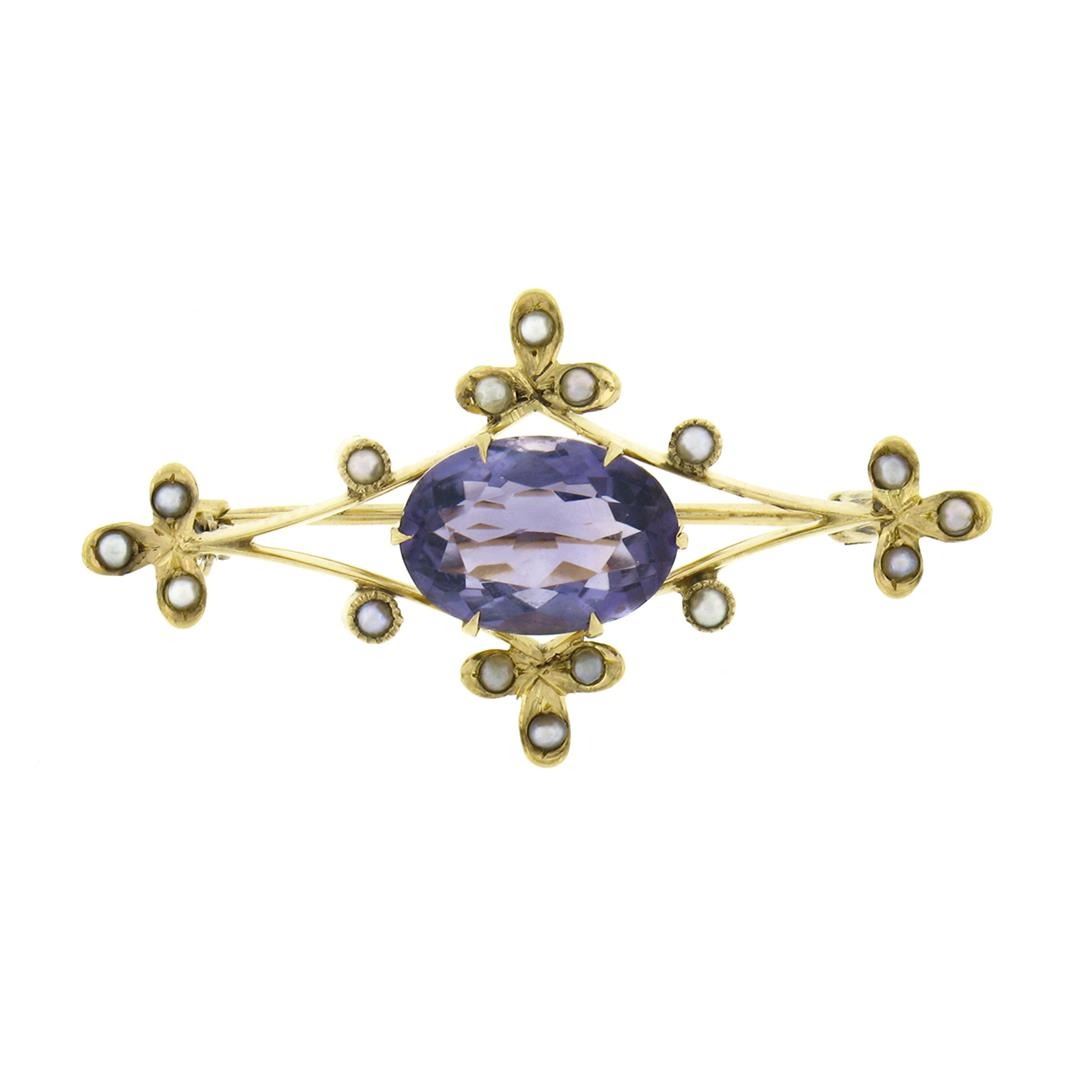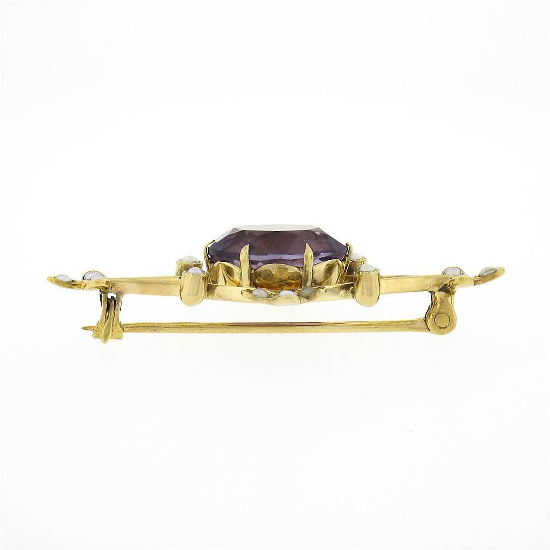 Vintage Victorian Revival 14K Yellow Gold Oval Amethyst & Seed Pearl Pin Brooch