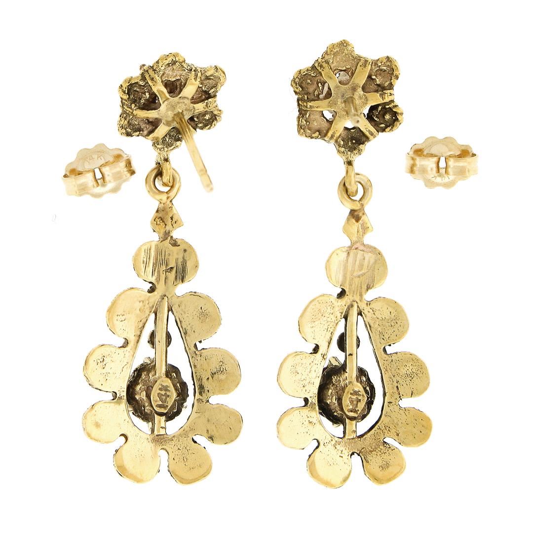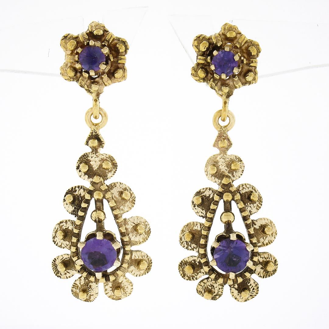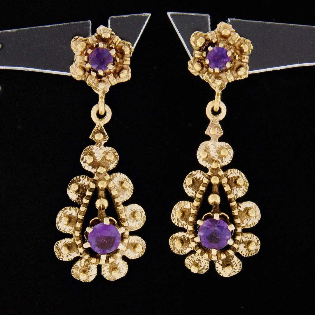 A vintage solid 14k yellow gold dangle earrings, with 4 round brilliant cut natural amethysts (1.50ctw ). The earrings measure approximately 36.40x13.20mm and weigh a total of 6.19 grams.