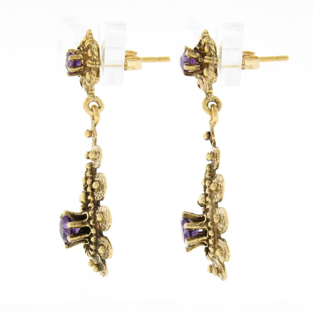 A vintage solid 14k yellow gold dangle earrings, with 4 round brilliant cut natural amethysts (1.50ctw ). The earrings measure approximately 36.40x13.20mm and weigh a total of 6.19 grams.