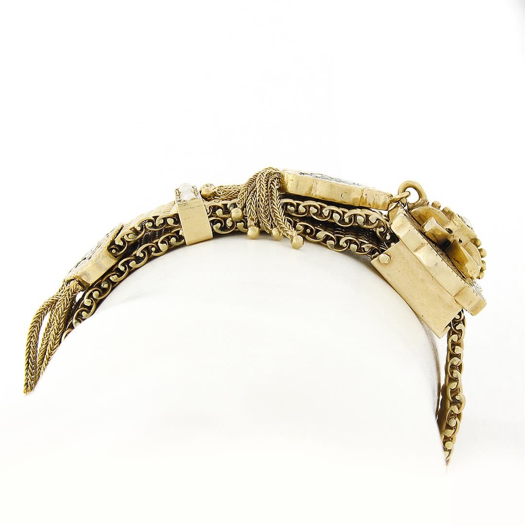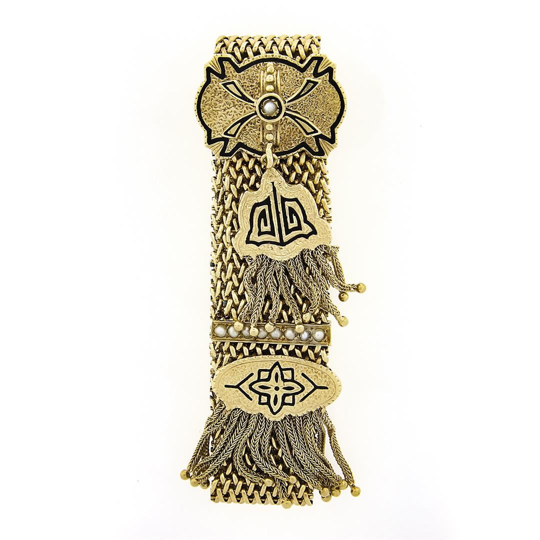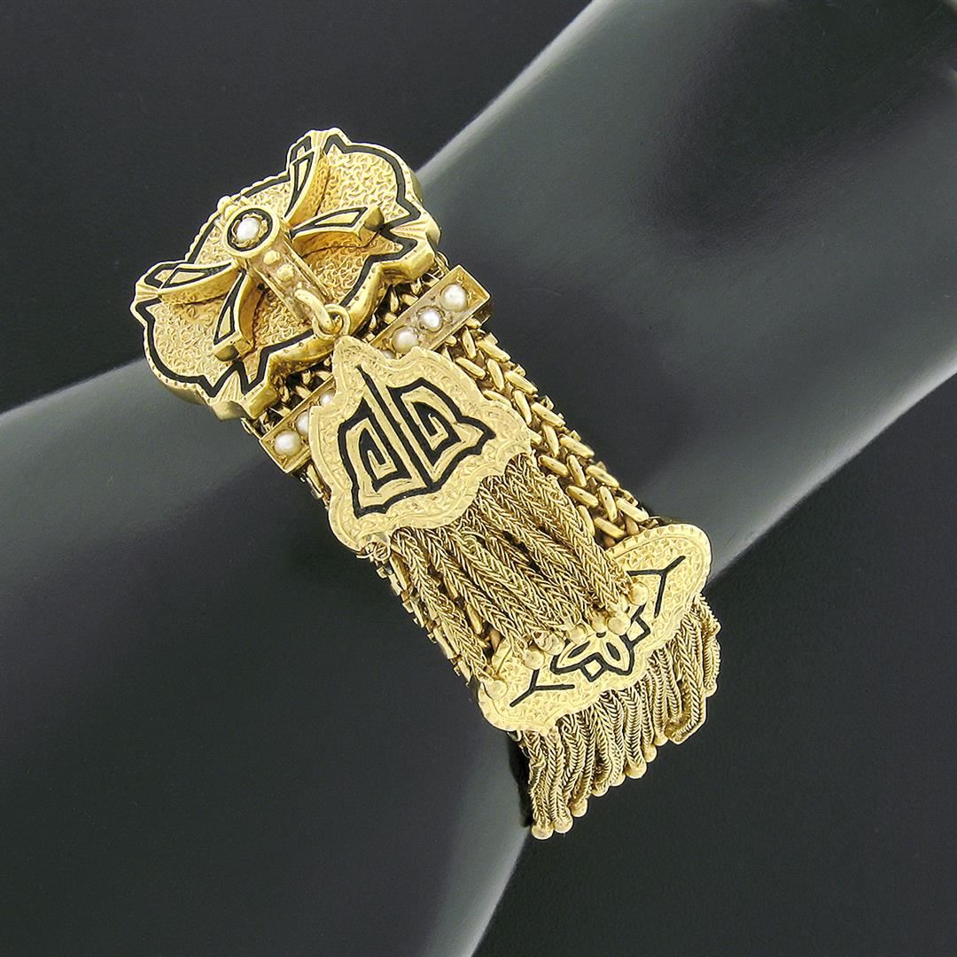 A solid 14k yellow gold tassel mesh bracelet. with 9 round shape cultured seed pearls (1.9-2mm). It weighs a total of 63.48 grams, measures 26mm wide, and measures 7.75 inches in length.