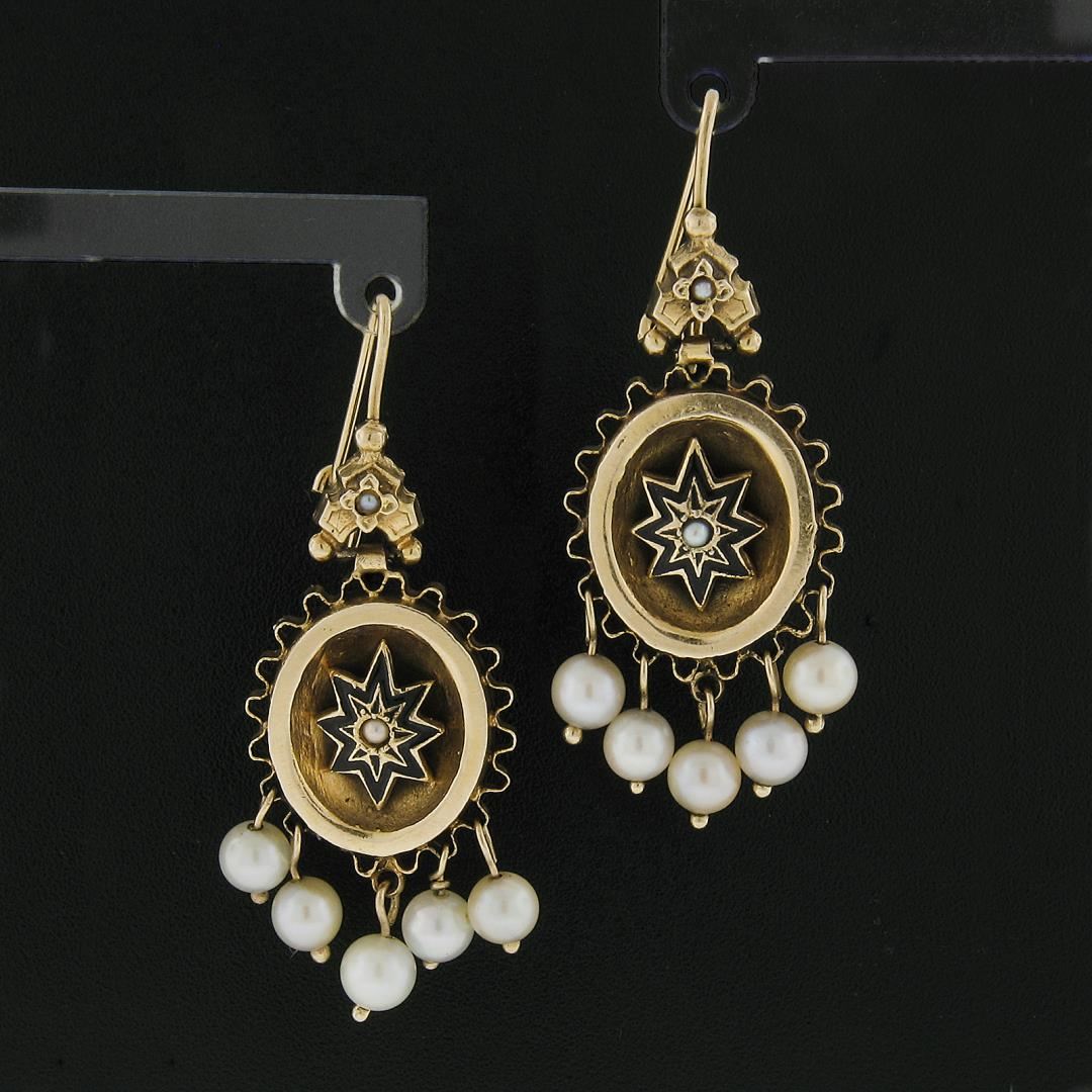 A vintage solid 14k yellow gold dangle drop earrings, with 4 round seed pearls (1.4 to 1.8mm ), and 10 round cultured pearls (4.3 to 4.5mm). The earrings measure approximately 43.5x17.1mm and weigh a total of 4.31 grams.