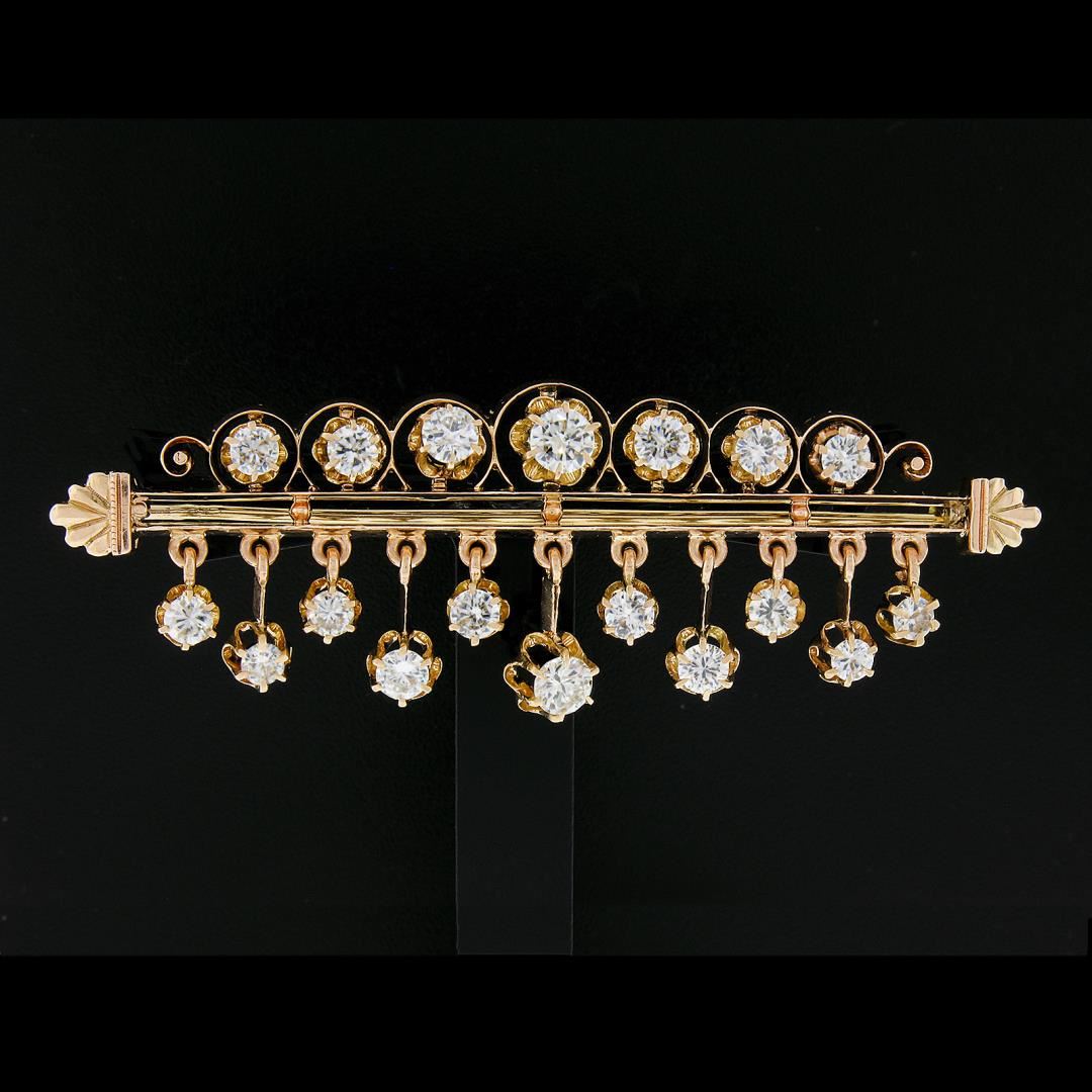 A vintage solid 14k rosy yellow gold dangle brooch, with 18 round and old transitional cut natural diamonds (G-I - SI1-I1 ; 3.26ctw). Measures 24x70.7mm and weighs a total of 15.56 grams.