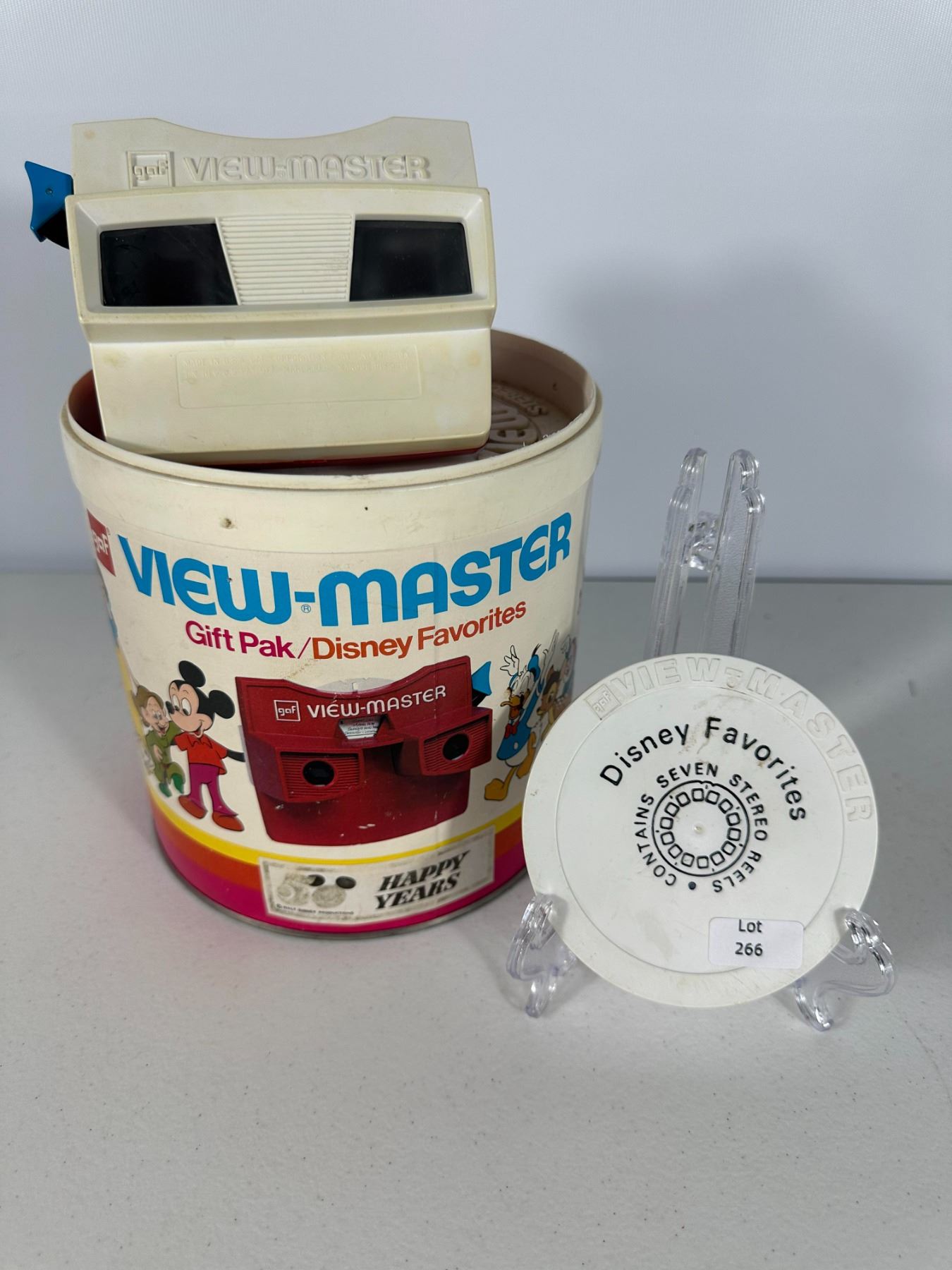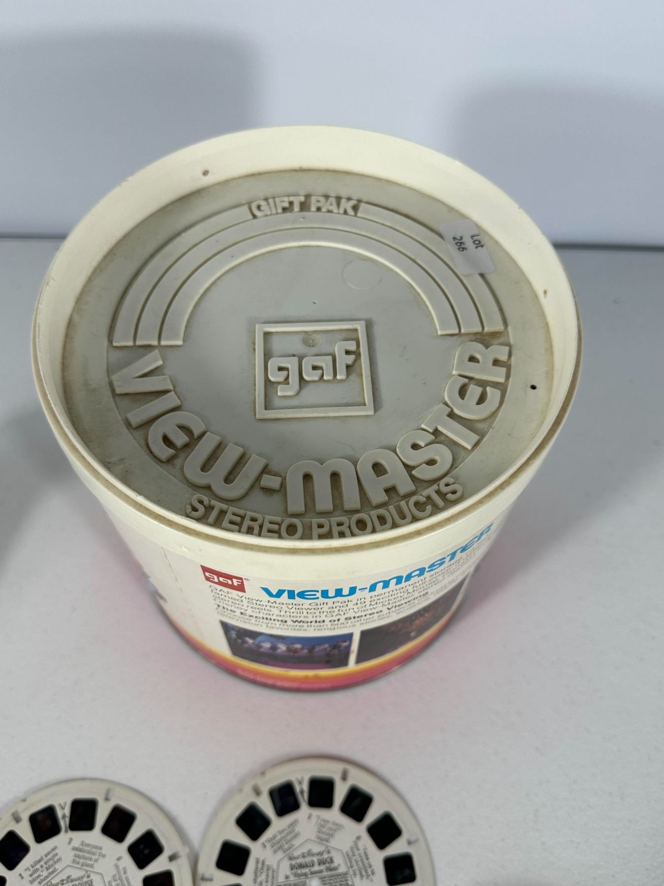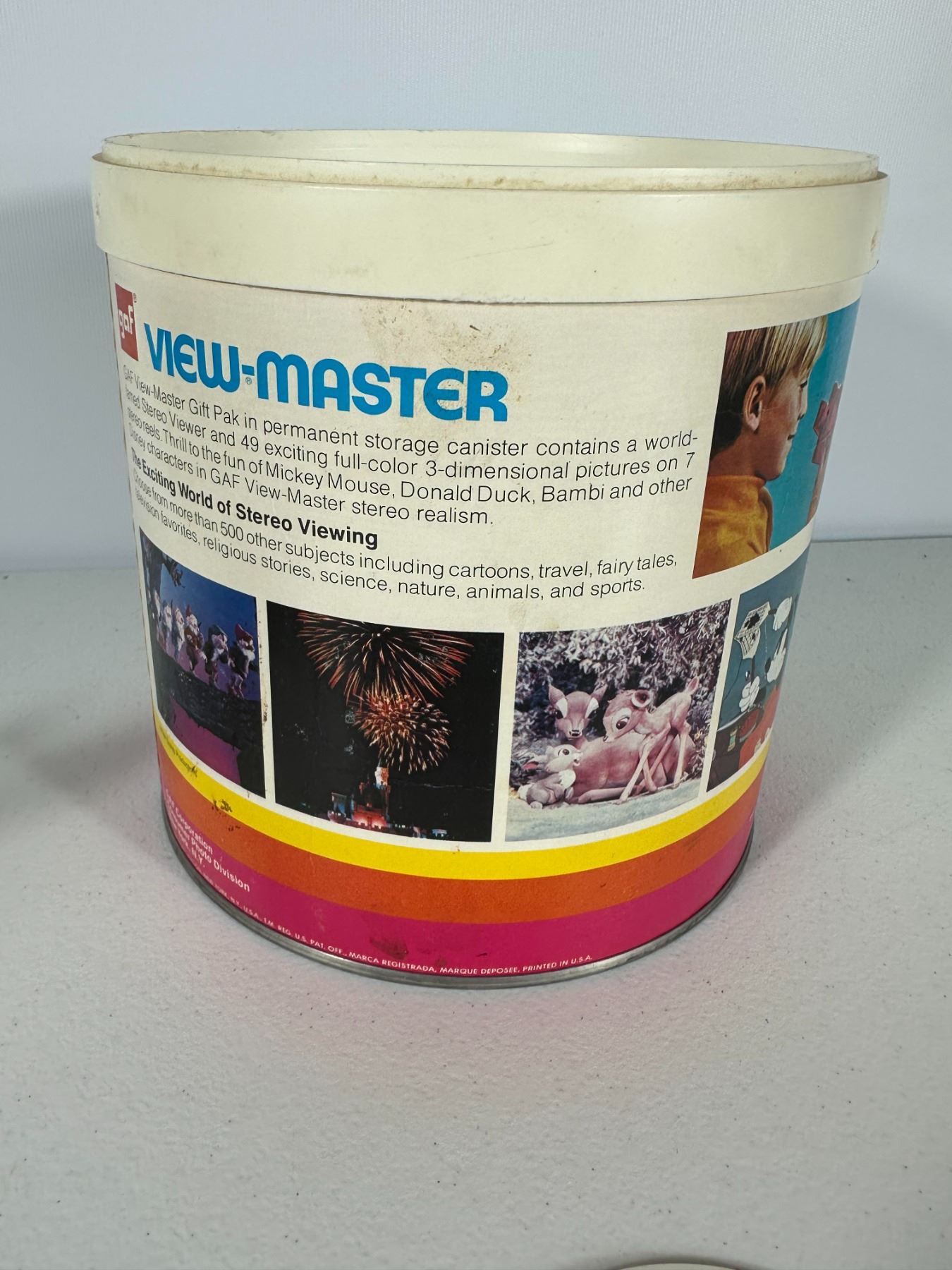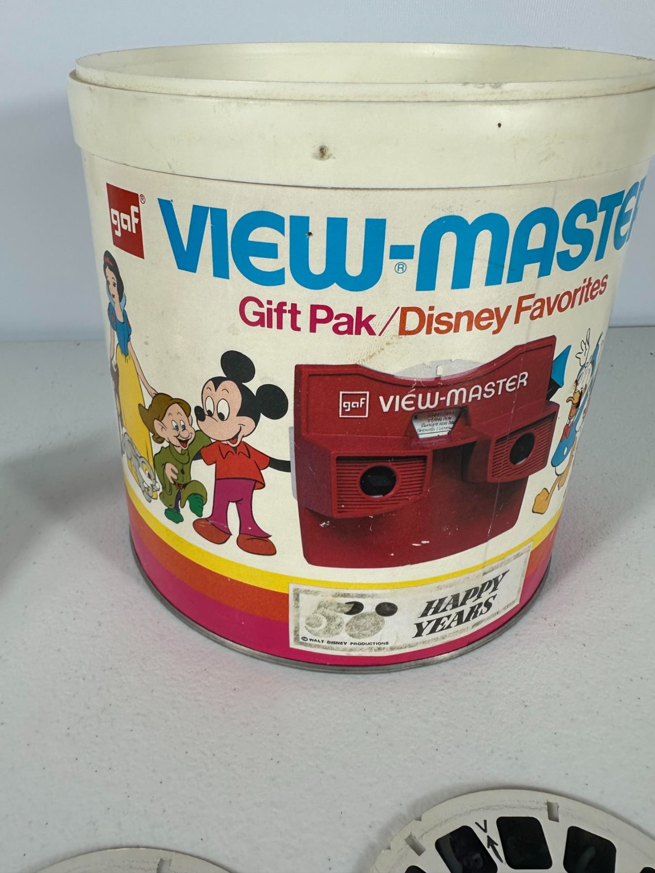 Original View-Master Gift Pak featuring Disney characters, includes viewer and seven stereo reels. Classic collectible from GAF with colorful Disney graphics on the packaging.