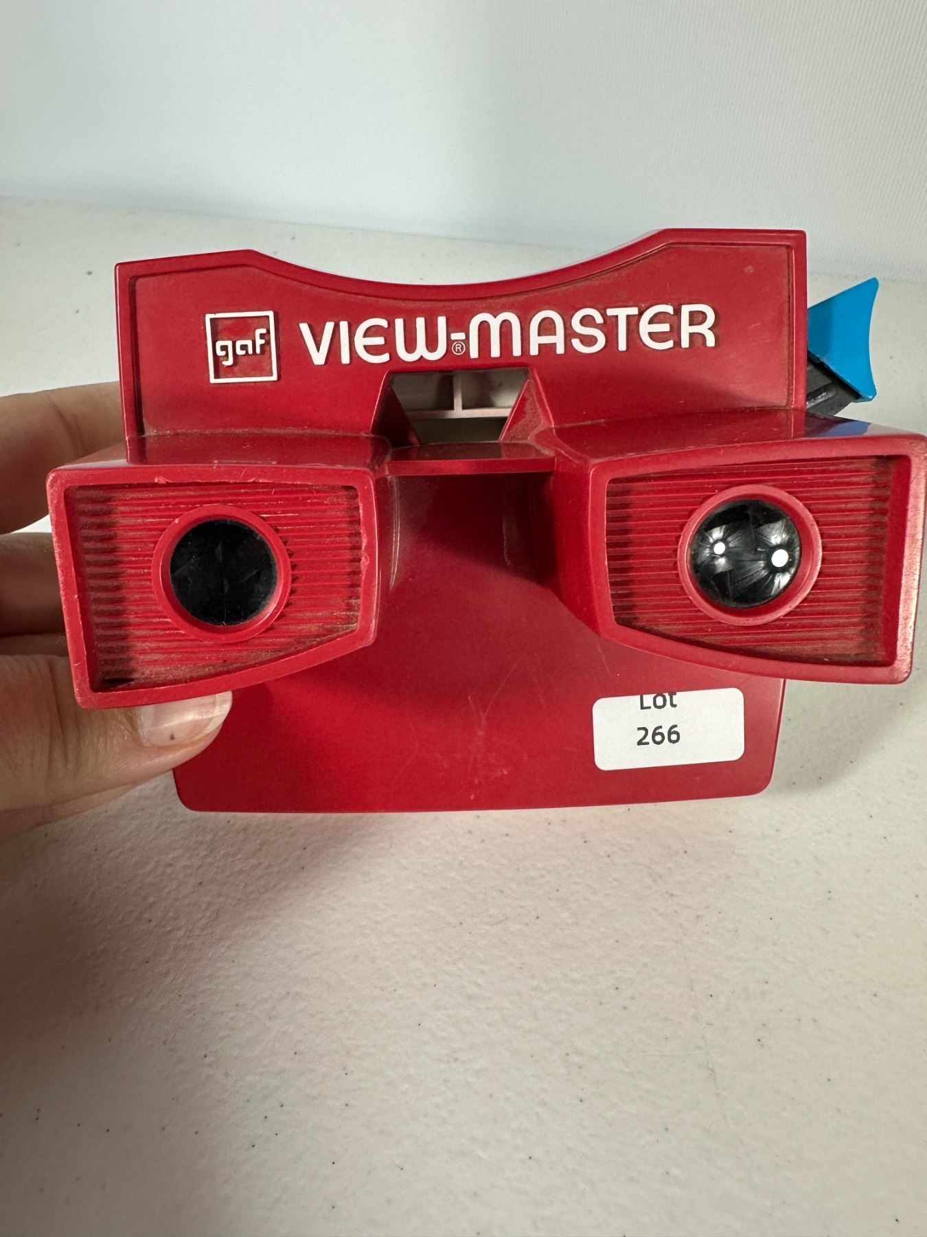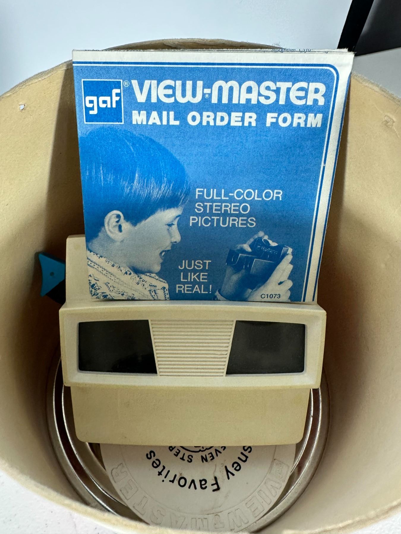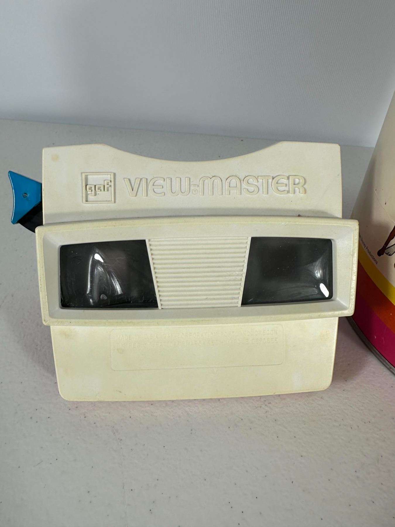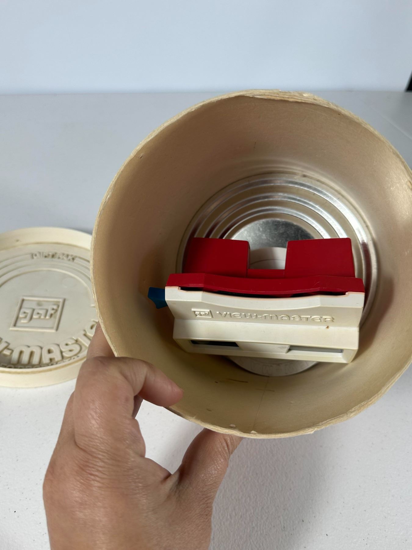 Original View-Master Gift Pak featuring Disney characters, includes viewer and seven stereo reels. Classic collectible from GAF with colorful Disney graphics on the packaging.