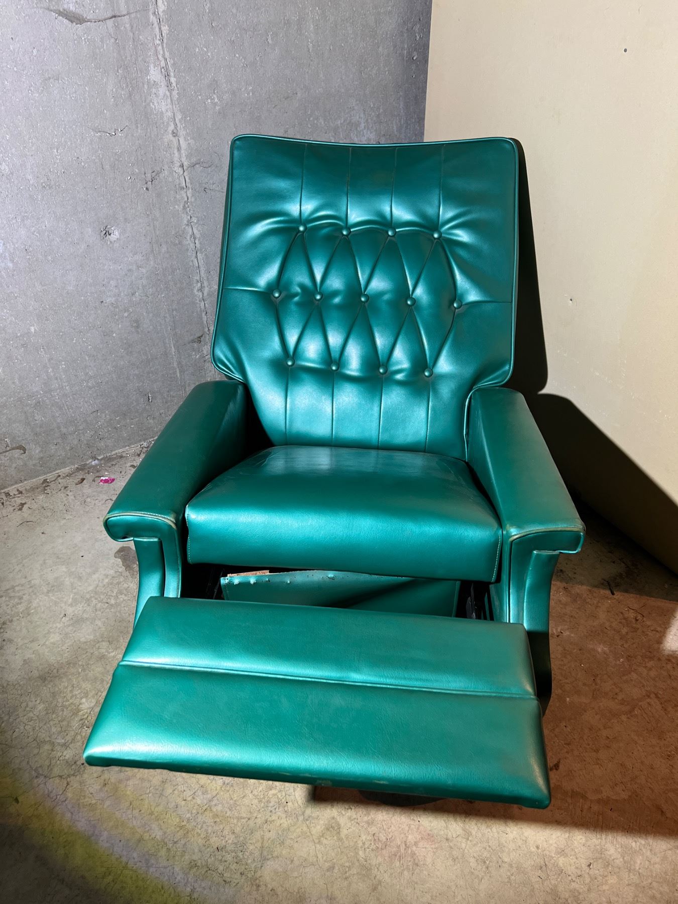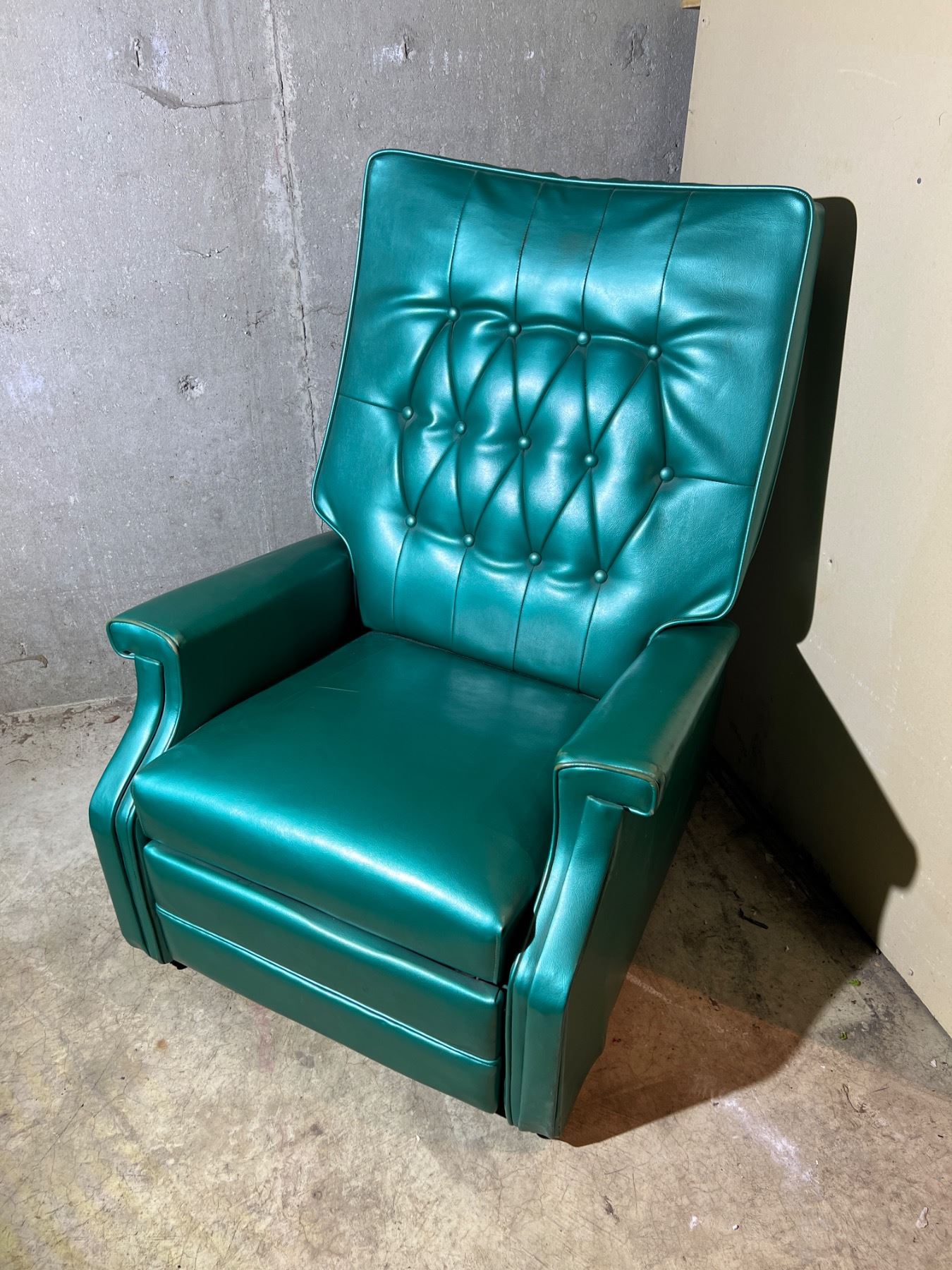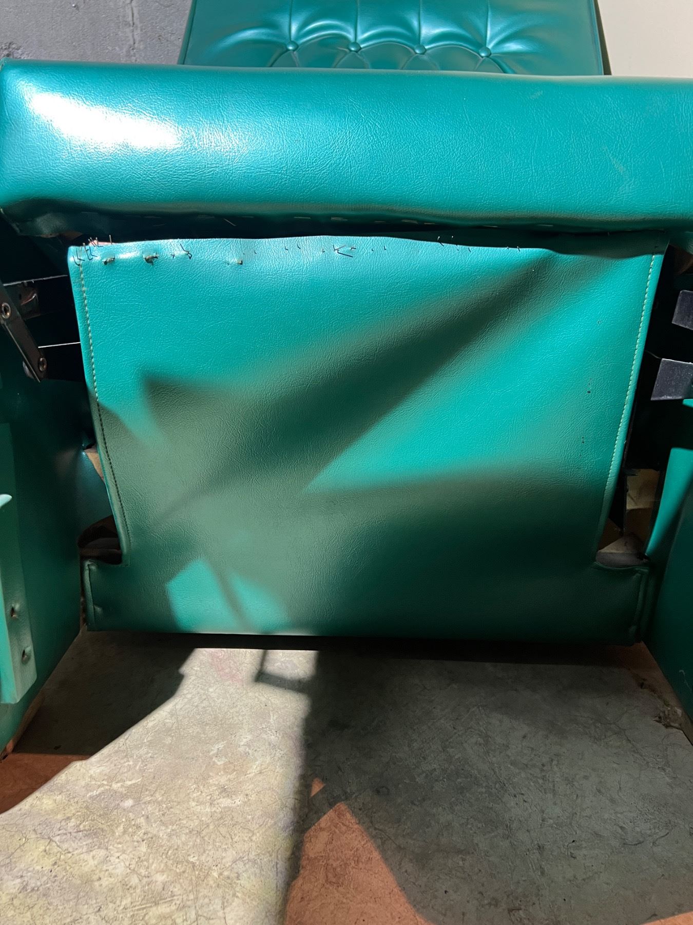 Measures 42" tall by 32" by 31". Deep turquoise colour that really pops. Cracks in seat, underneath recliner panel has begun to let go (staples) and there is some wear on the arms.