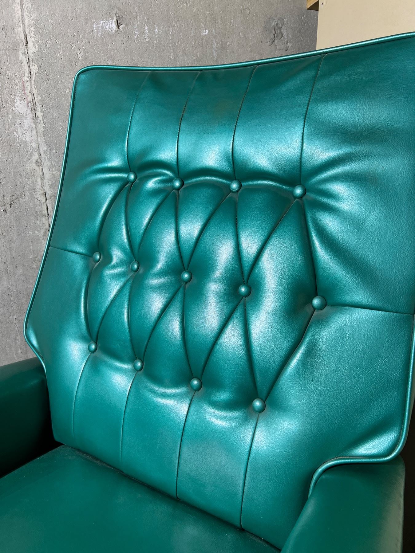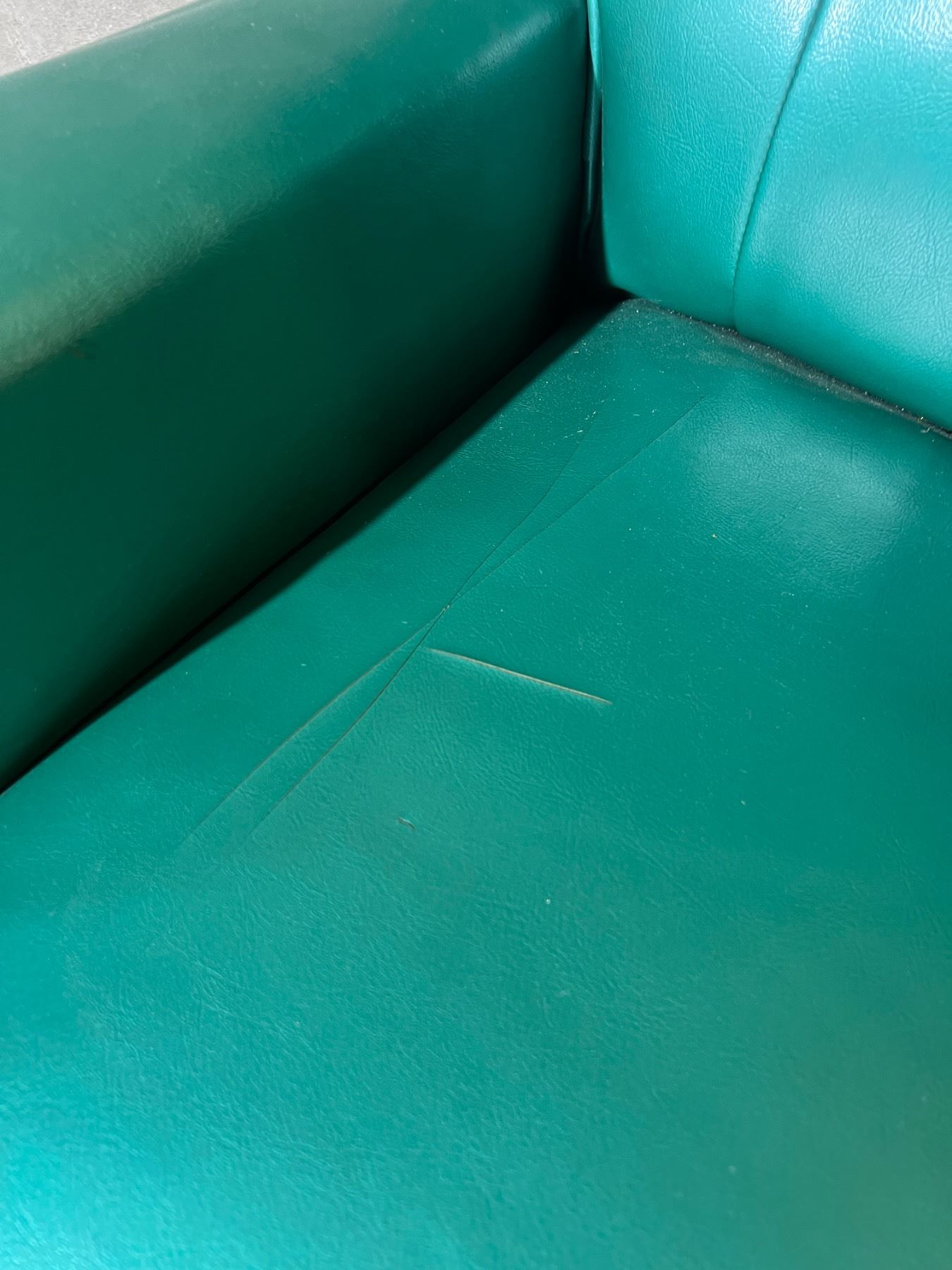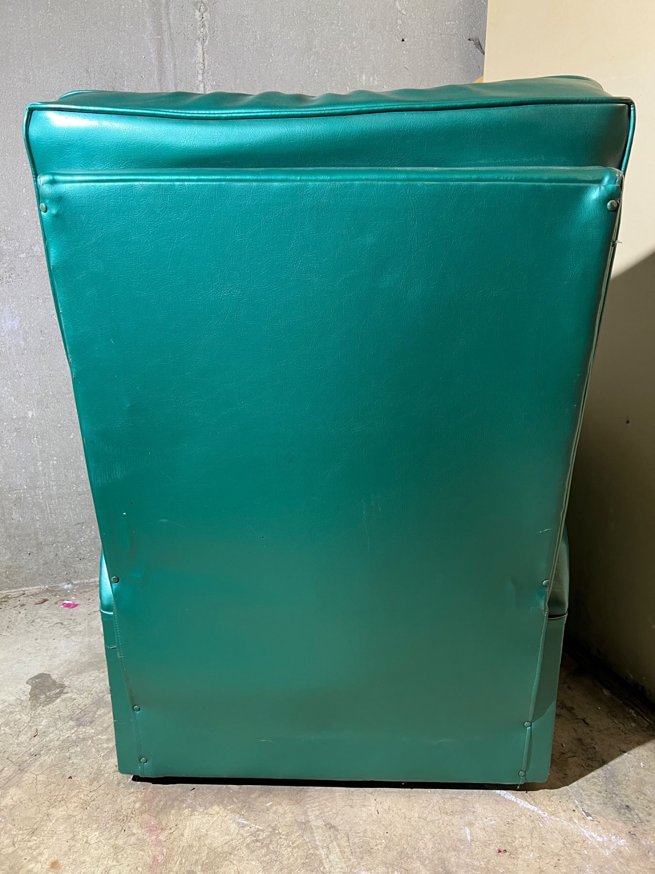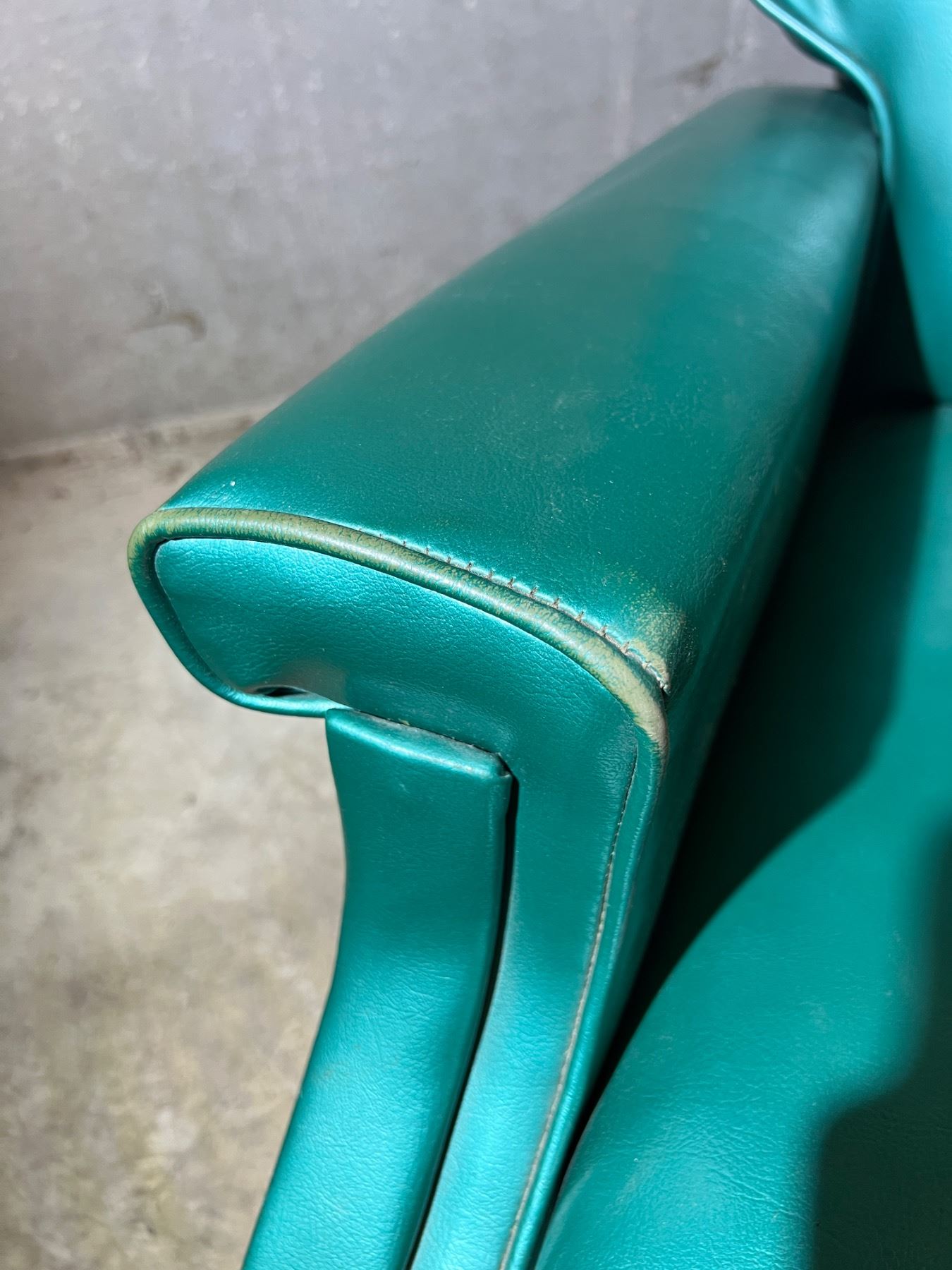 Measures 42" tall by 32" by 31". Deep turquoise colour that really pops. Cracks in seat, underneath recliner panel has begun to let go (staples) and there is some wear on the arms.
