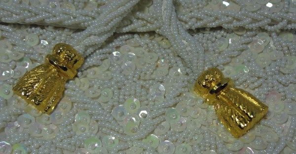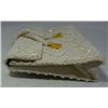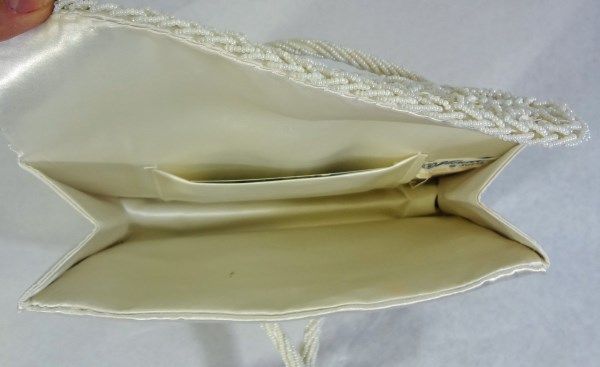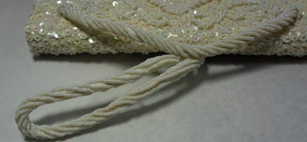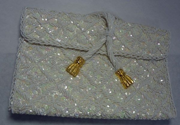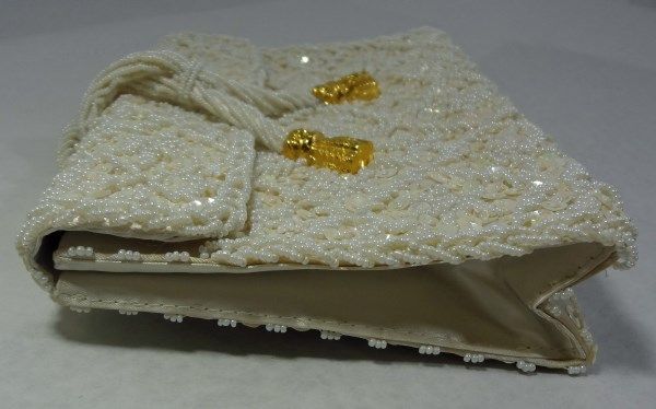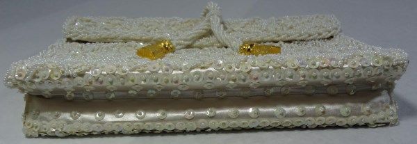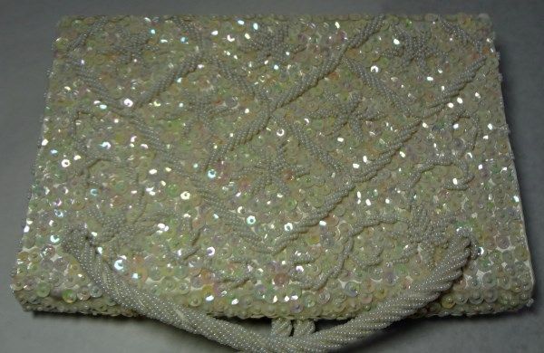 5 1/2" tall x 8 1/2" wide. White sequins with Italian seeds. Has a wrist handle and comes with original box. Beautiful little handbag!