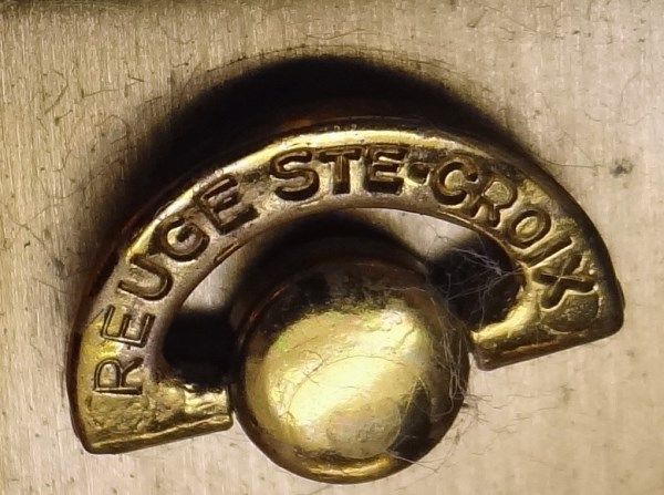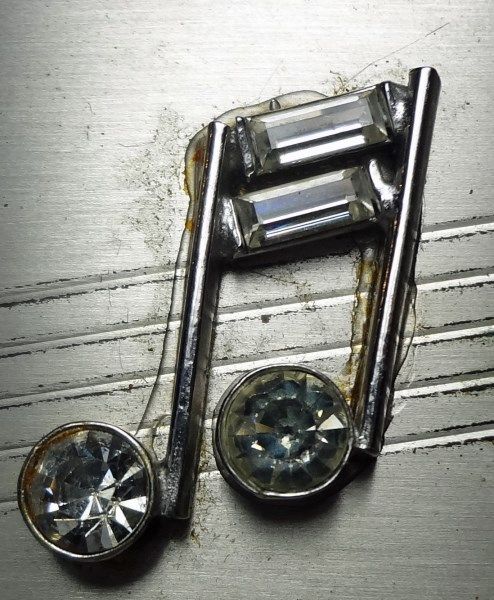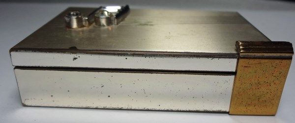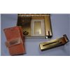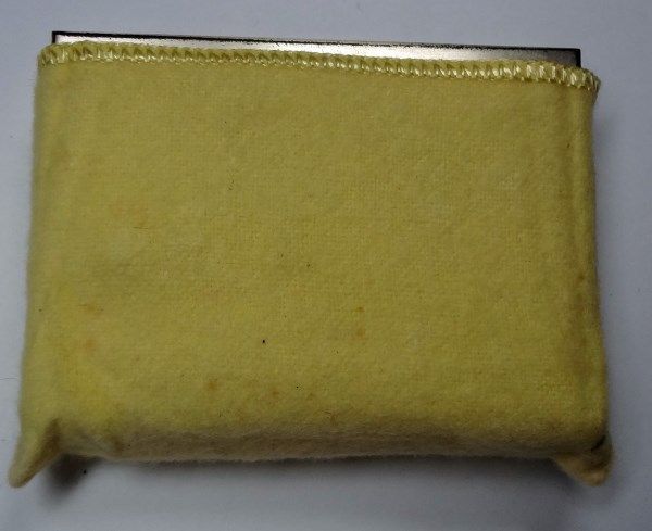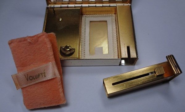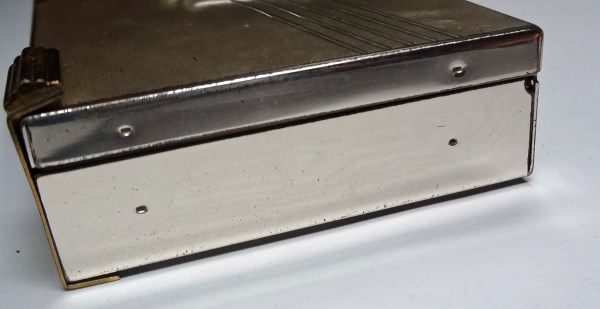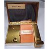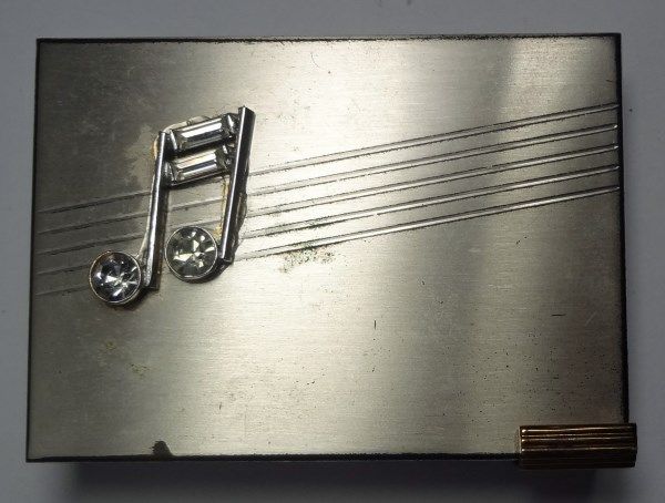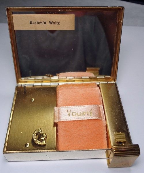 Compact opens up and is also a music box that plays Brahm's Waltz. In original box and felt envelope. Never used, although surface of box shows minor scuffing due to age. 3 1/4" x 2 1/4" Est value $75.00