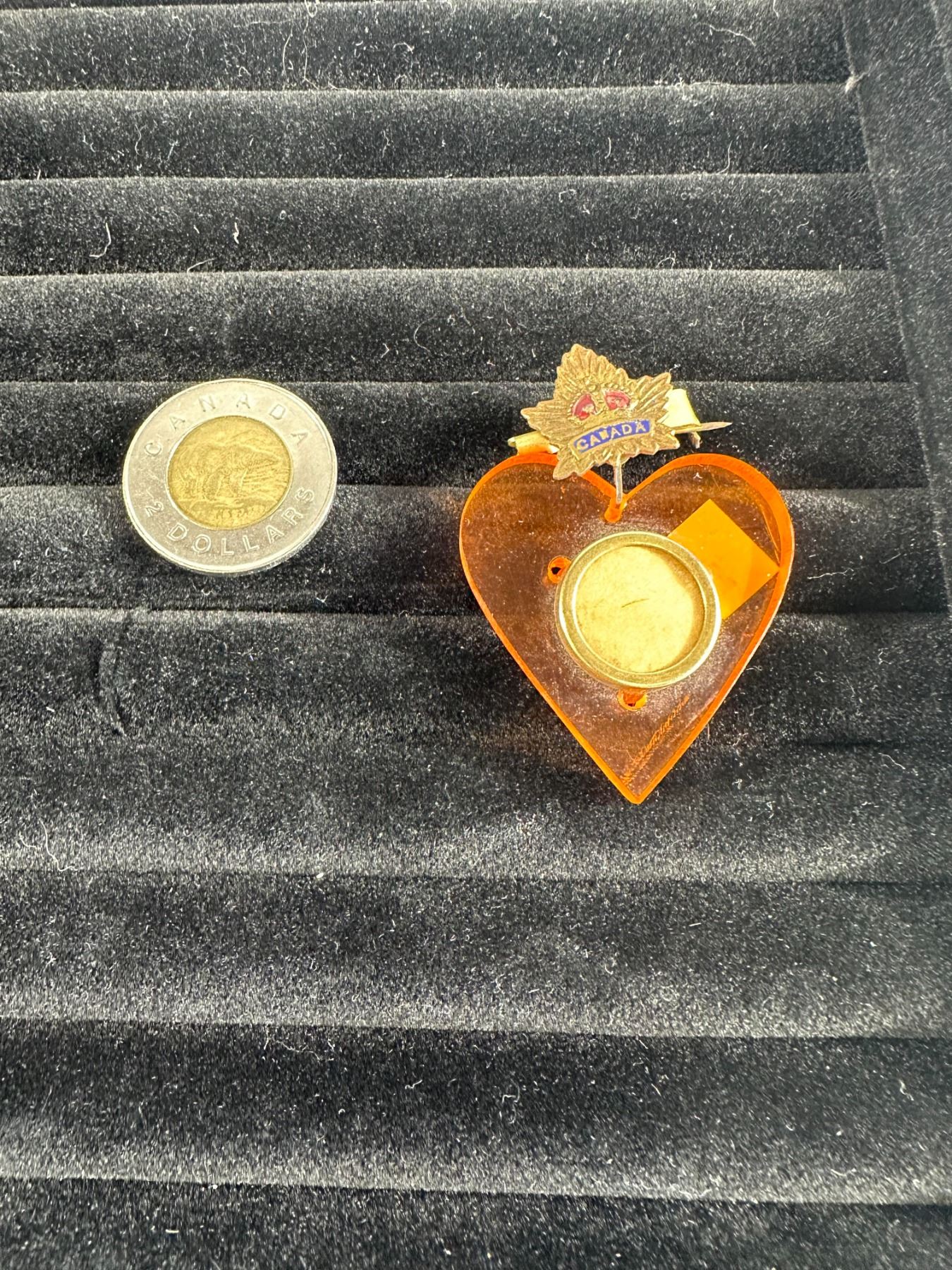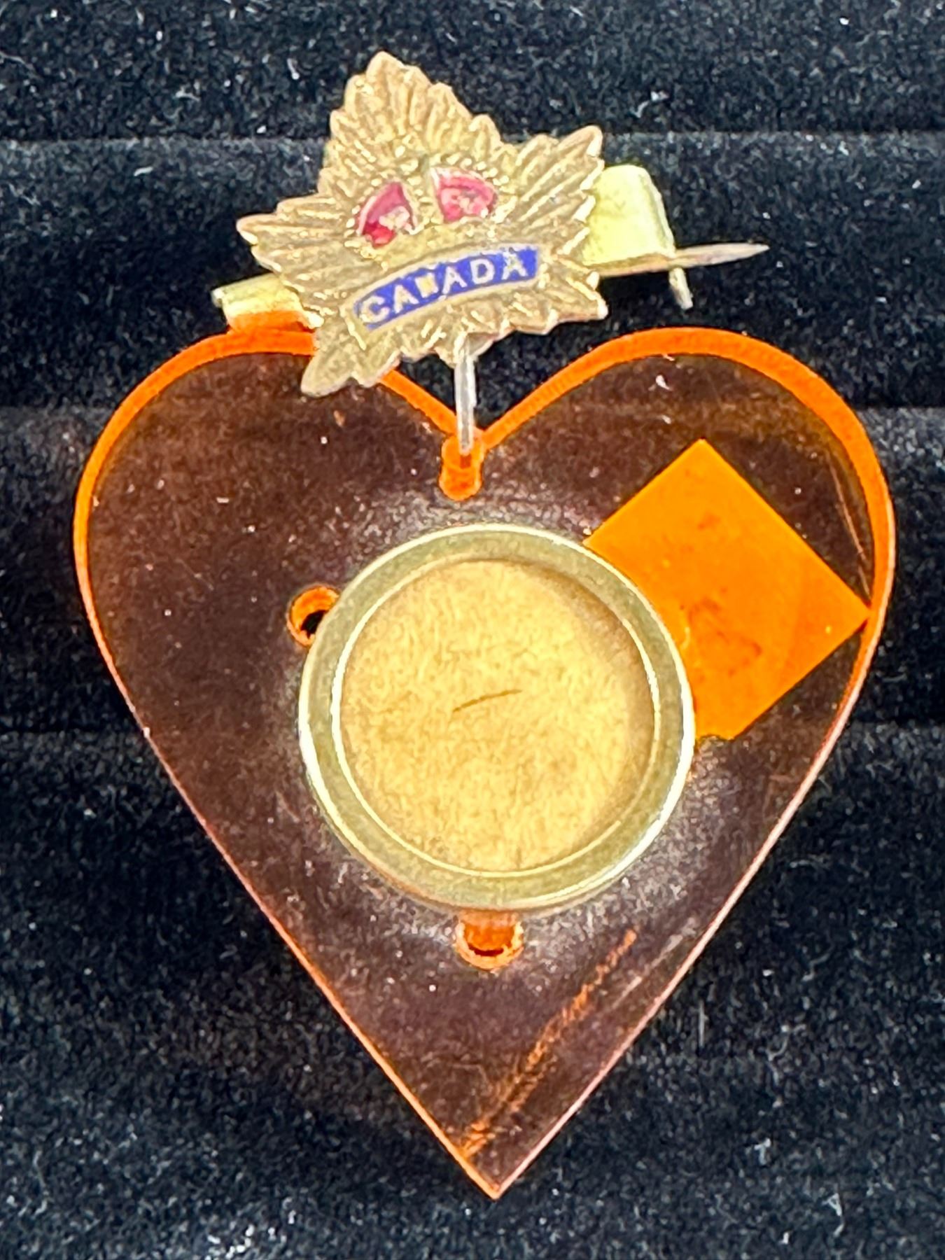 Charming WWII era sweetheart pin featuring a translucent amber acrylic heart, mounted with a Canadian military crest adorned with enamel red and blue details and a small soldier's hat accent. The circular frame at center was likely meant to hold a photo of a loved one. Circa 1940s. Condition: Light surface wear and mild discoloration.