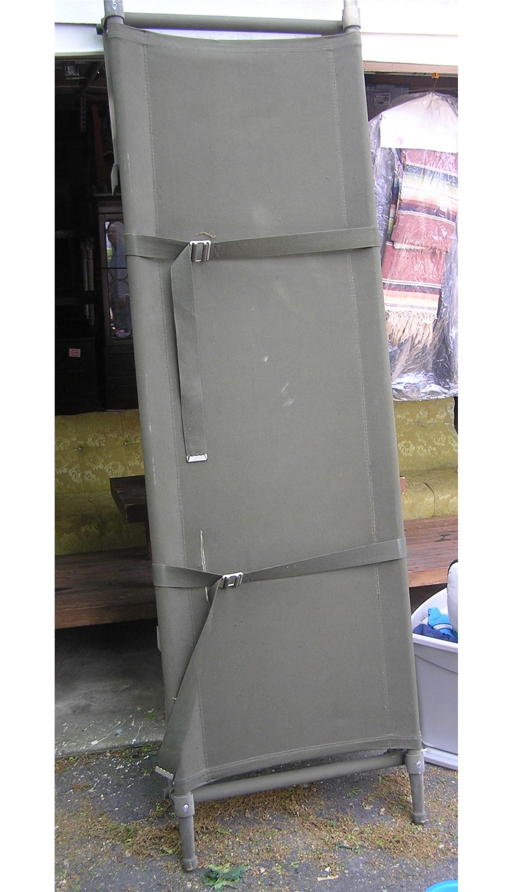 Vintage WWII military field stretcher 25 1/2 wide by 90 inches long, has a small 6 inch tear in lower canvas but is repairable, otherwise excellent with original straps est. value $250.00-$300.00