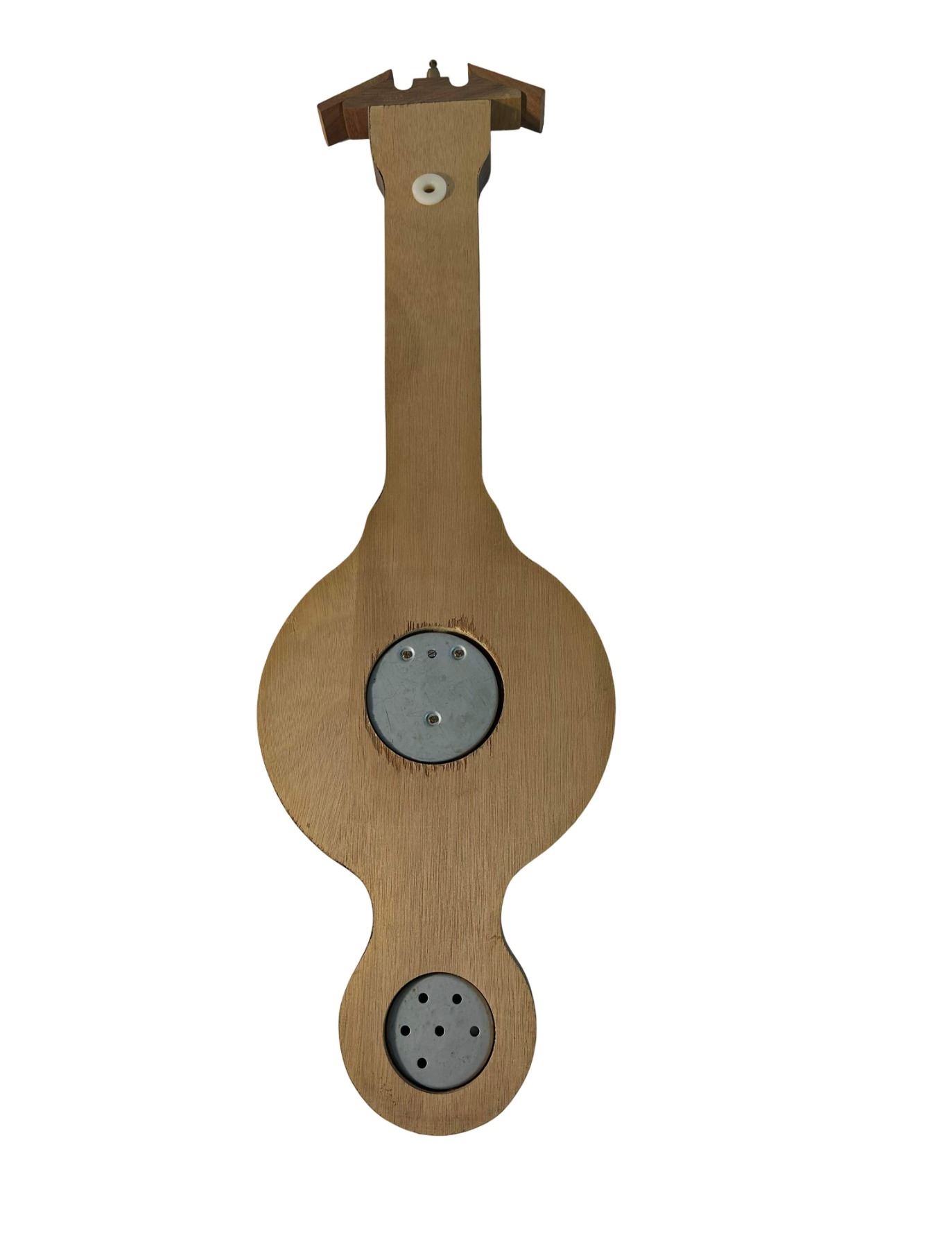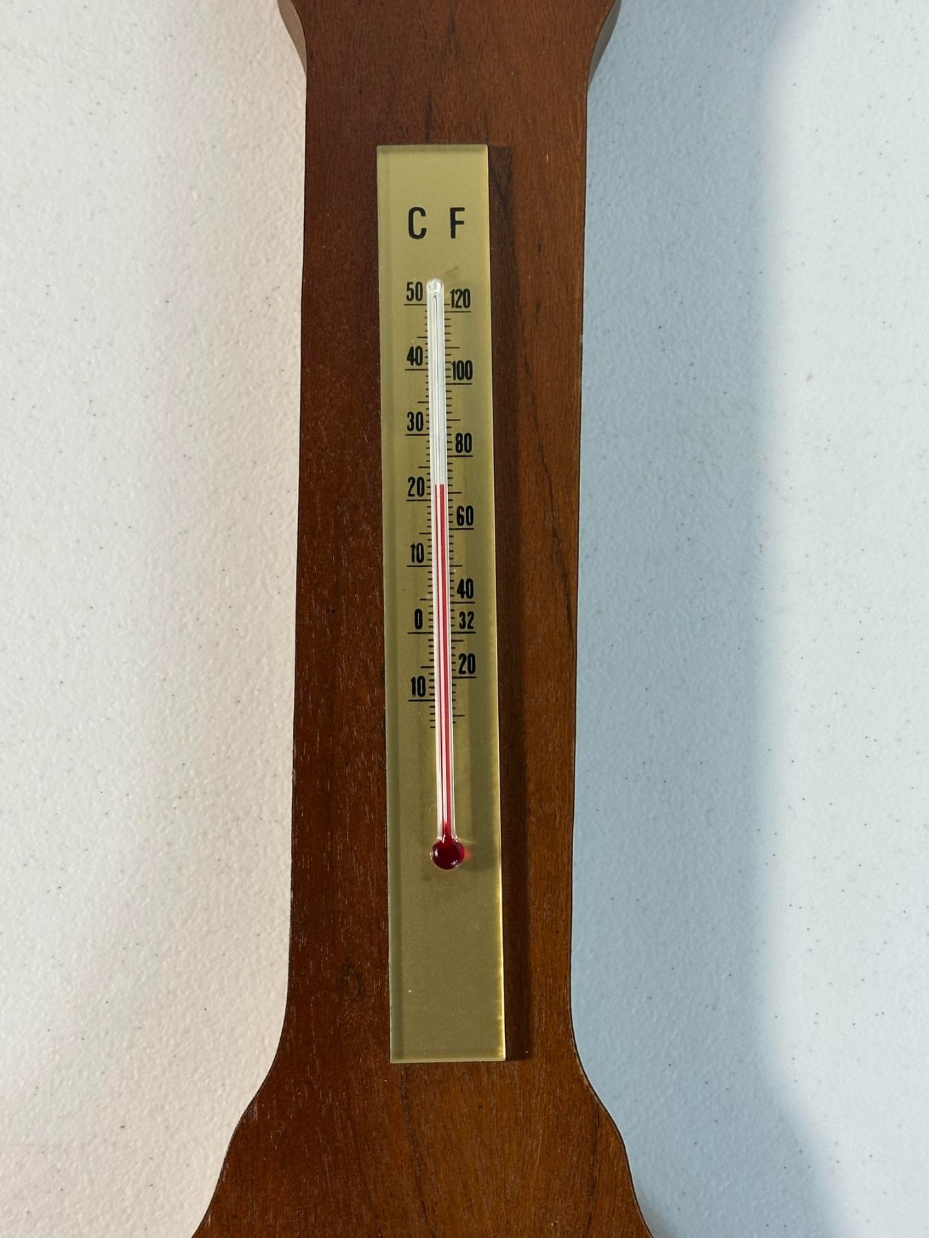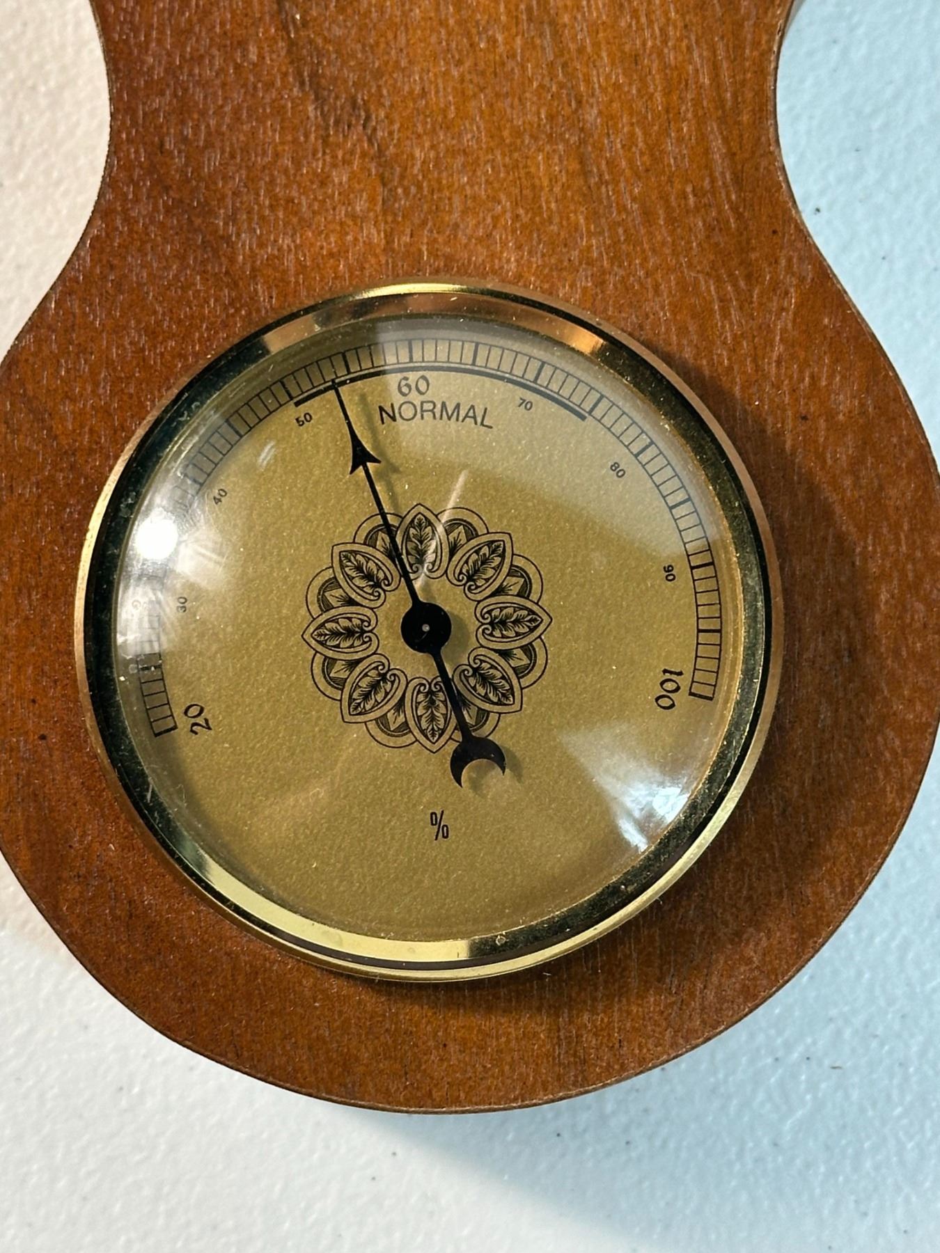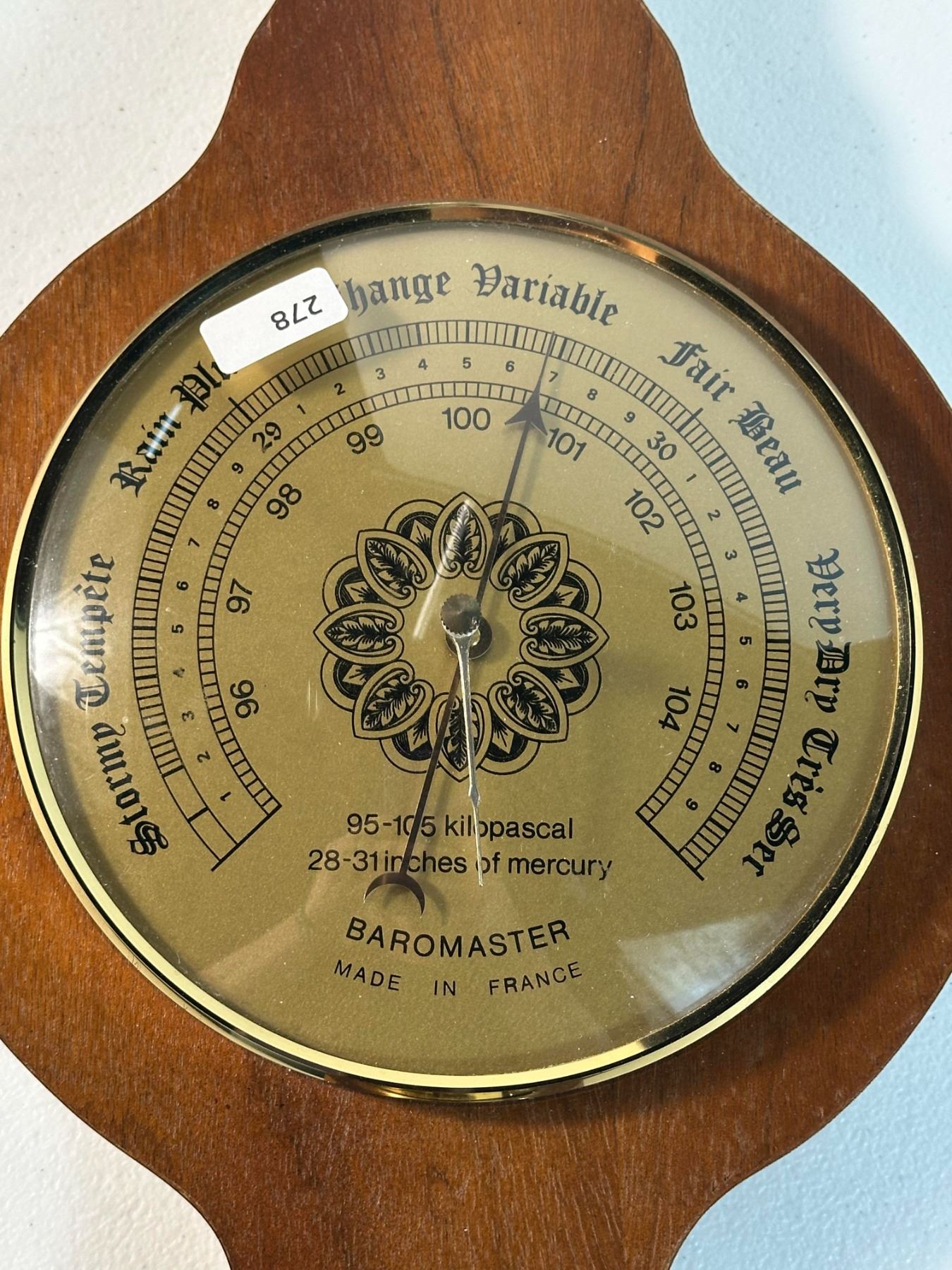 Wooden wall-mounted weather station featuring three instruments: a thermometer (C/F scale), a central brass barometer marked 'Baromaster – Made in France,' and a hygrometer at the base. Decorative brass dial with weather notations including 'Stormy, Rain, Change, Fair.' Classic vintage design for home or office use.