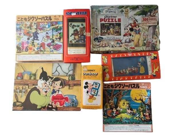 Vintage Walt Disney puzzles. Includes a 300 piece jigsaw puzzle of Snow White and the Seven Dwarfs, a springbok children’s jigsaw puzzle with 48 interlocking pieces. Puzzle is 12“ x 17“. Two small boxes of Japanese Disney paint by numbers, and one box of Disney dominoes. All in vintage condition. One Japanese puzzle and the Pinocchio puzzle are still wrapped in shrink wrap.