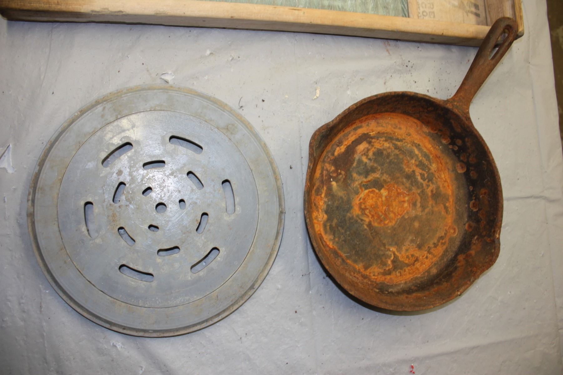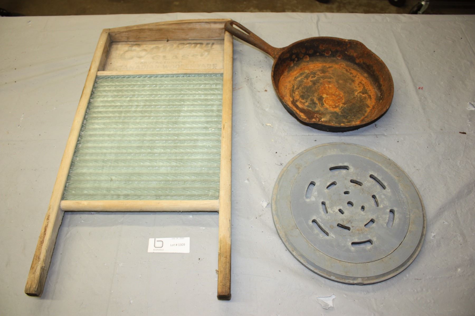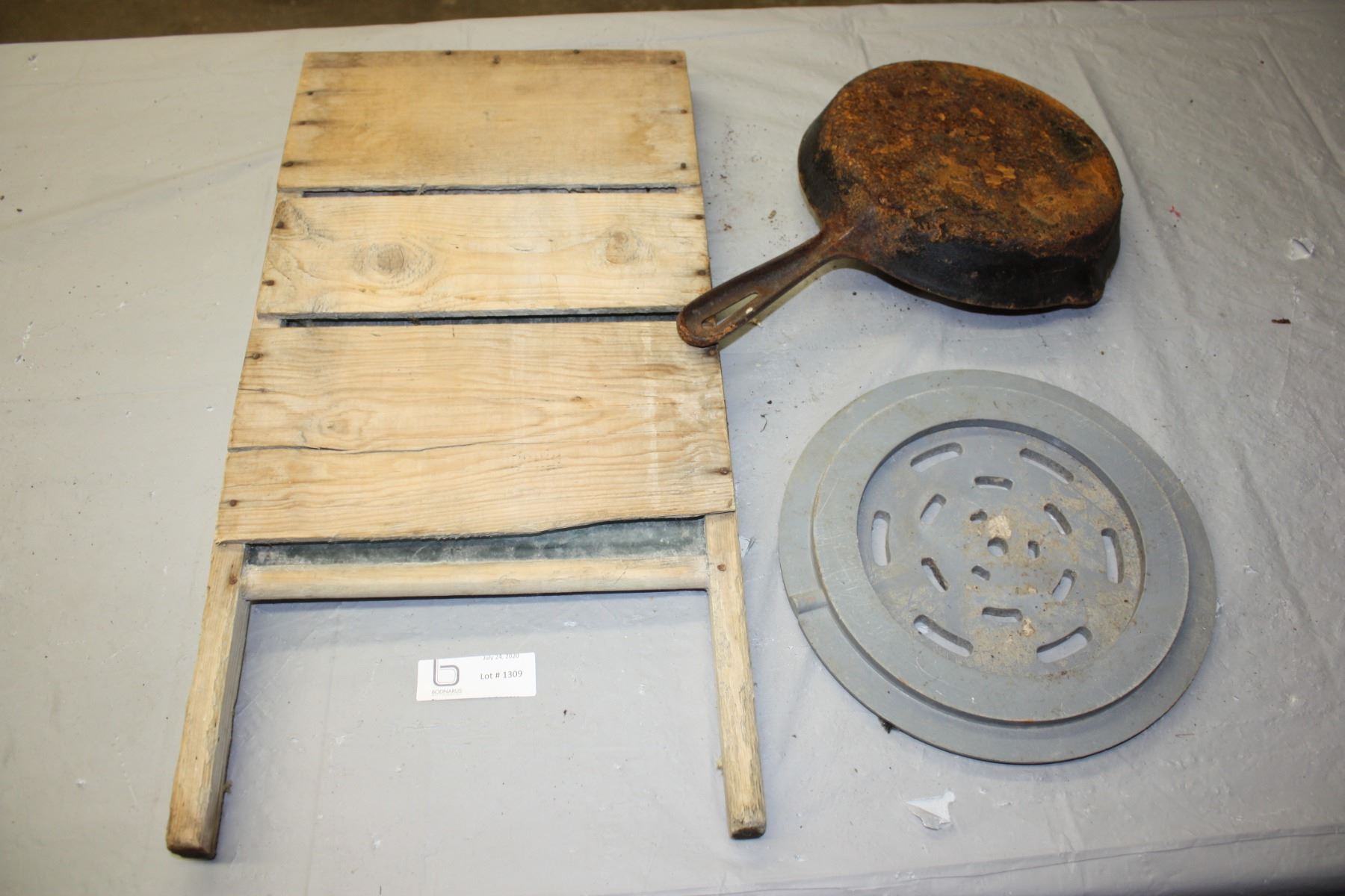 Vintage Washboard, Cast Iron Skillet and Drain Cover