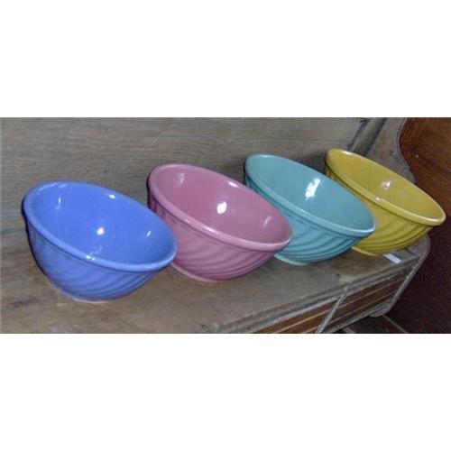 This Watt pottery mixing bowl set of four graduated mixing bowls in the Swirl pattern is hard to find! This set was manufactured between the 1940s and 1950s. The bowls are graduated in size (#6, #7, #8, and #9) and vary in glaze color (blue, pink, turquoise, and yellow). There are some glaze skips and surface flaws characteristic of Watt Pottery: the blue bowl has a spot of missed color, the turquoise bowl has a black spot in the interior, and the yellow bowl has crazing in a line beneath the glaze. On the bottom of each bowl is marked in script "Oven Ware USA/Watt (bowl size number)."<p>
